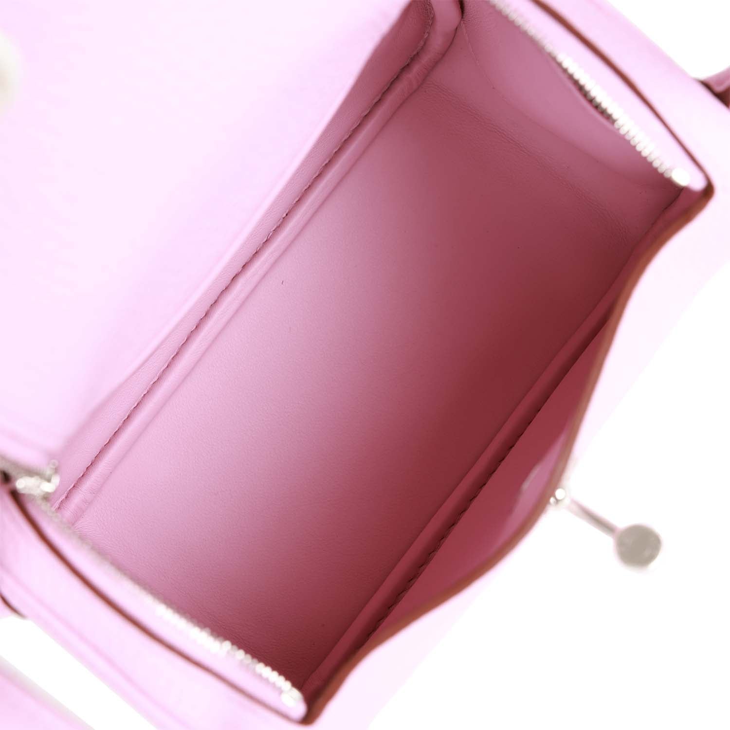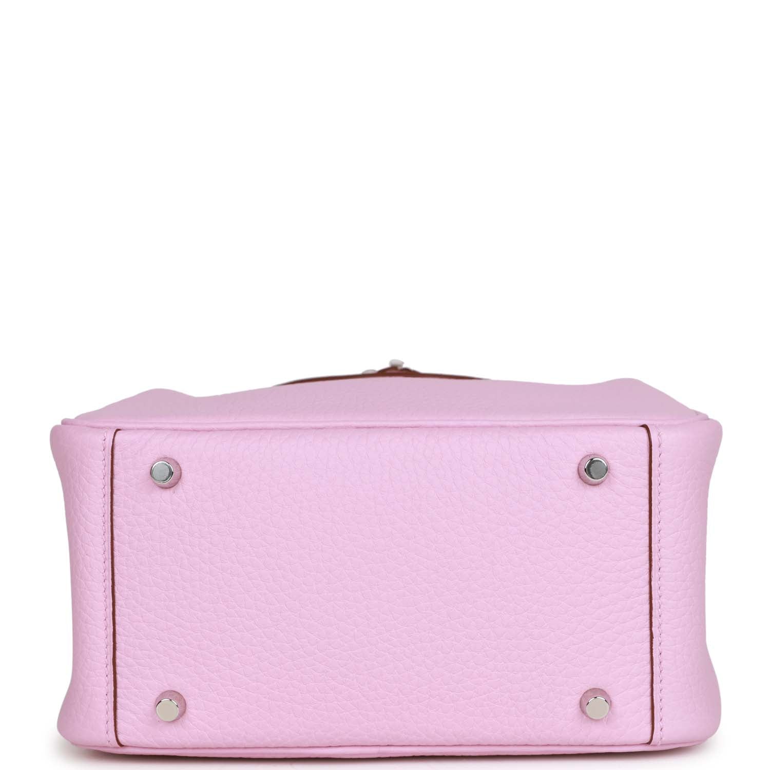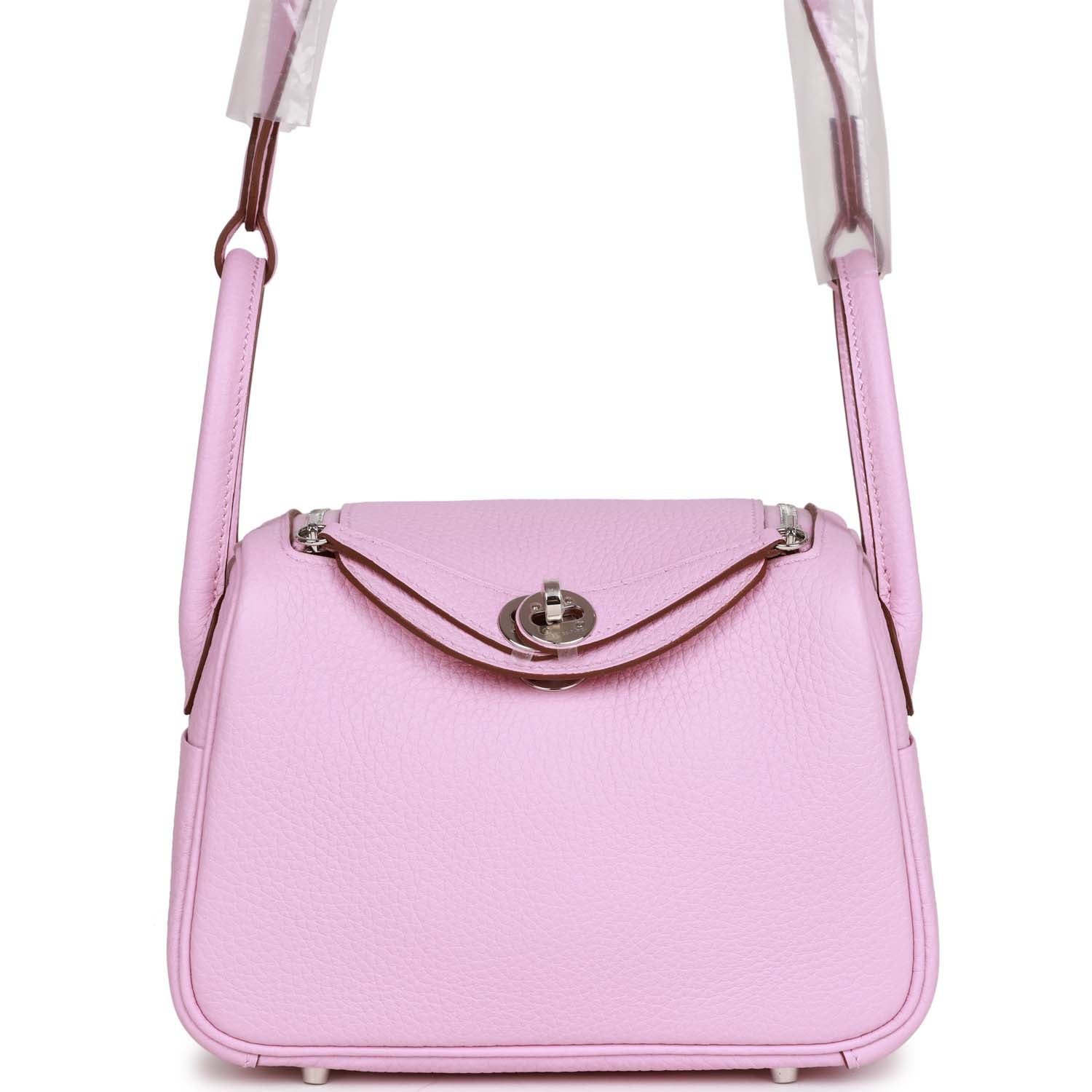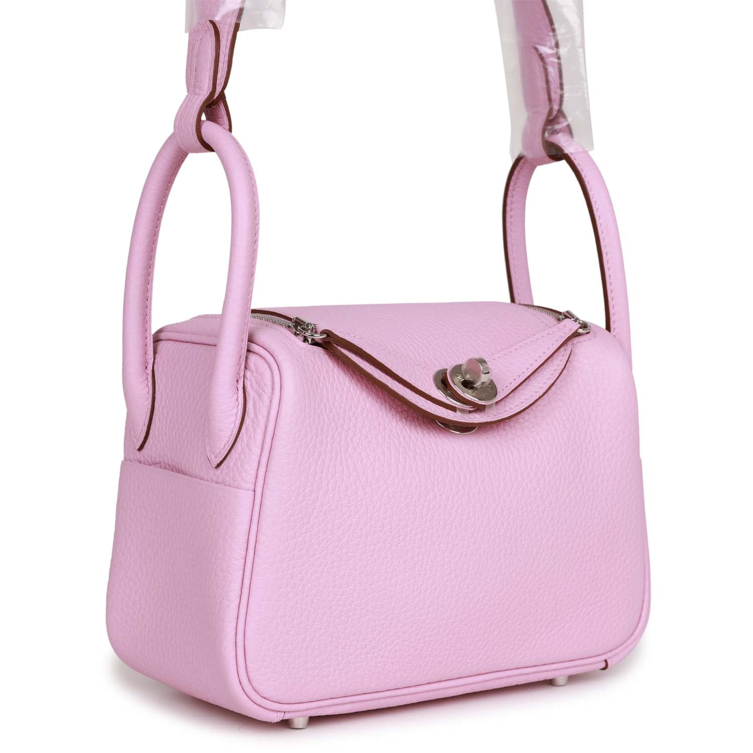 This Mini Lindy is in Mauve Sylvestre clemence leather with palladium hardware and has tonal stitching, double zipper pulls, front Hermès twist lock, single pocket on each side, two rolled top handles linked by a flat shoulder strap.