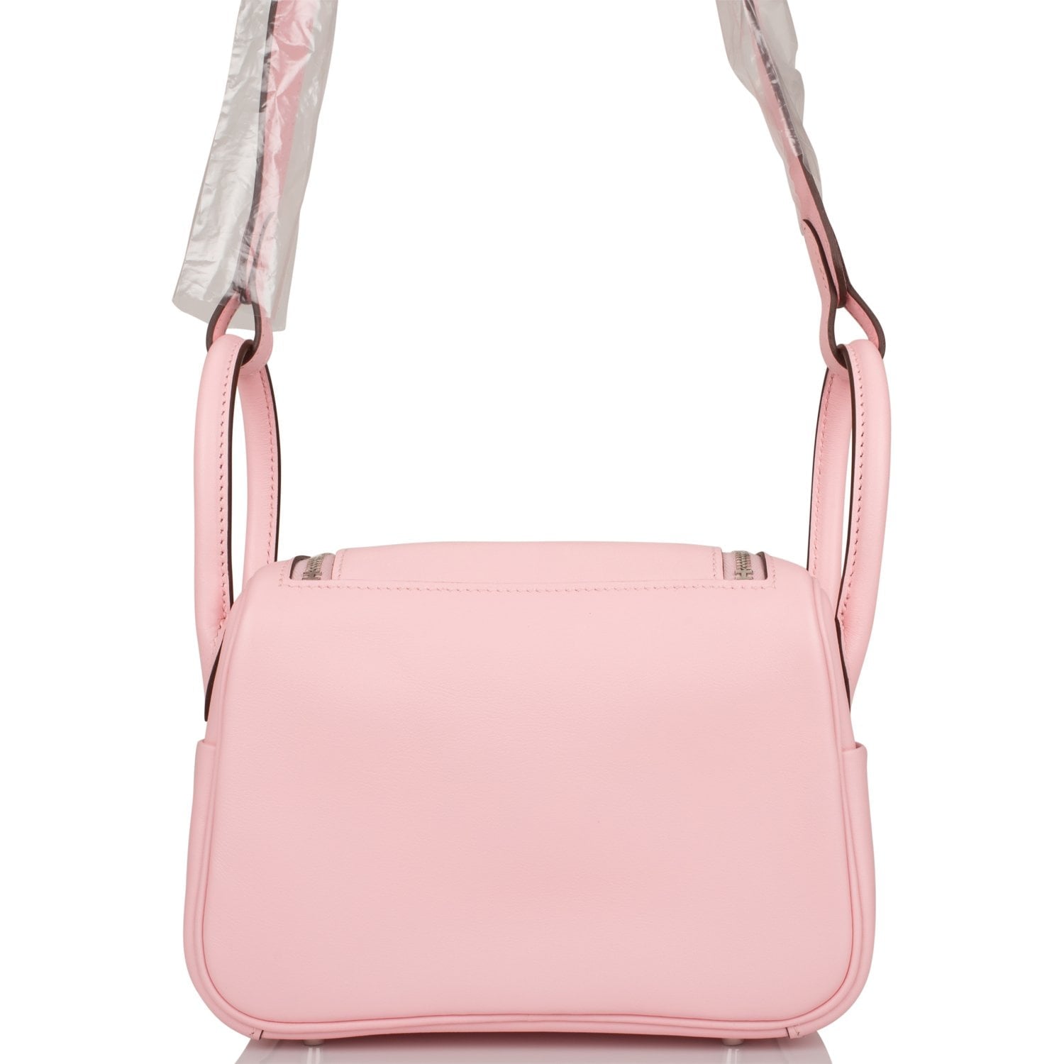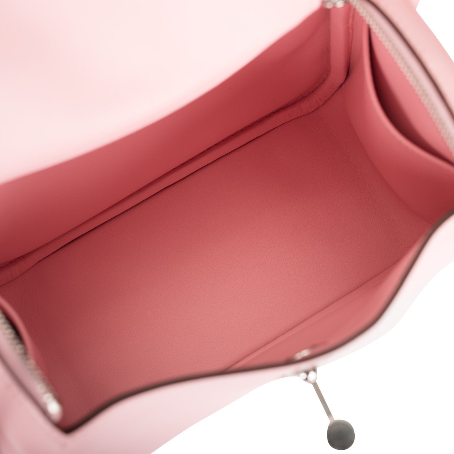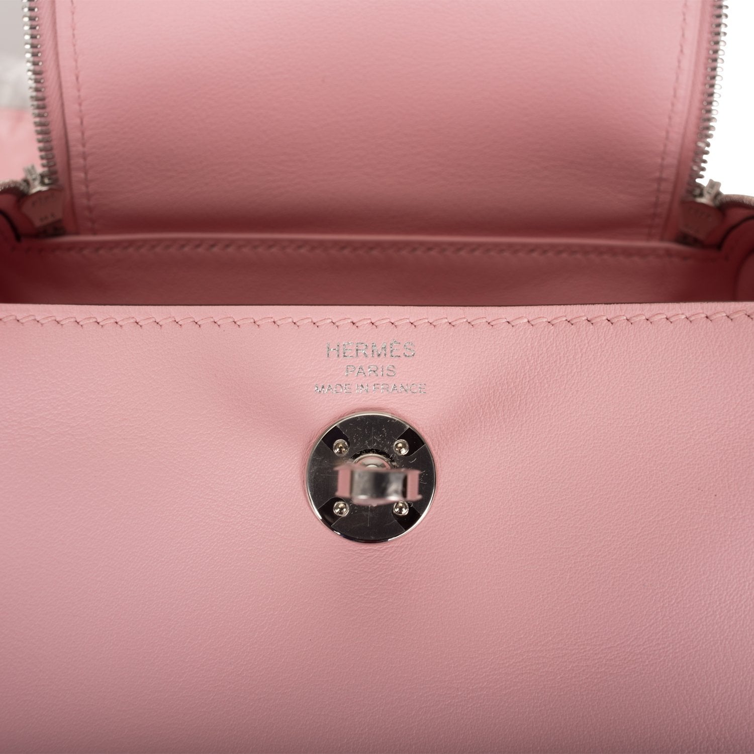 This Mini Lindy is in Rose Sakura swift leather with palladium hardware and has tonal stitching, double zipper pulls, front Hermès twist lock, single pocket on each side, two rolled top handles linked by a flat shoulder strap.