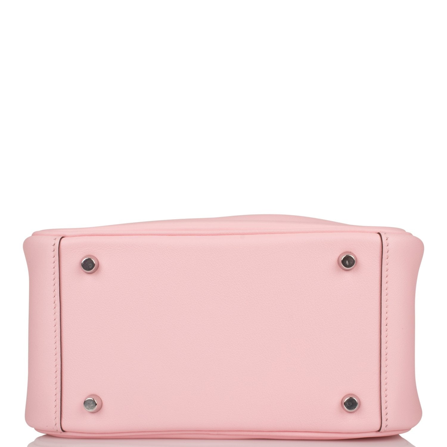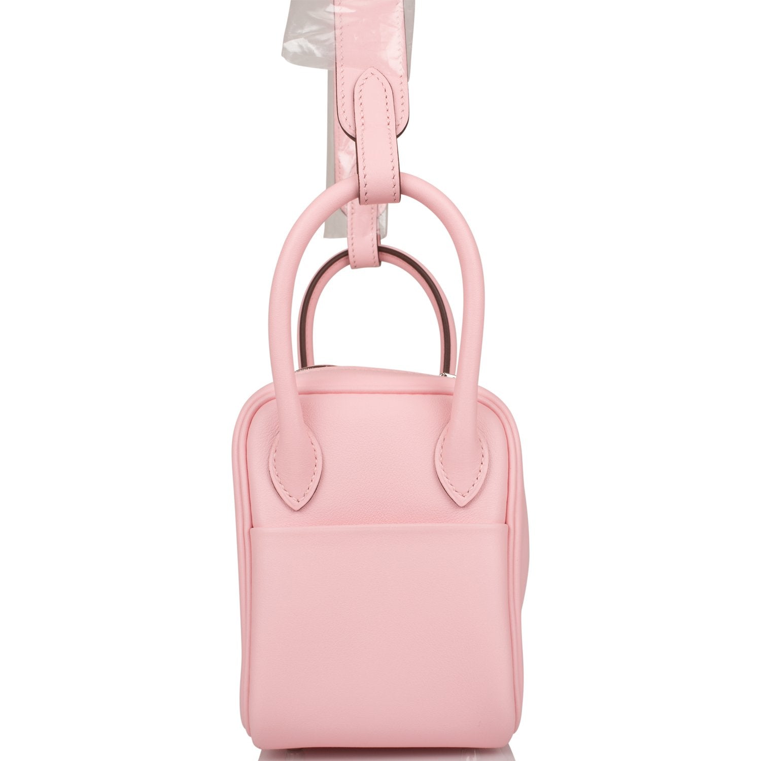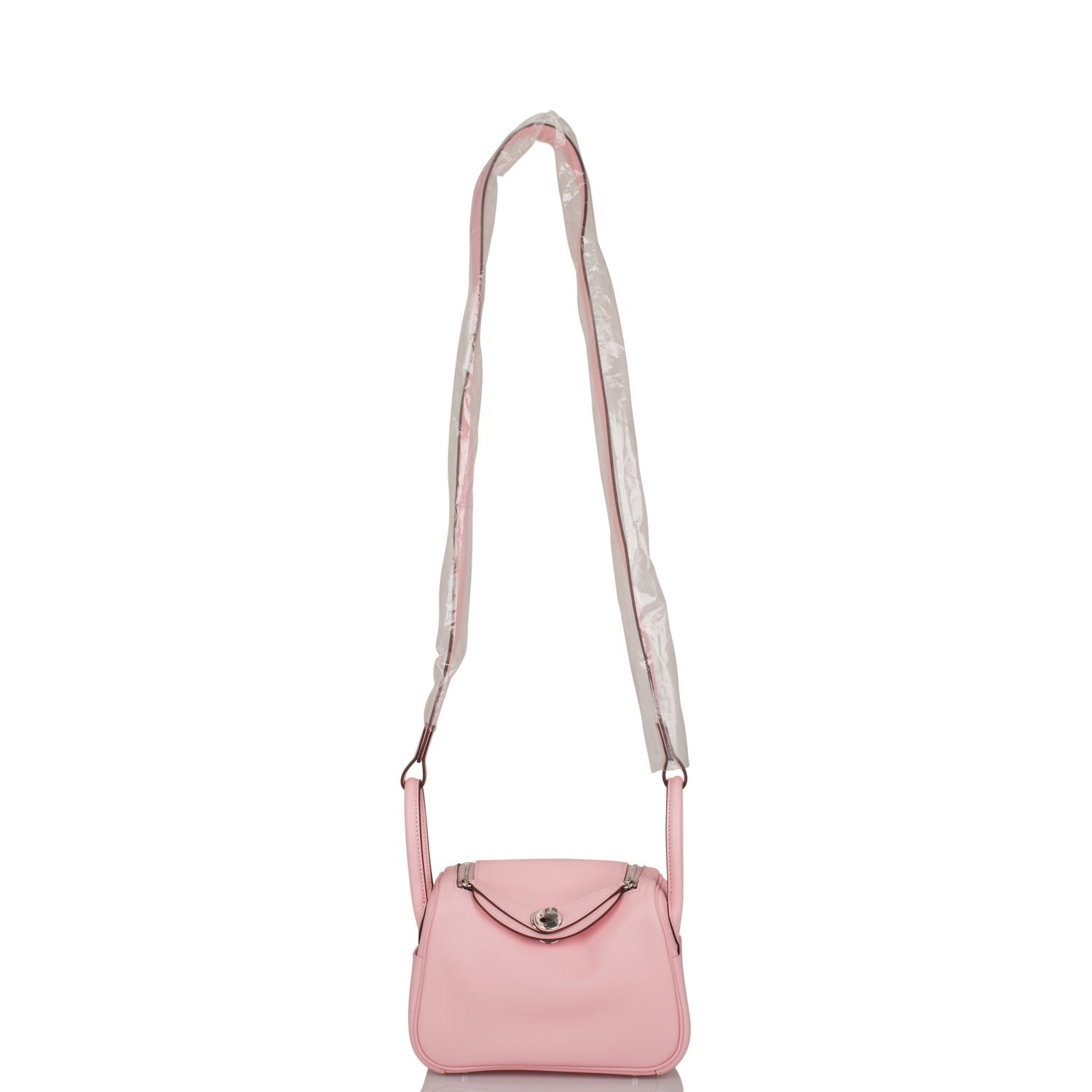 This Mini Lindy is in Rose Sakura swift leather with palladium hardware and has tonal stitching, double zipper pulls, front Hermès twist lock, single pocket on each side, two rolled top handles linked by a flat shoulder strap.