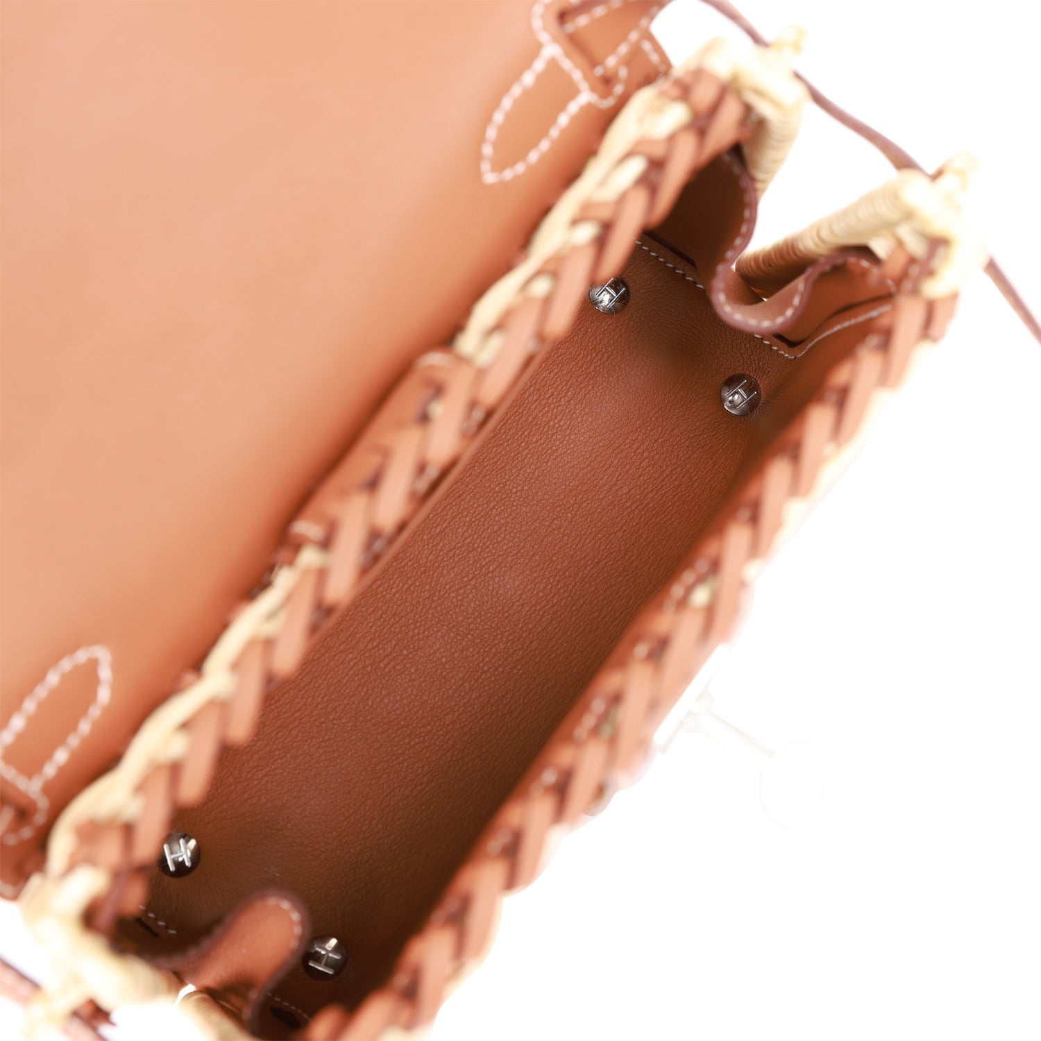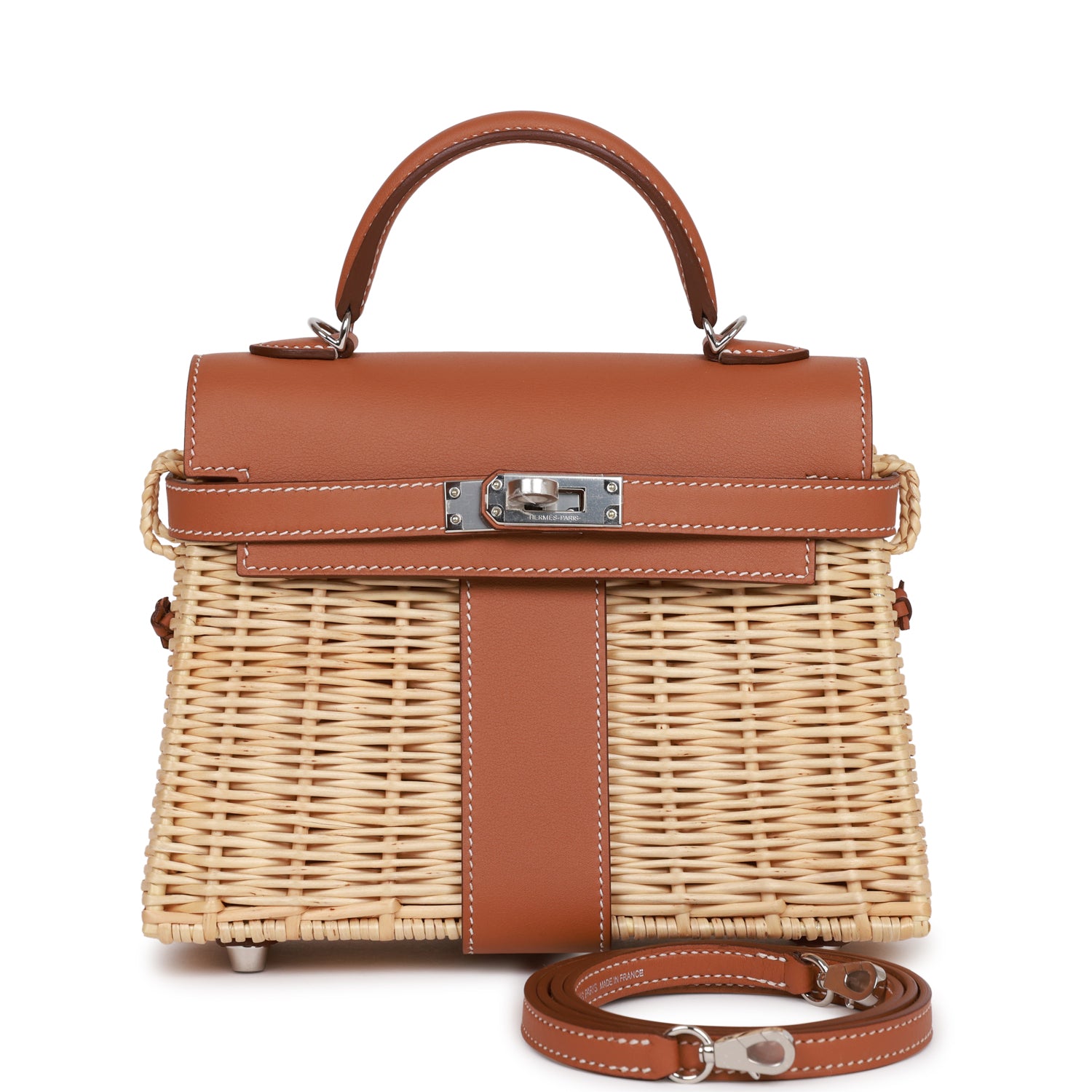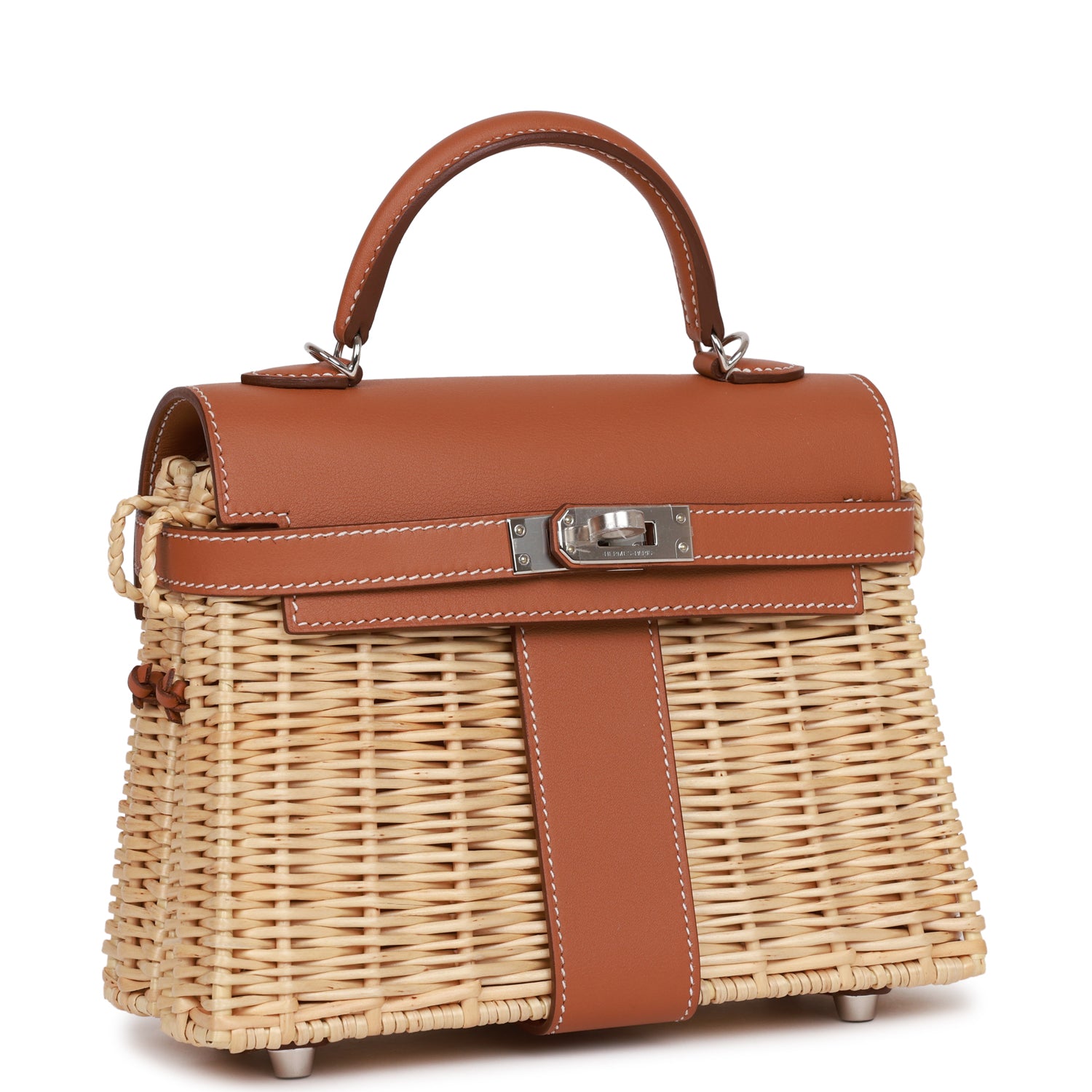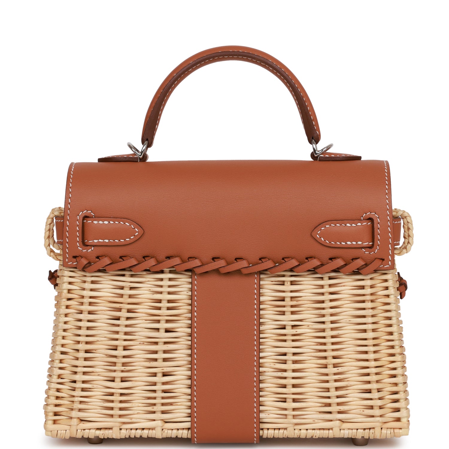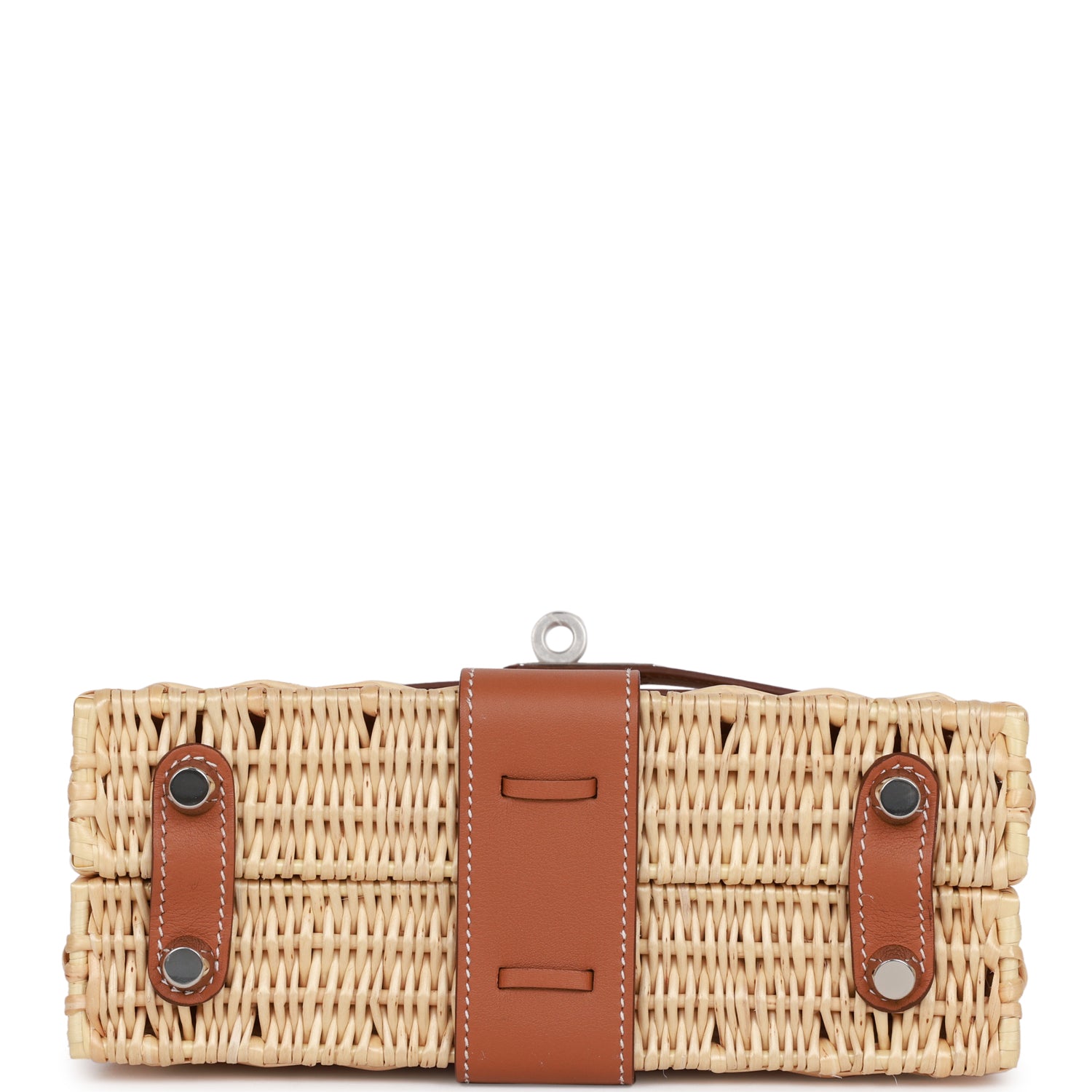 This rare Mini Picnic Kelly Bag is in Gold swift leather and Osier wicker with palladium plated hardware and has contrast stitching, two straps with toggle closure, single rolled handle and shoulder/crossbody strap.