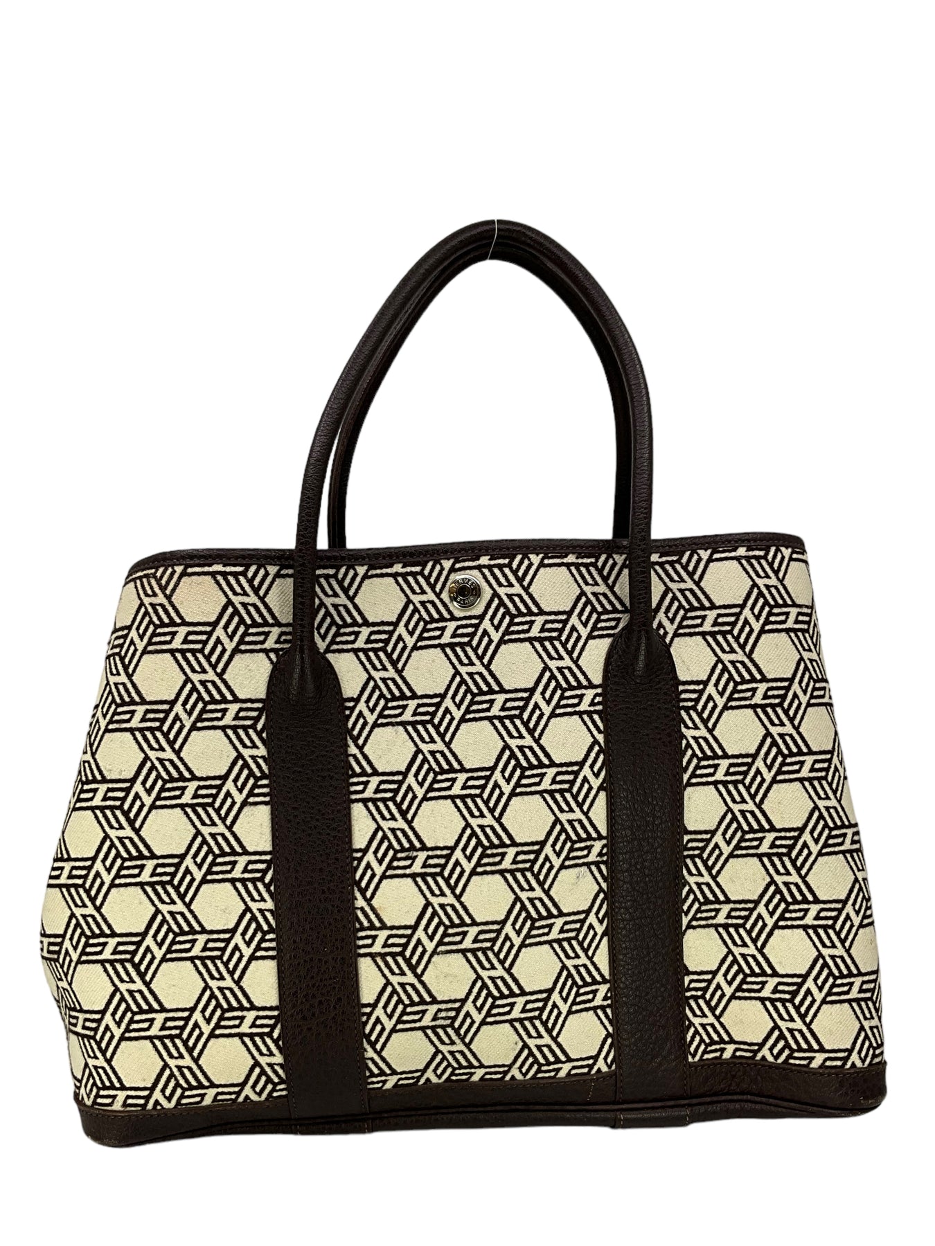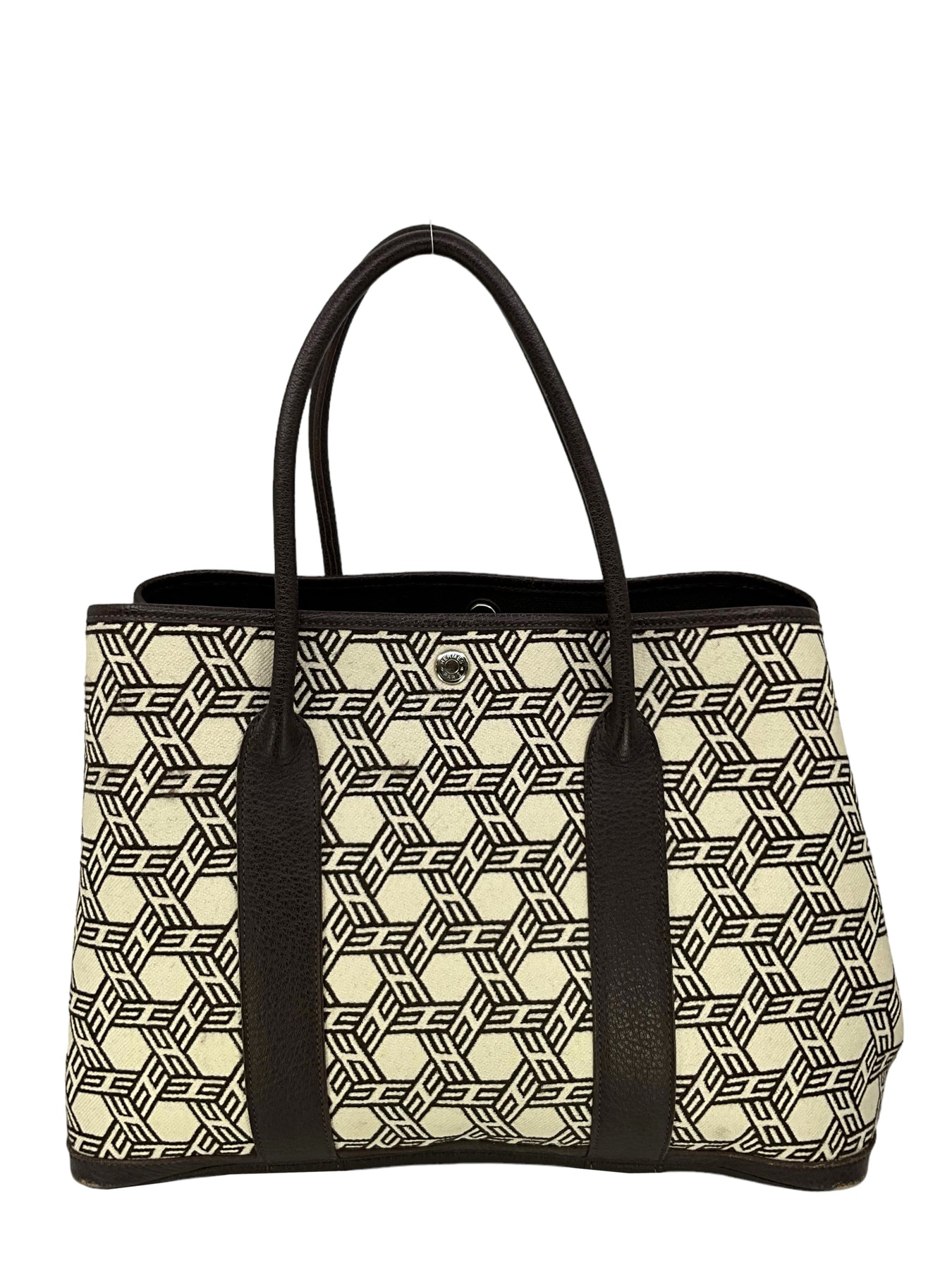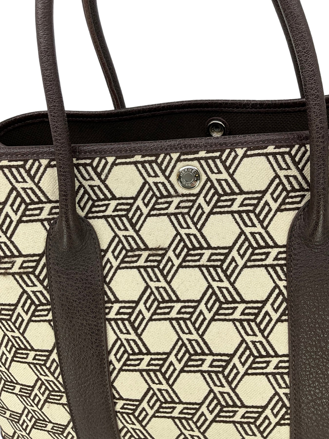 d Hermes Buffalo Leather and HERMES Mosaic Canvas Garden Party Tote Bag crafted in dark brown wool and leather with palladium metal hardware. It features dual rolled leather top handles, contrasting orange top stitching, side snaps, allowing the bag to expand for a roomier carry and a solid brown leather base. The secure snap closure opens to a bright orange canvas interior. Shop designer handbags by Hermes at Consigned Designs.