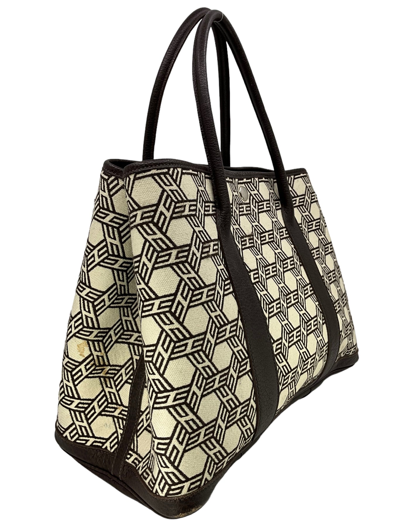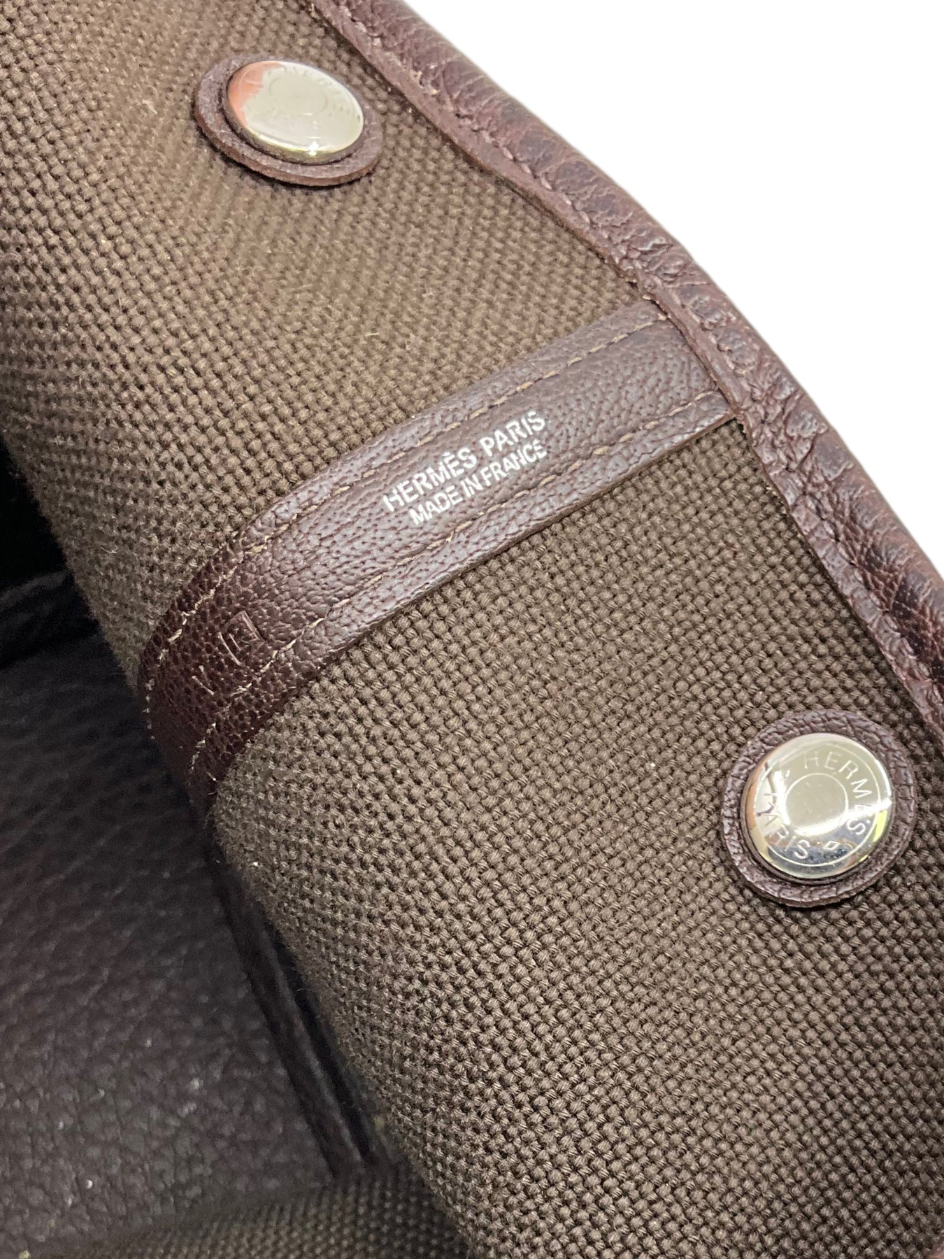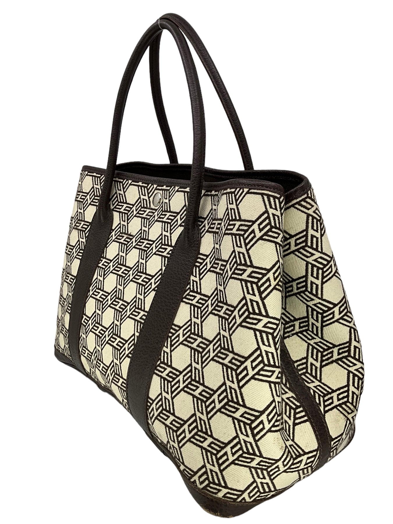 d Hermes Buffalo Leather and HERMES Mosaic Canvas Garden Party Tote Bag crafted in dark brown wool and leather with palladium metal hardware. It features dual rolled leather top handles, contrasting orange top stitching, side snaps, allowing the bag to expand for a roomier carry and a solid brown leather base. The secure snap closure opens to a bright orange canvas interior. Shop designer handbags by Hermes at Consigned Designs.