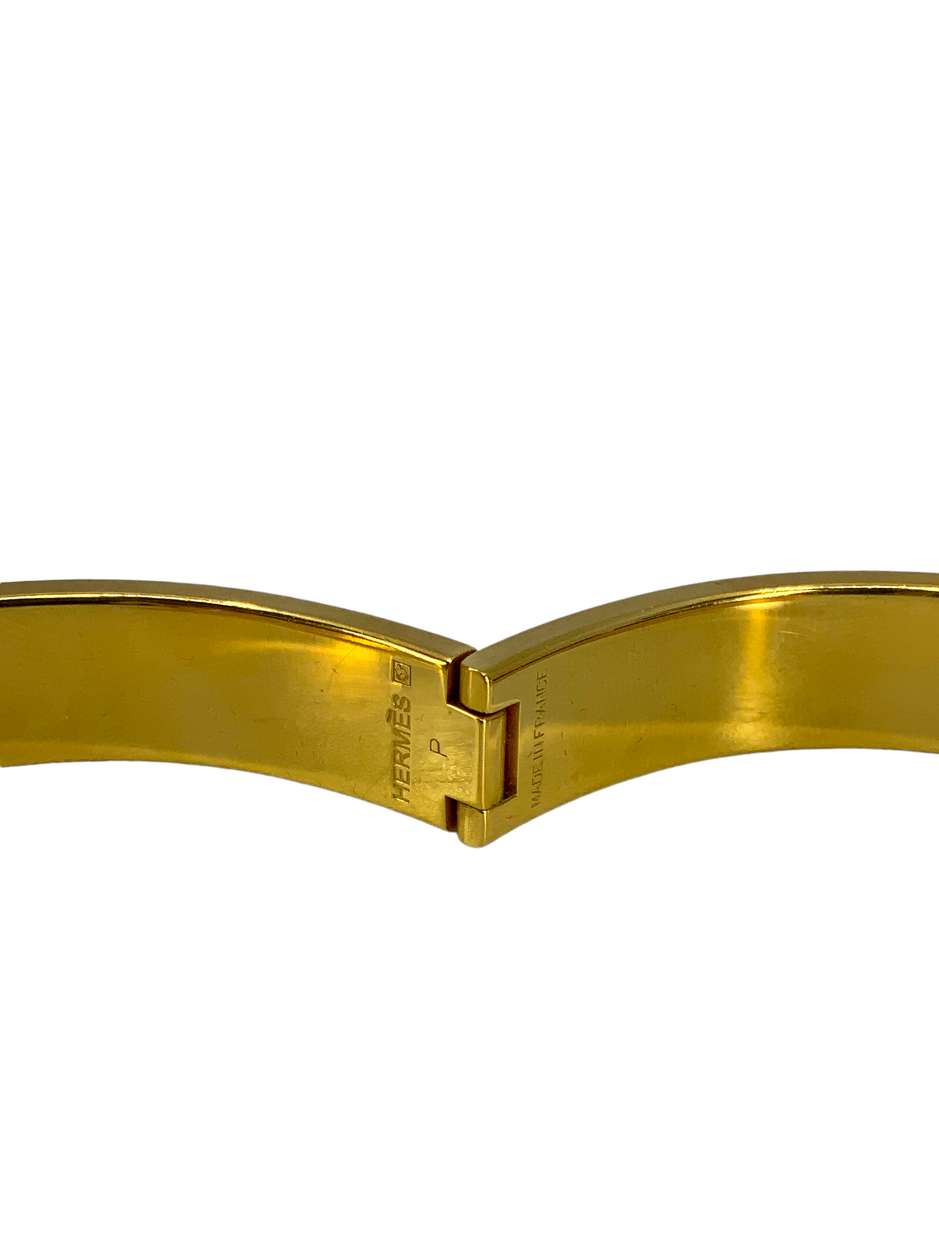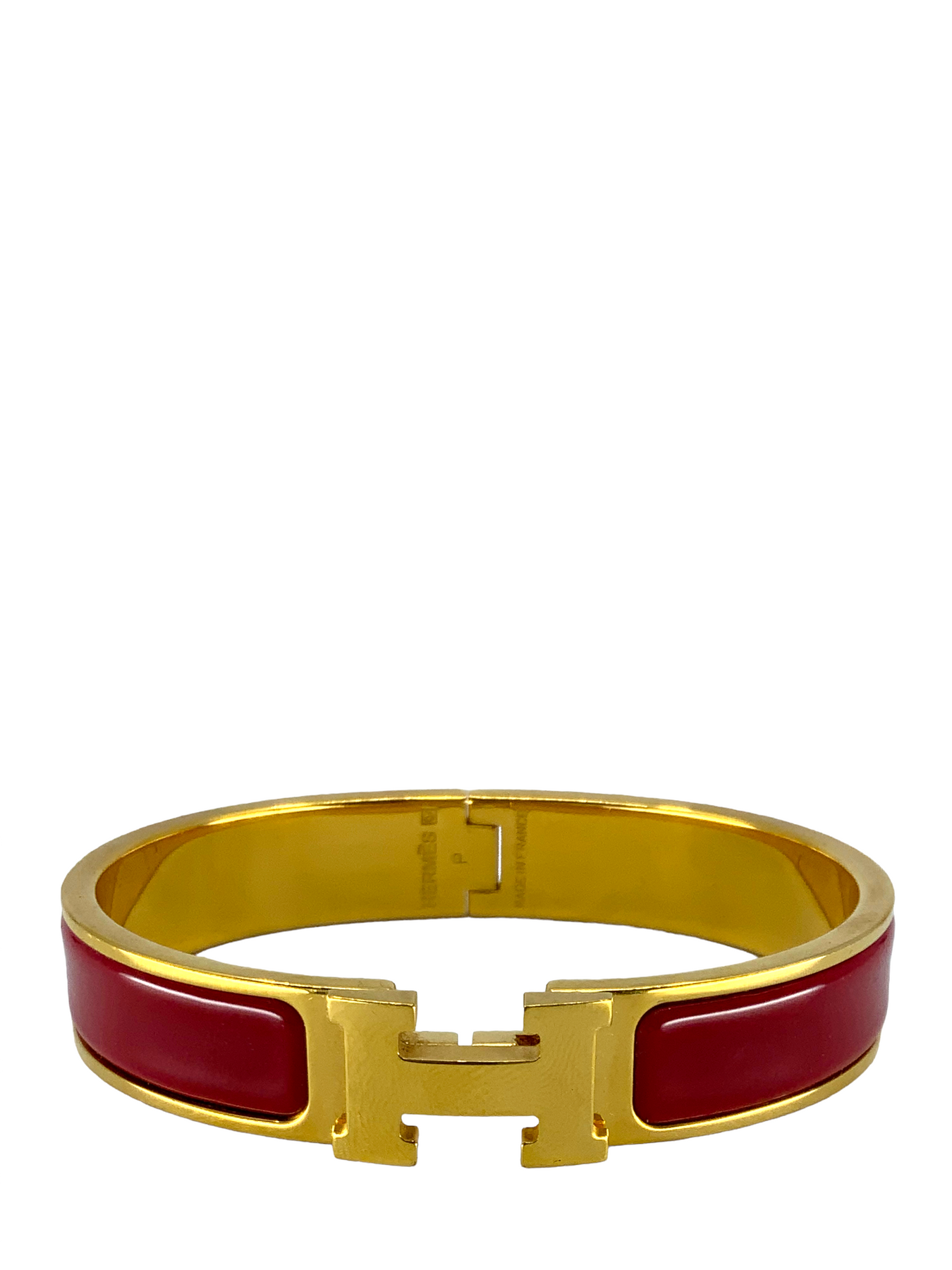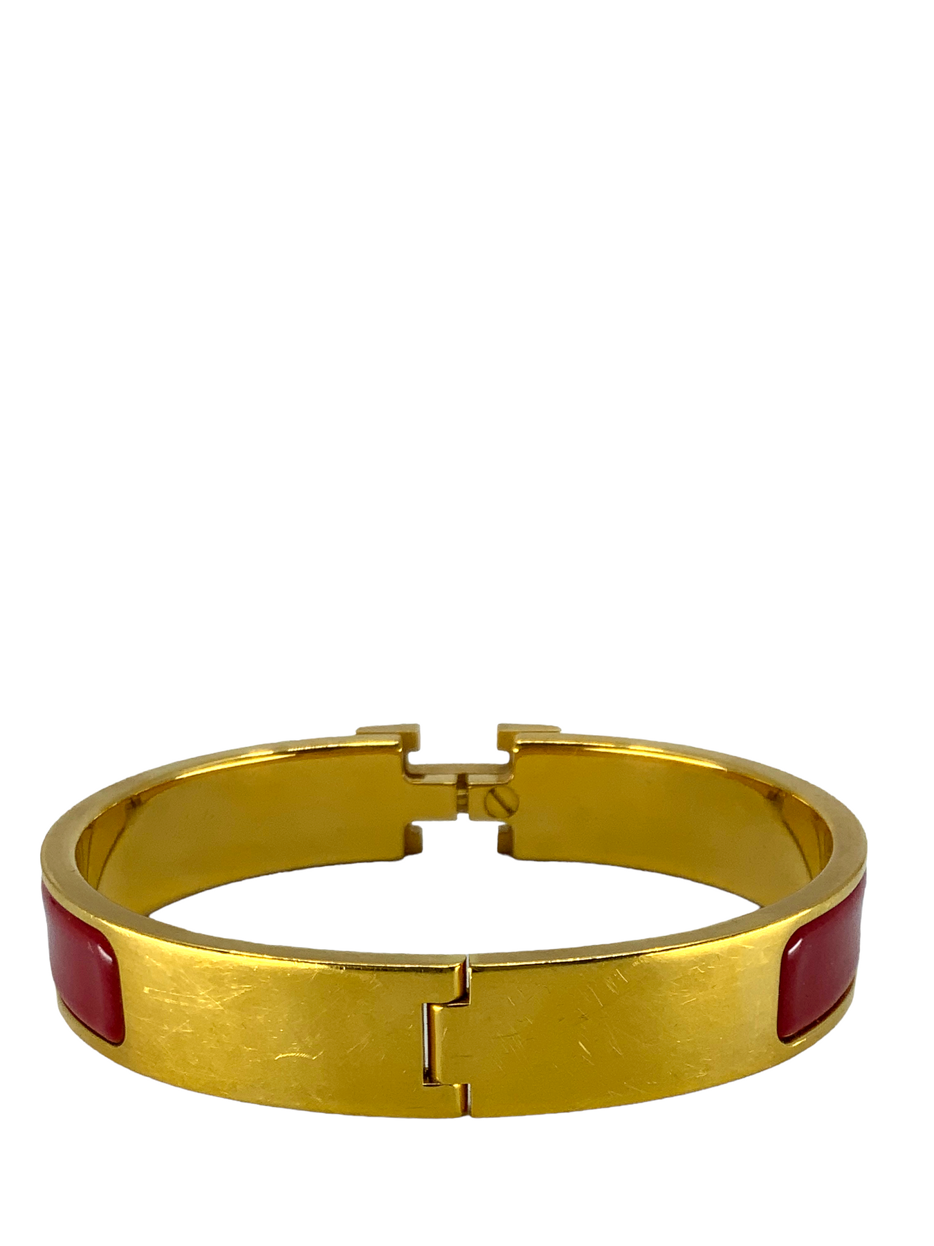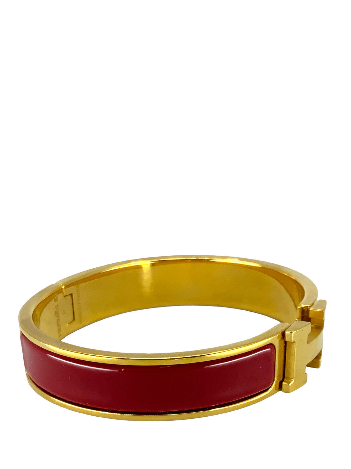 We the ity of this stunning Hermes Narrow Clic Clac H Bracelet PM crafted from red enamel and gold-tone hardware. Featuring a signature 'H' turn-lock. Stamped with 'P' from 2007.