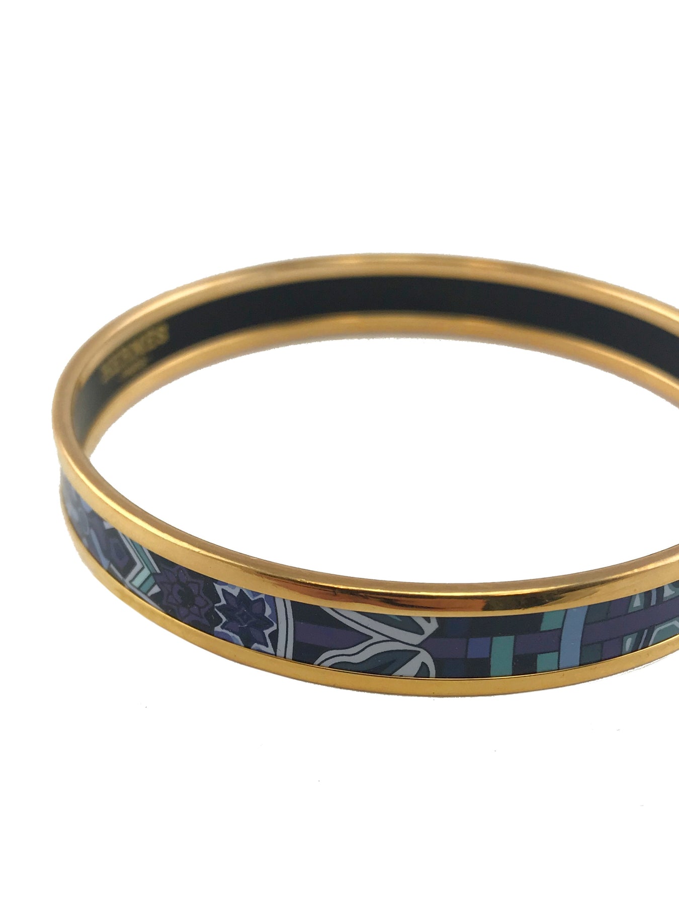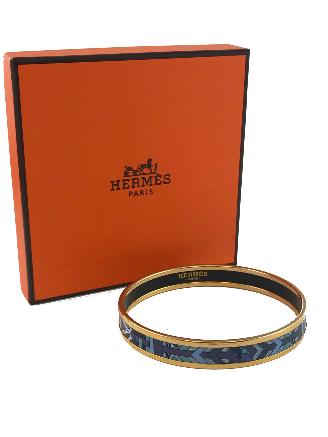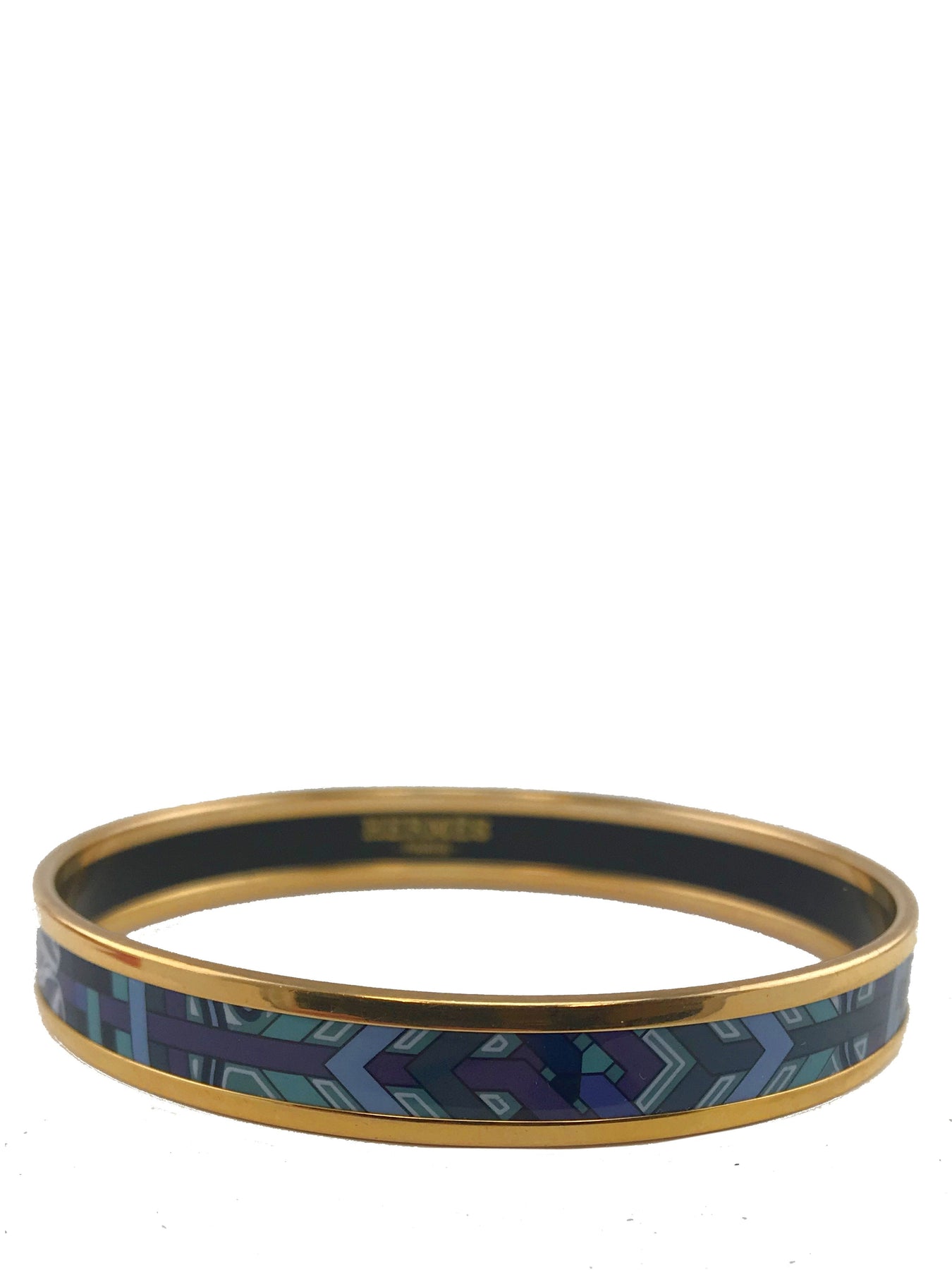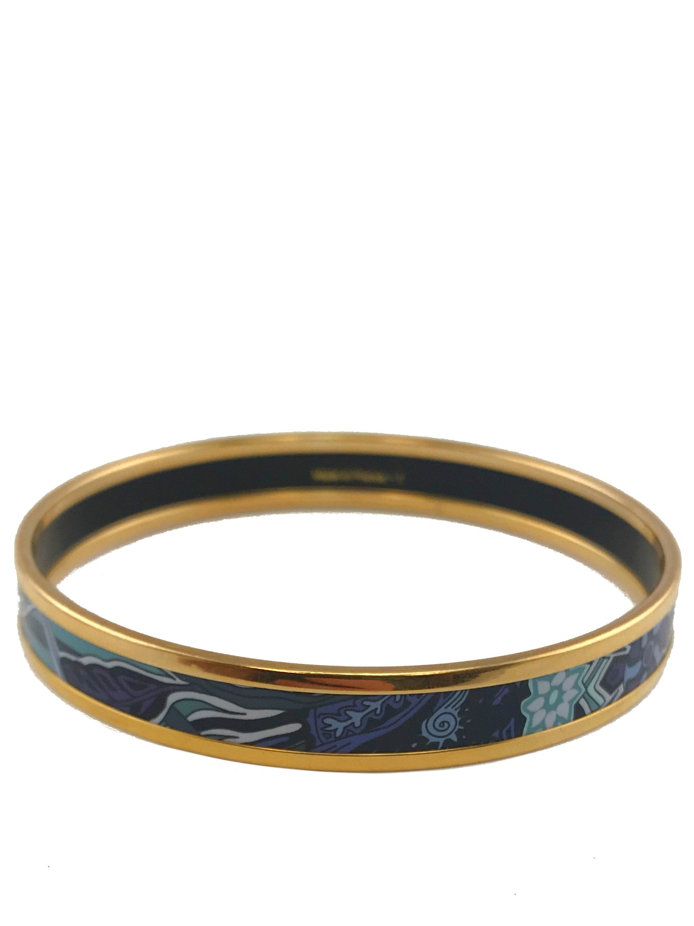 d ! Stunning Hermes Narrow Printed Enamel Narrow Bracelet 65. Featuring an abstract design in multi blue hues with an exterior gold plated rim.