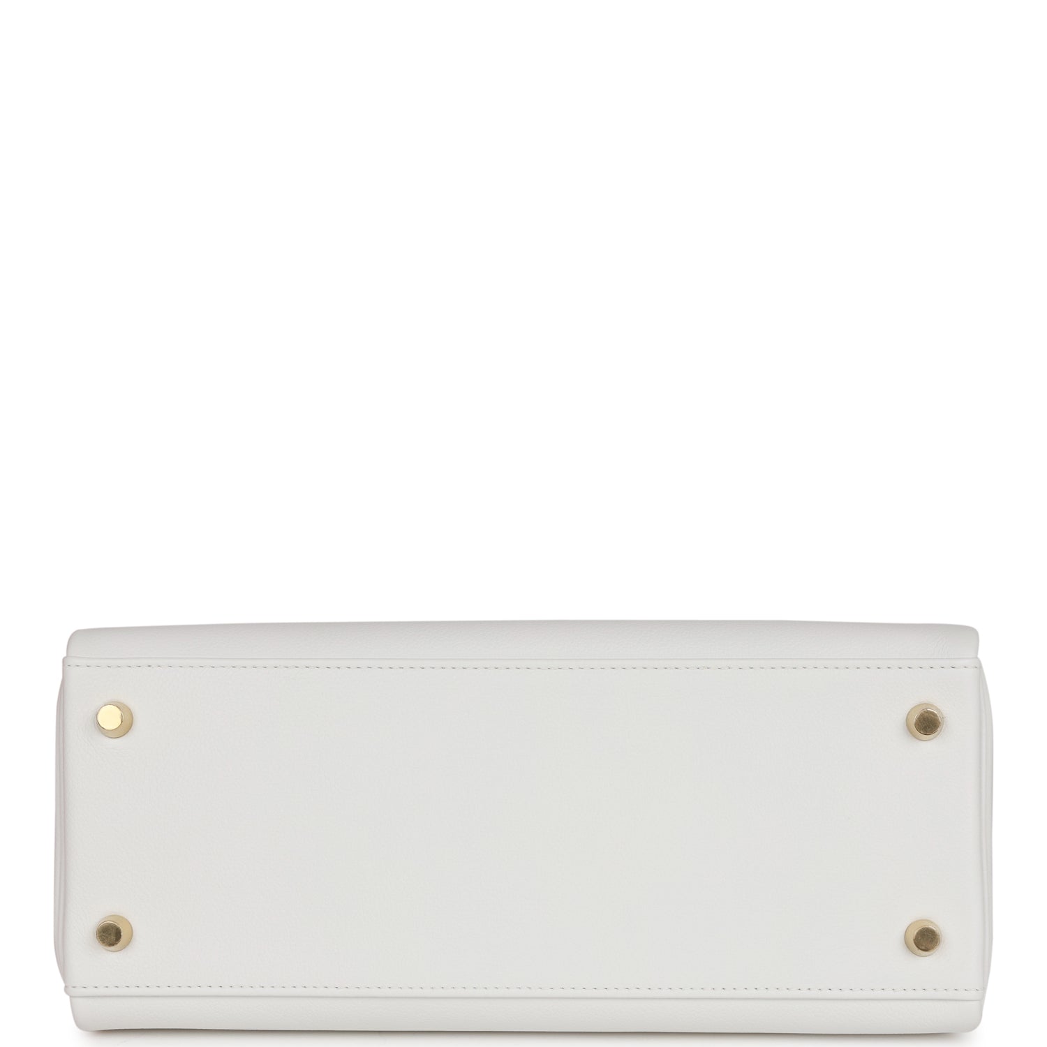 This Kelly, in the Retourne style, is in New White evercolor leather with gold hardware, has tonal stitching, two straps with front toggle closure, clochette with lock and two keys, single rolled handle and removable shoulder strap.