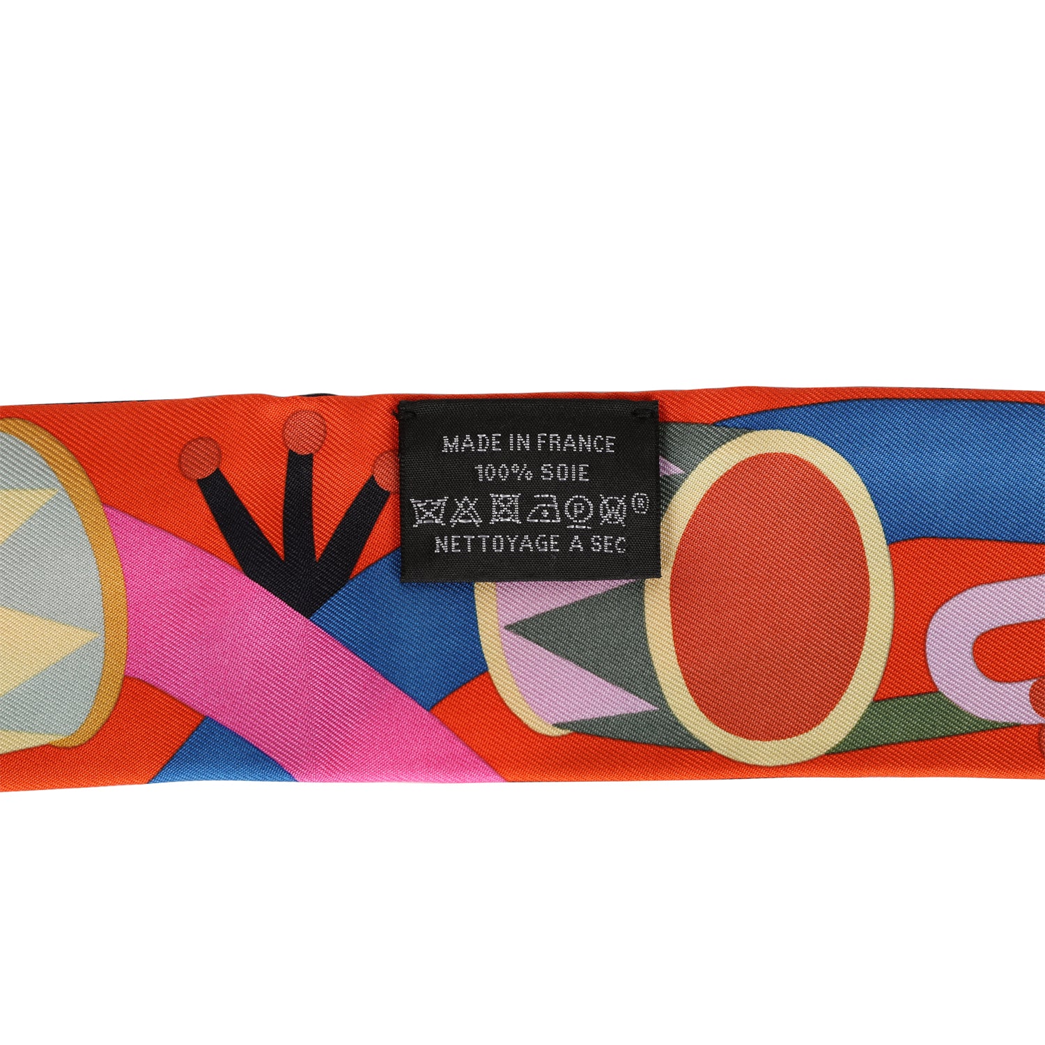Hermes "Parade en Fanfare" silk twilly designed by Tong Ren in an orange multi colorway.