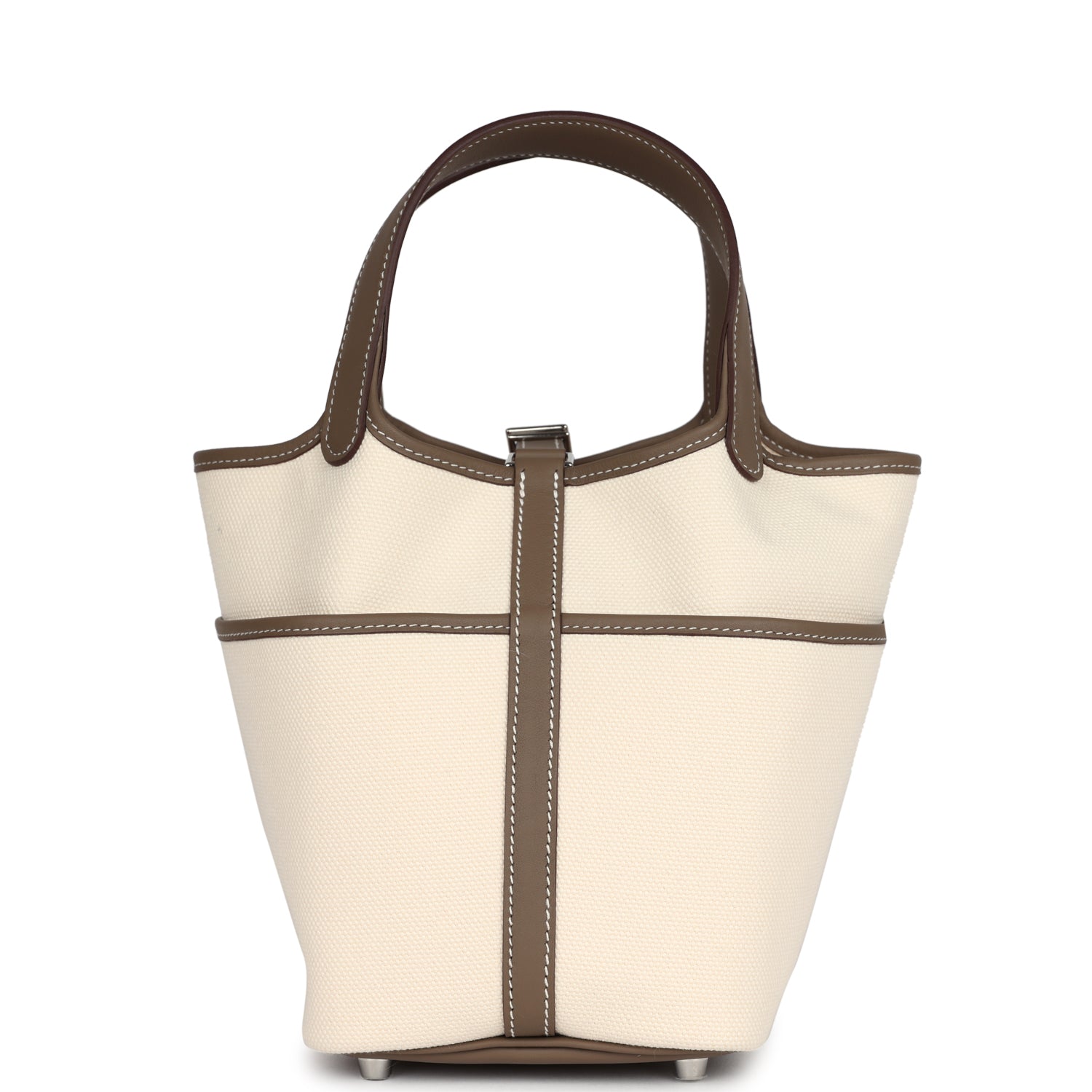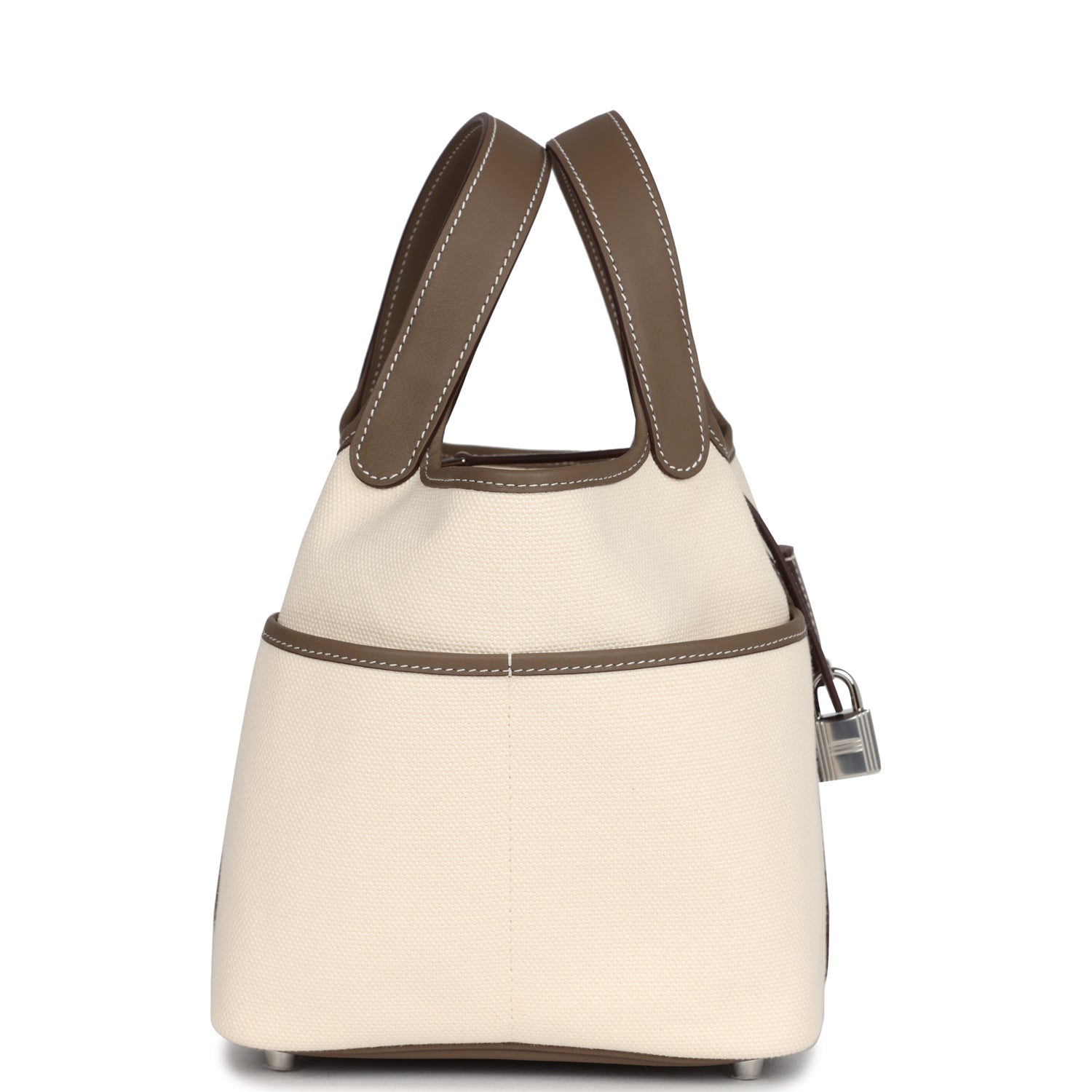 Cargo Picotin Lock is in Etoupe swift leather and Ecru Toile Goeland canvas with palladium hardware and has contrast stitching, four exterior pockets with two top handles.