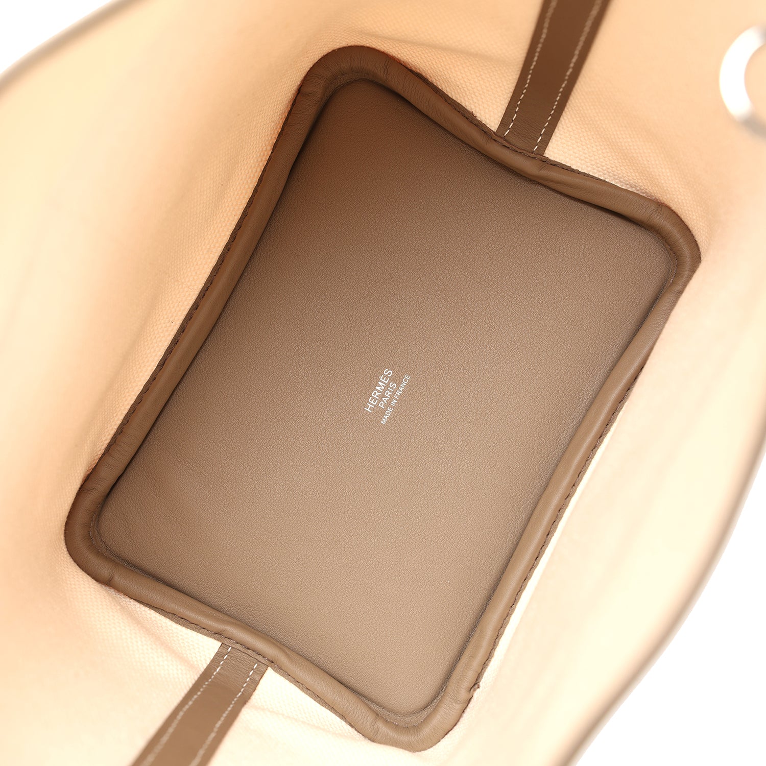 The interior is lined with Ecru toile canvas and Etoupe swift leather, no interior pockets and has a pull through closure secured by padlock.