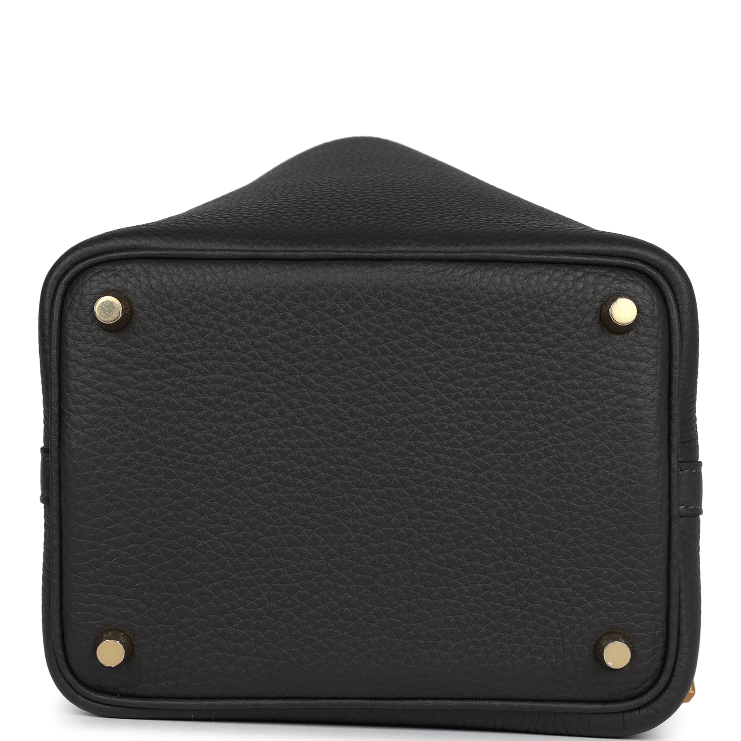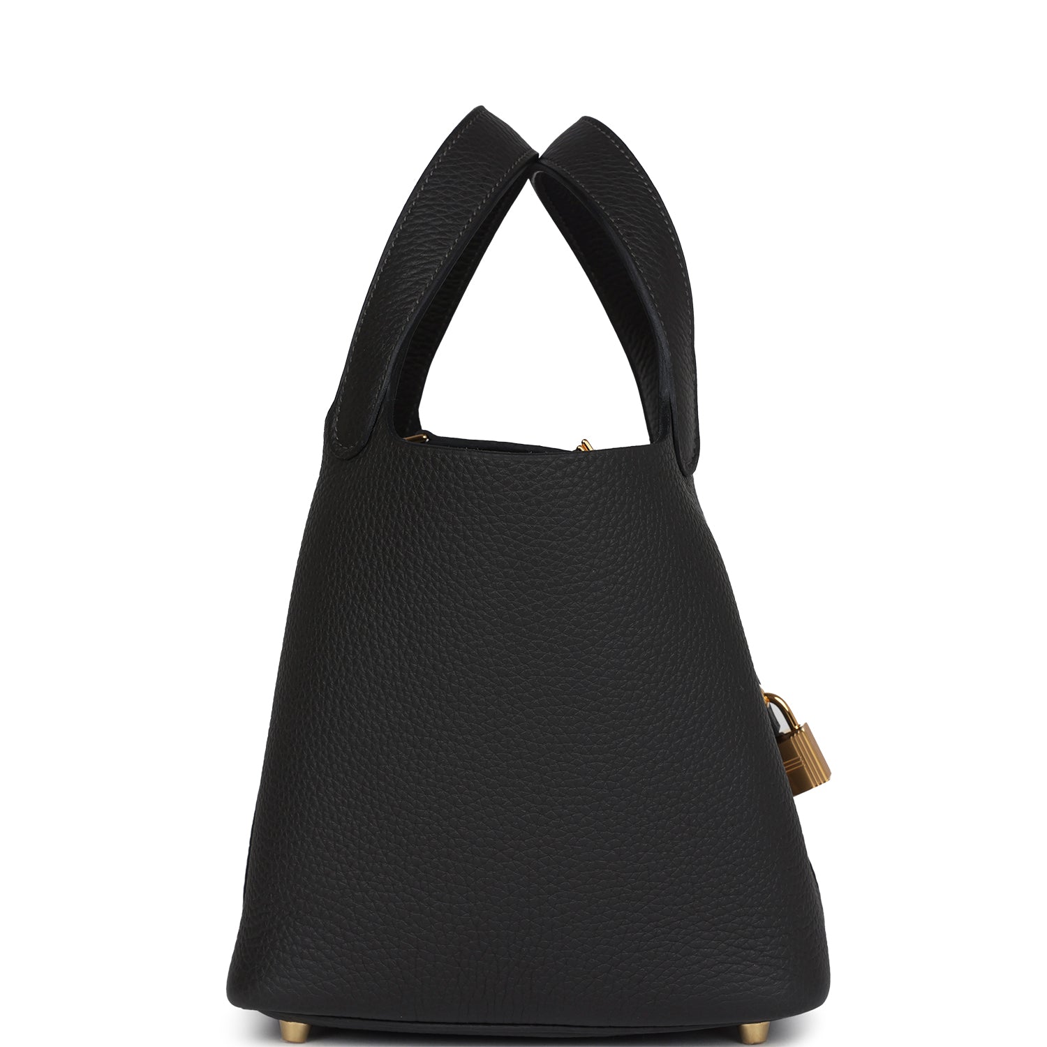 Picotin Lock is in Dark Bronze clemence leather with gold hardware and has contrast stitching with two top handles.