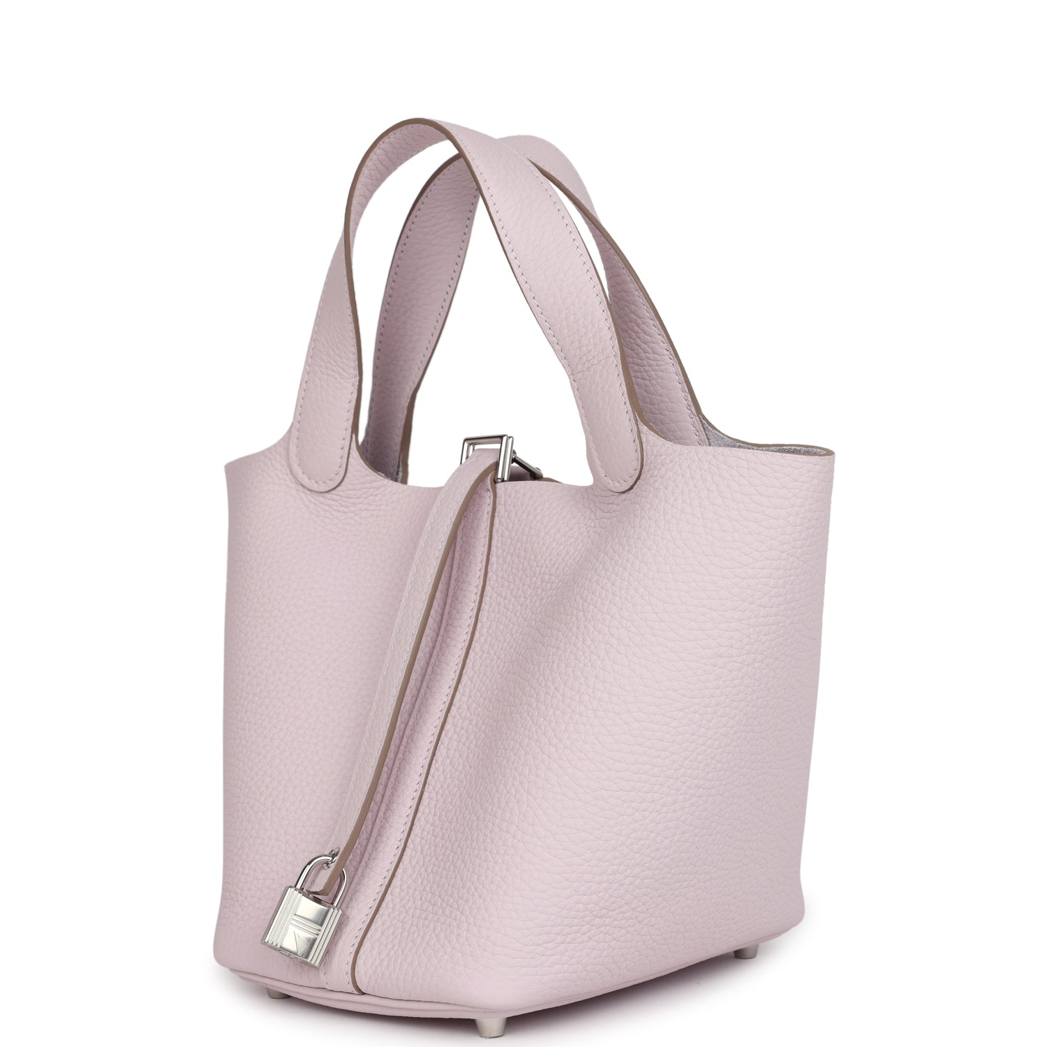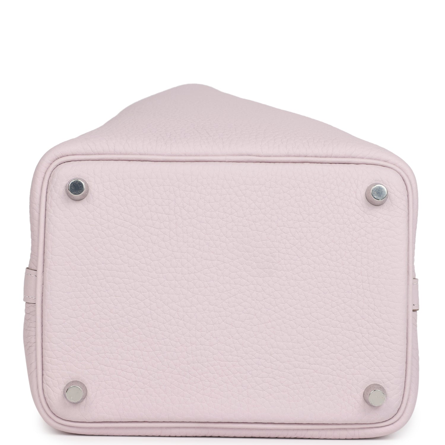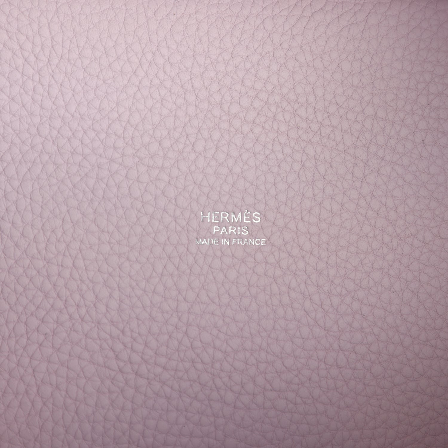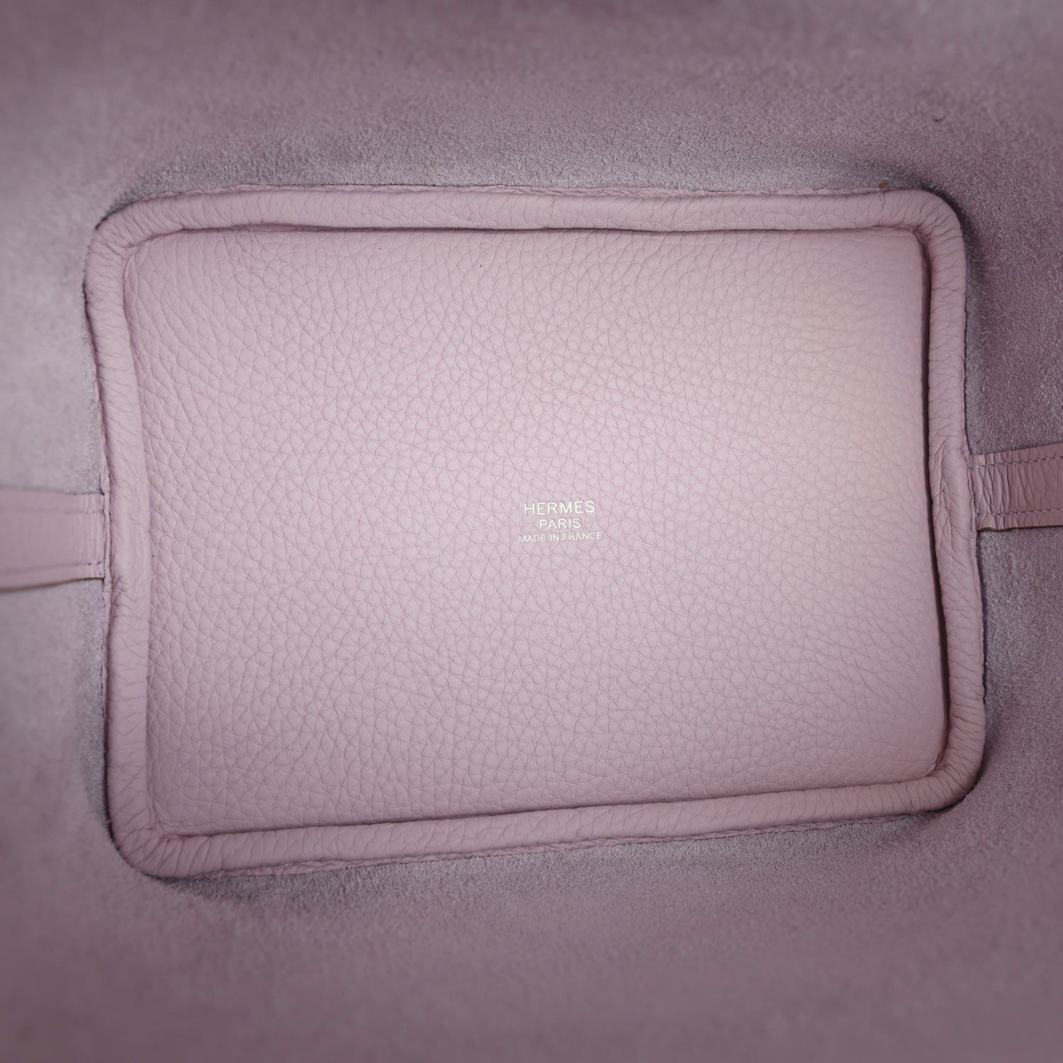 Picotin Lock is in Mauve Pale clemence leather with palladium hardware and has tonal stitching with two top handles.