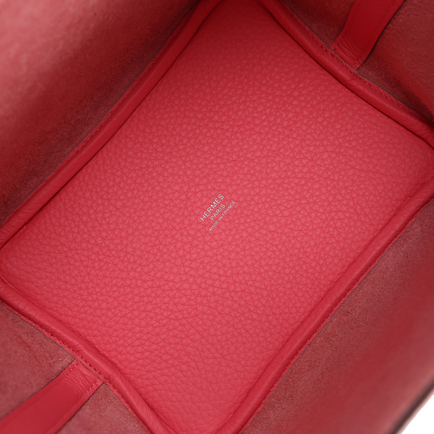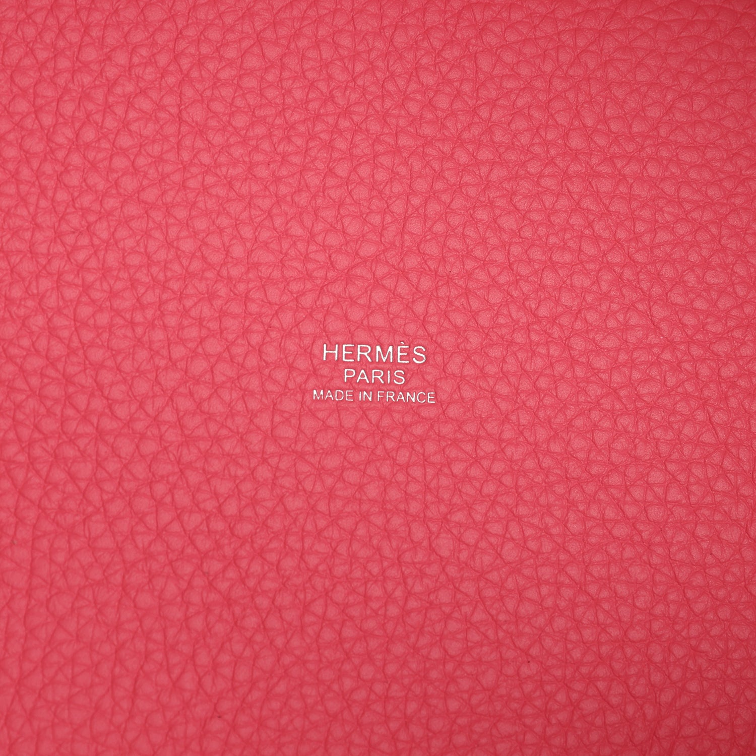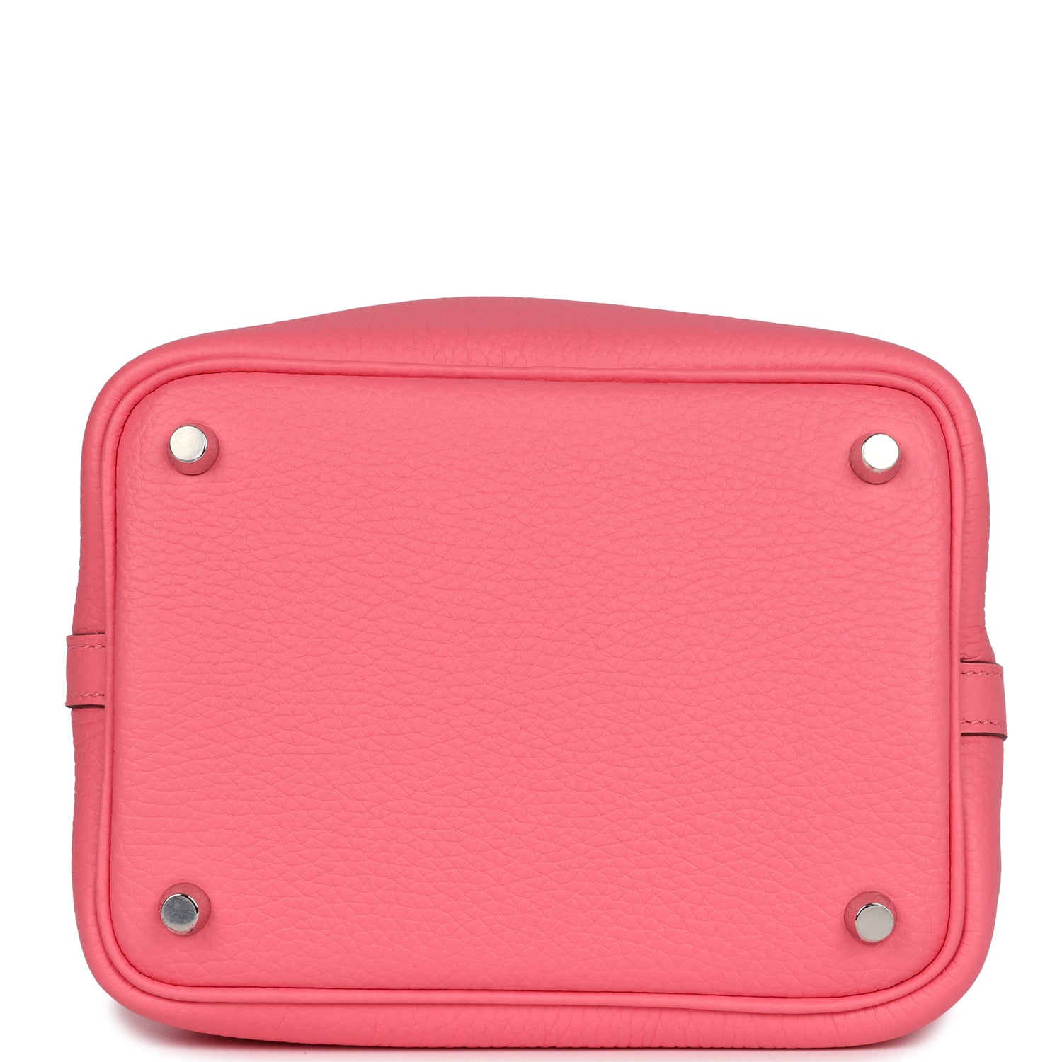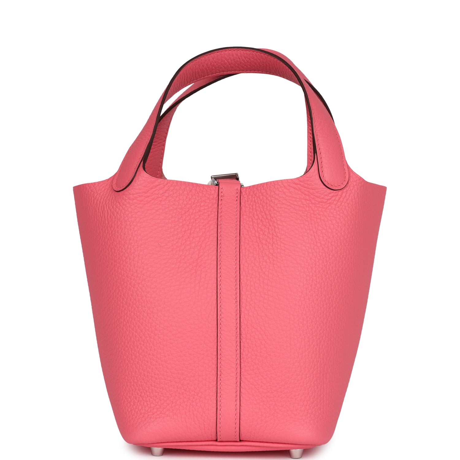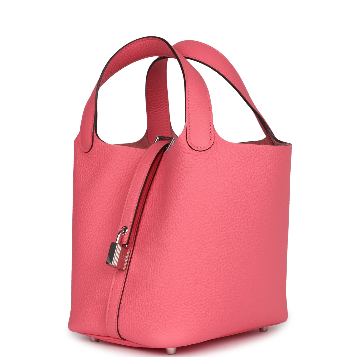 Picotin 18 is in Rose Azalee clemence leather with palladium hardware and has tonal stitching with two top handles.