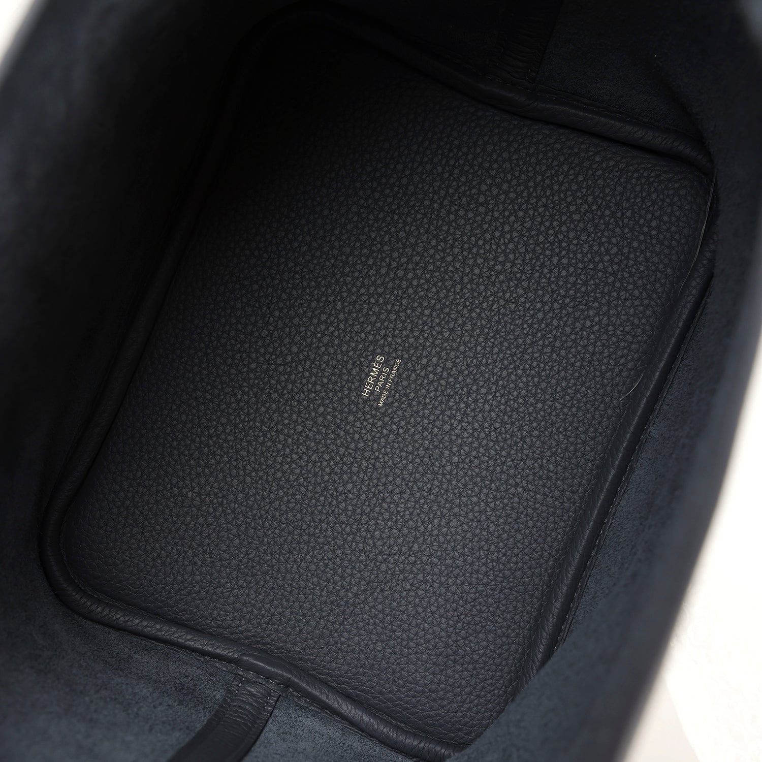 Picotin is in Ardoise Clemence leather with permabrass hardware and has tonal stitching with two top handles.