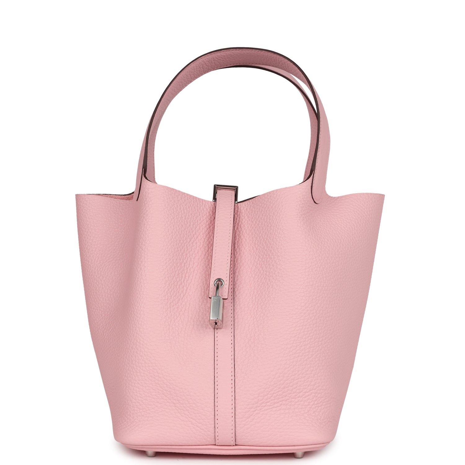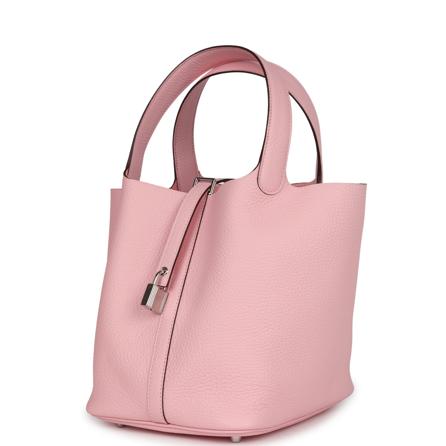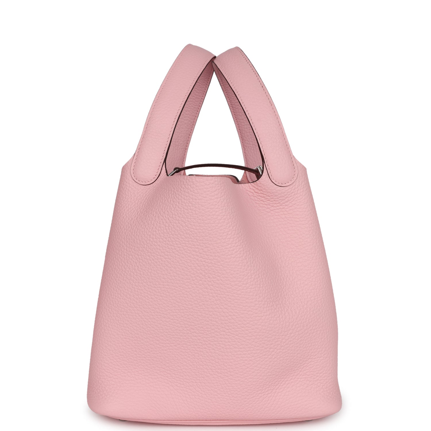 Picotin is in Rose Sakura clemence leather with palladium hardware and has tonal stitching with two top handles.