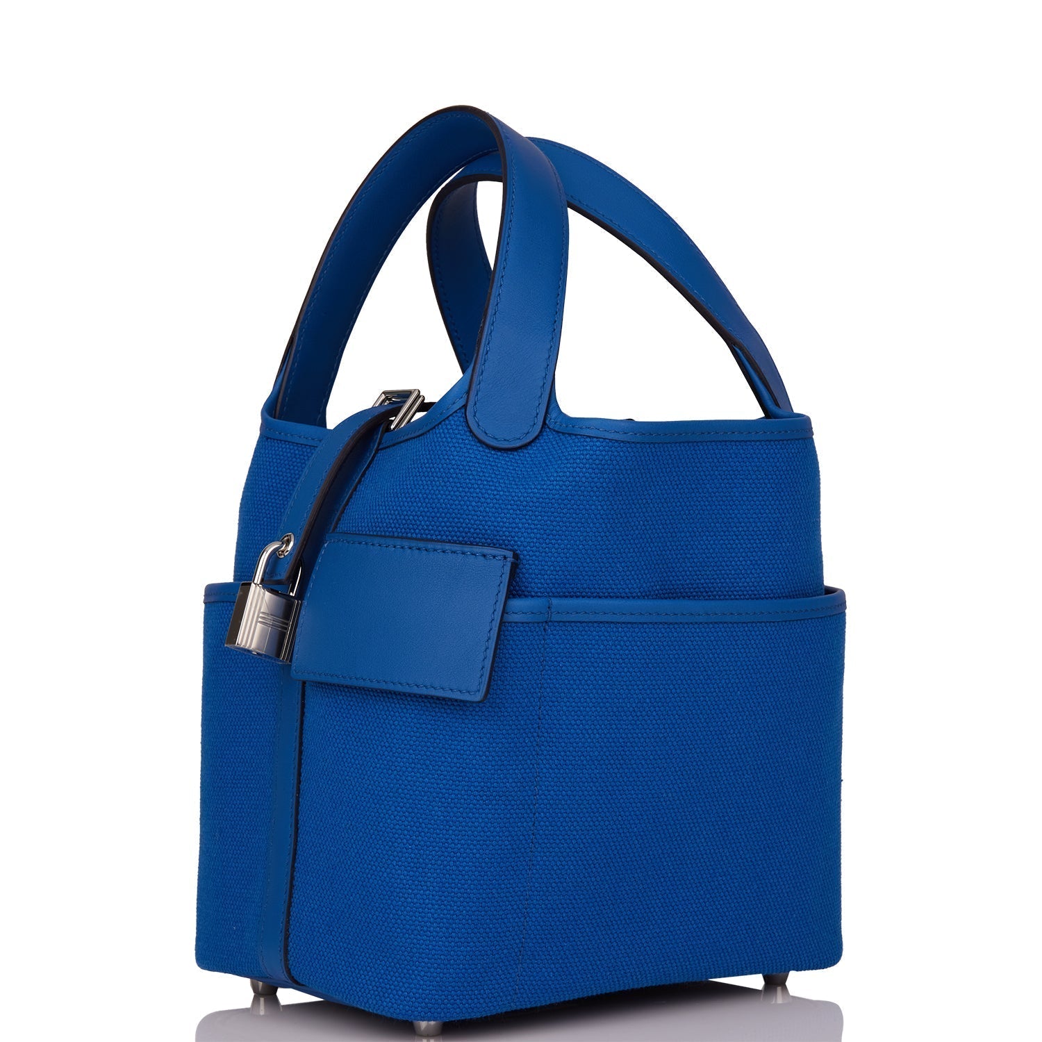 Cargo Picotin Lock is in Bleu France swift leather and toile with palladium hardware and has tonal stitching, four exterior pockets with two top handles.