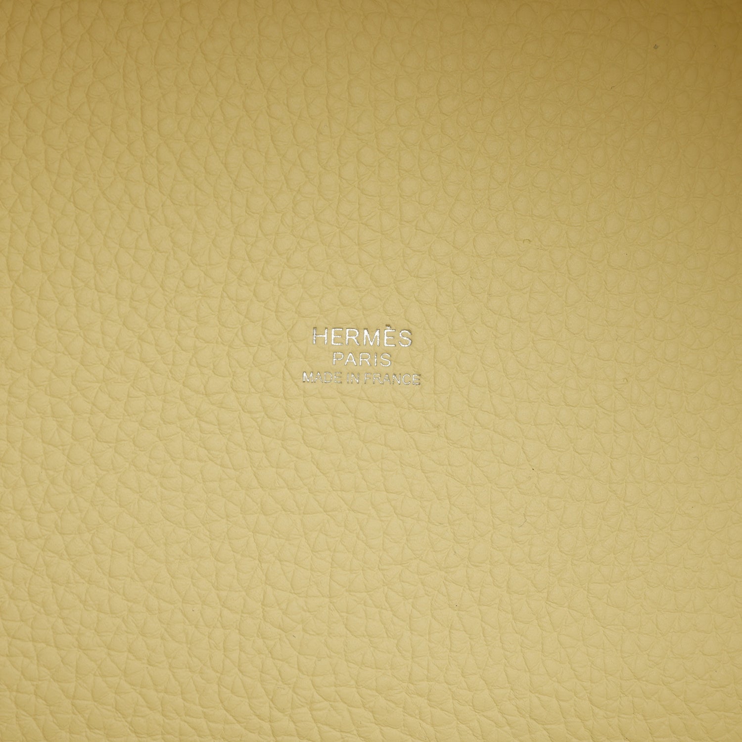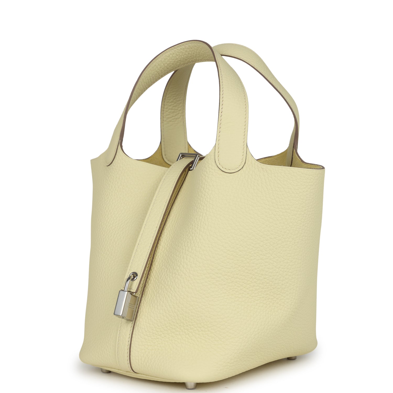 Picotin Lock is in Jaune Milton clemence leather with palladium hardware and has tonal stitching with two top handles.