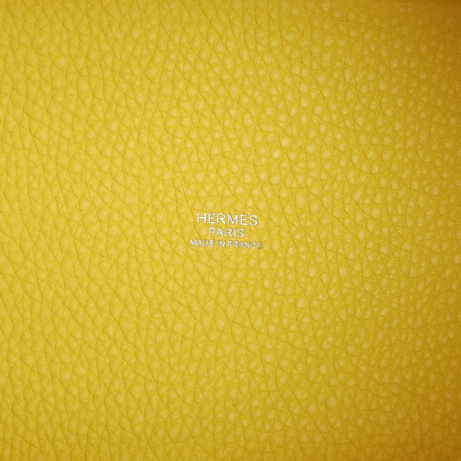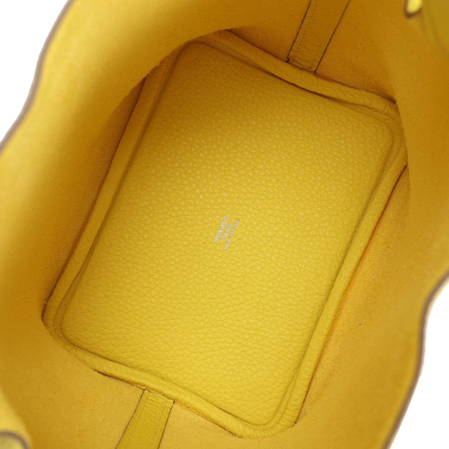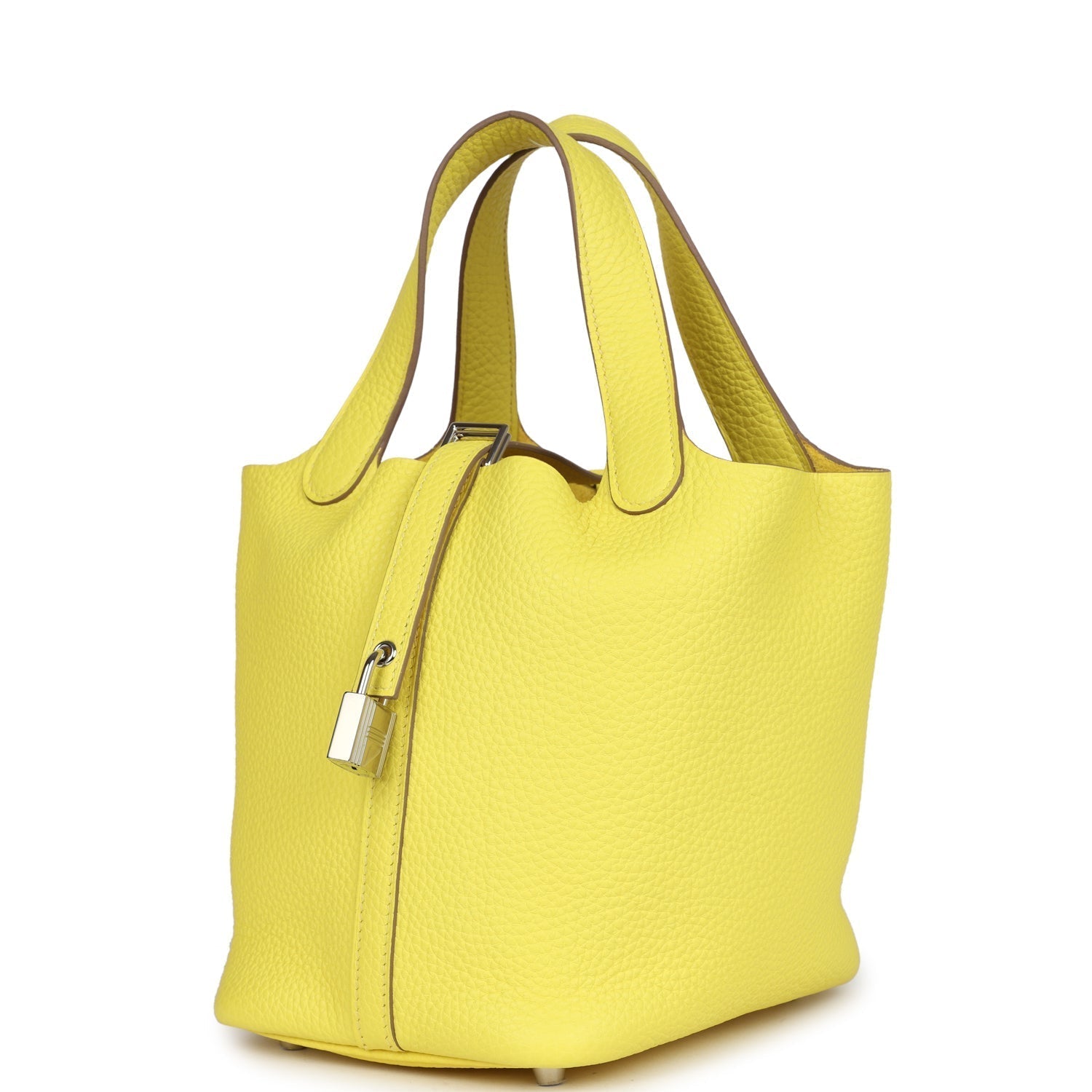 Picotin Lock is in Lime clemence leather with palladium hardware and has tonal stitching with two top handles.