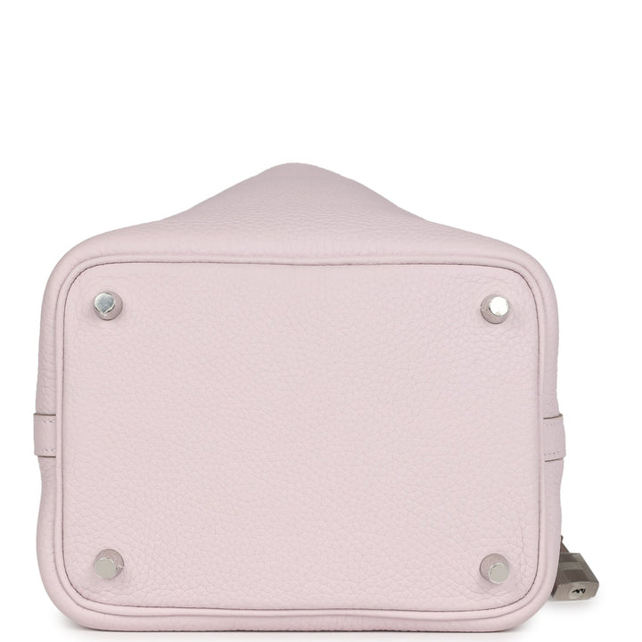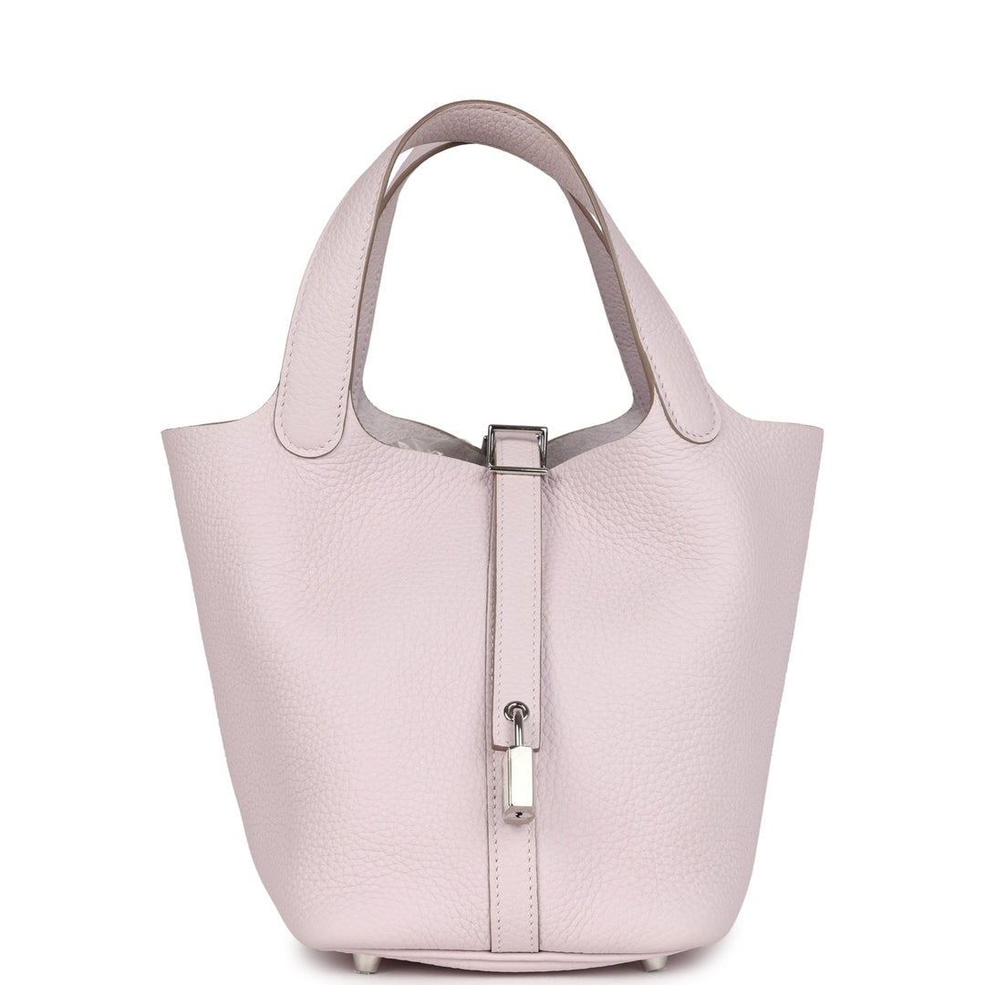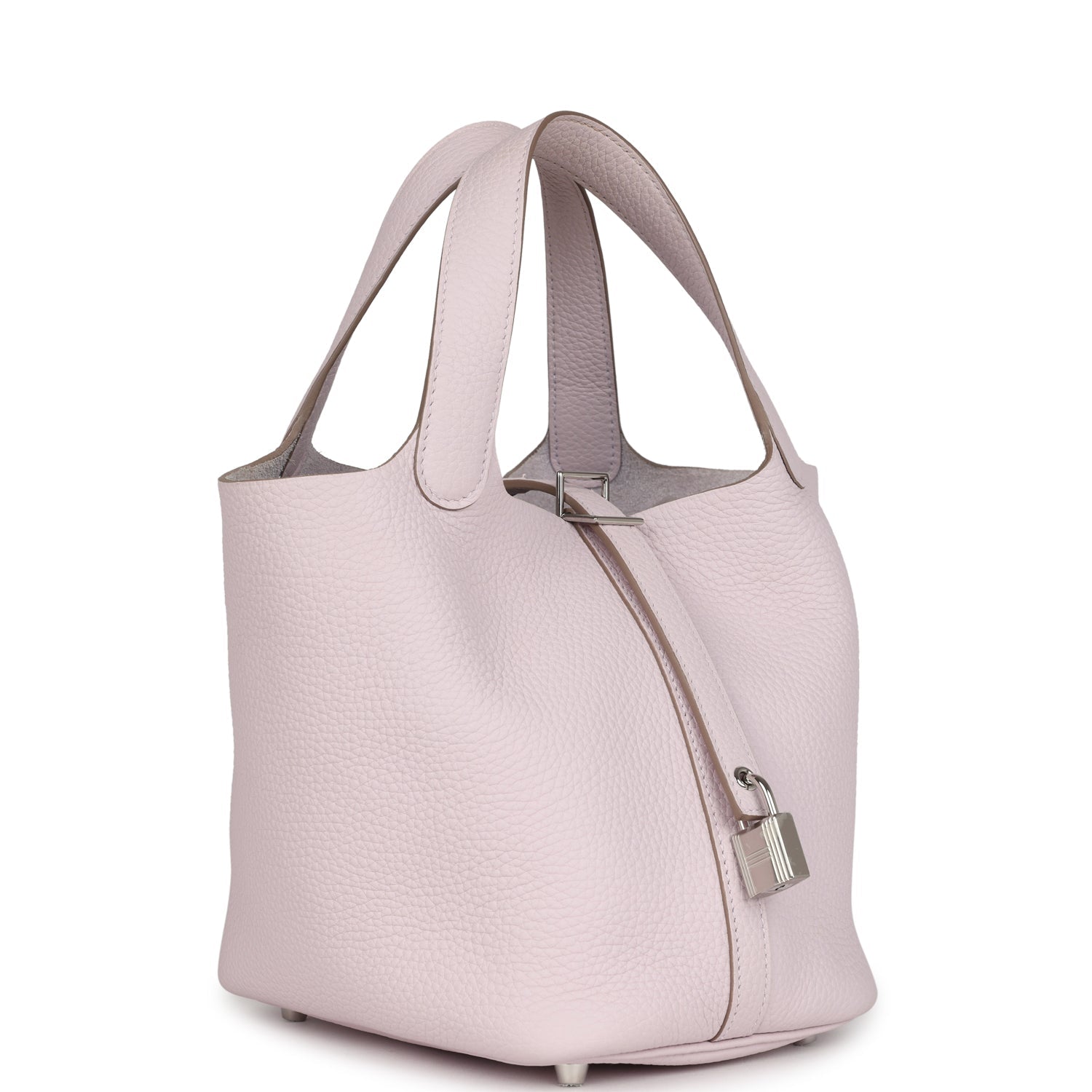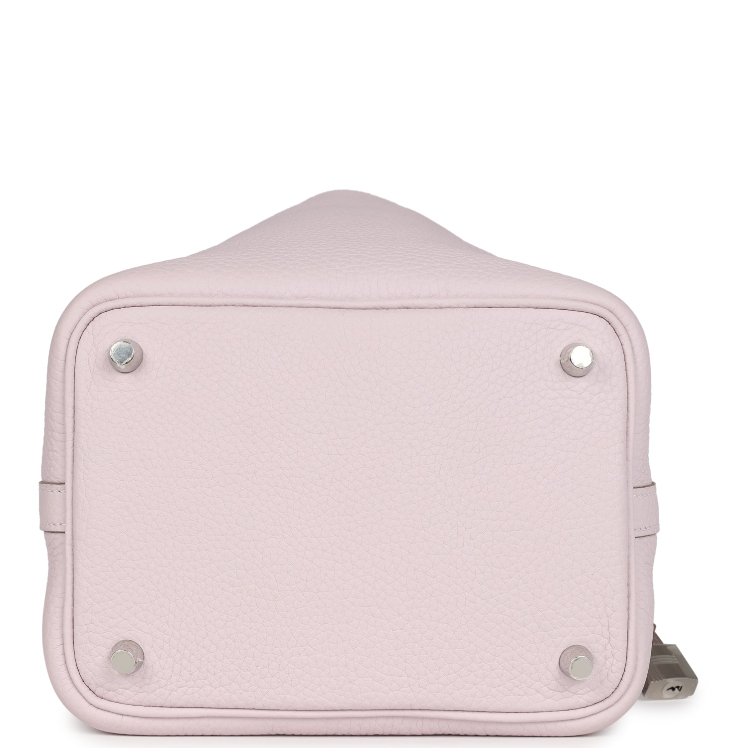 Picotin Lock is in Mauve Pale clemence leather with palladium hardware and has tonal stitching with two top handles.