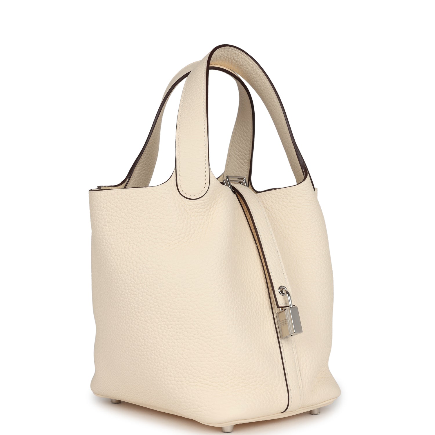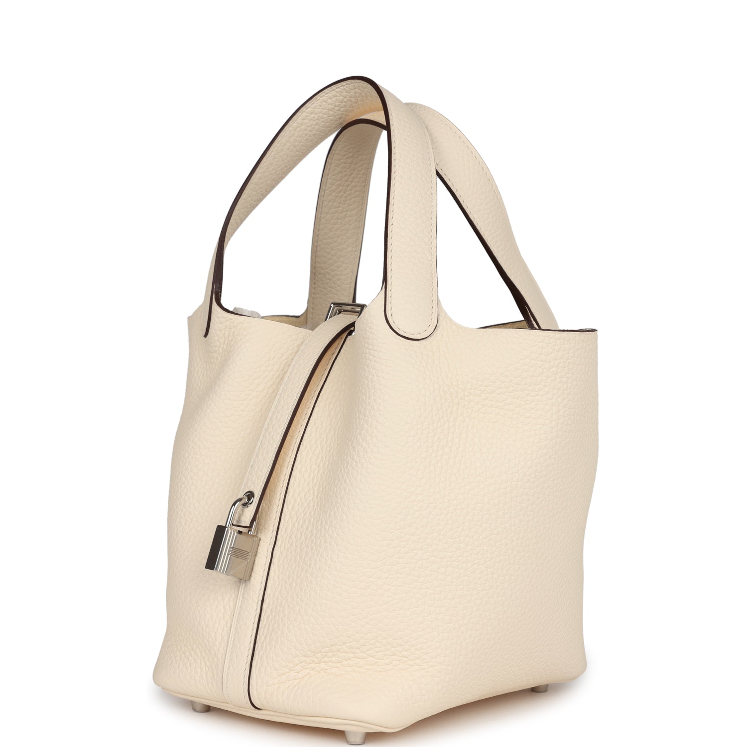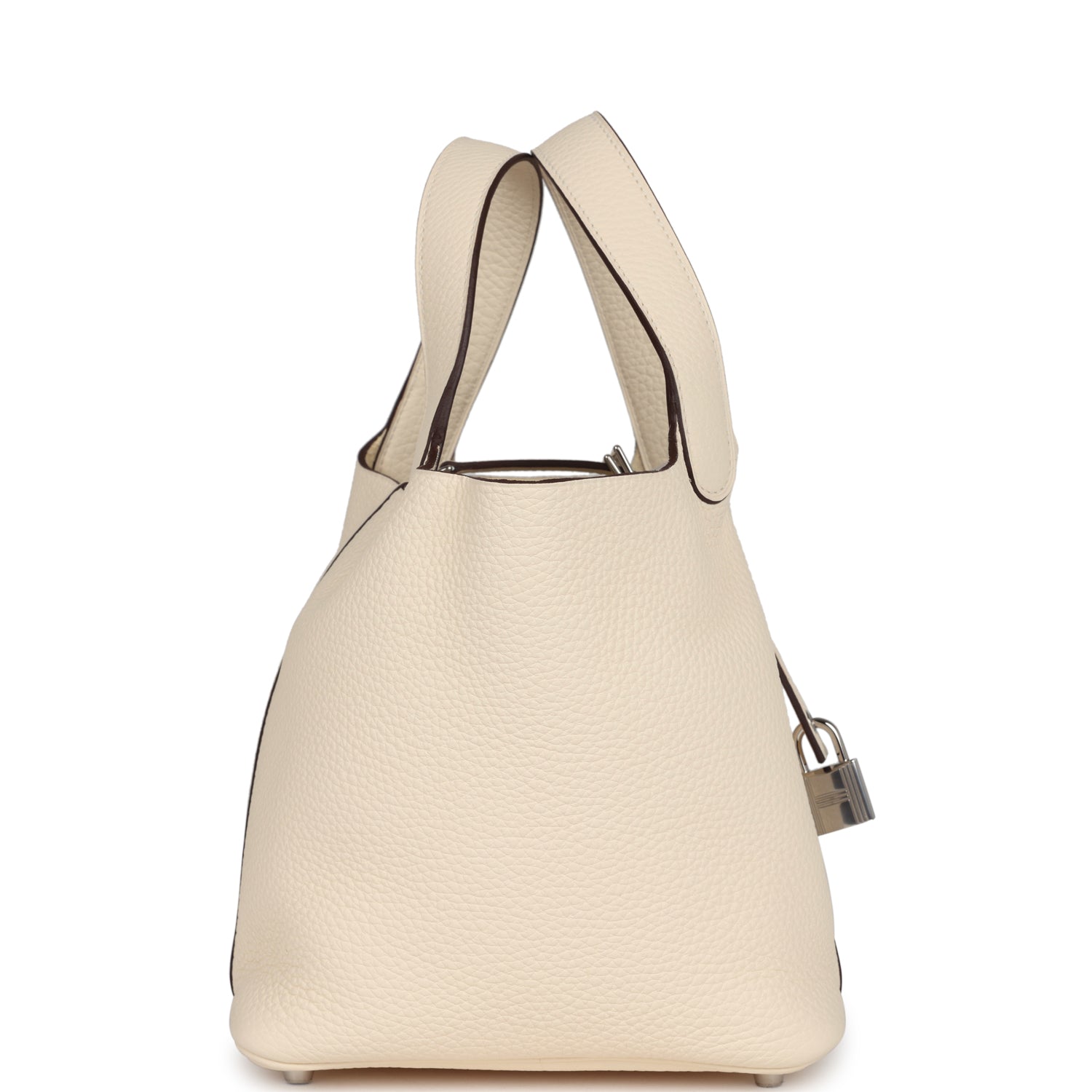 Picotin Lock is in Nata clemence leather with palladium hardware and has tonal stitching with two top handles.