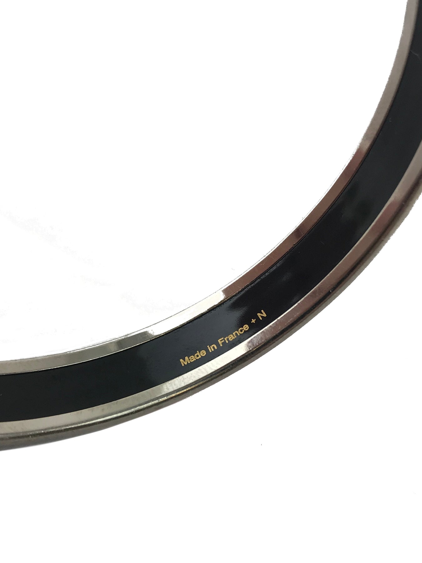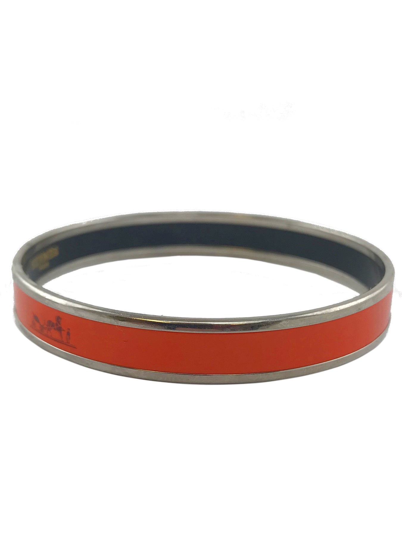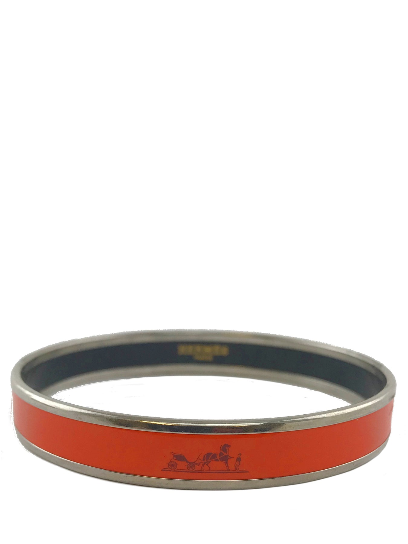 We the ity of this iconic Hermes Printed Enamel Caleche Narrow Bracelet 70. Featuring gorgeous orange enameling with a tiny signature horse and carriage design and an exterior palladium rim.