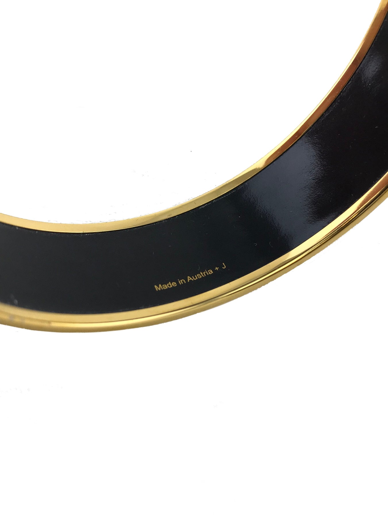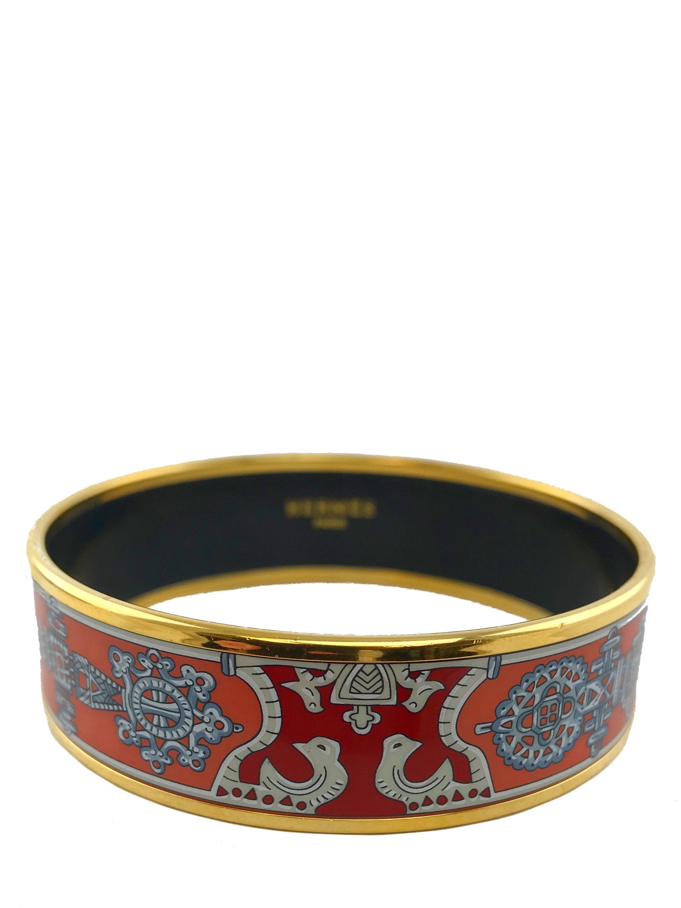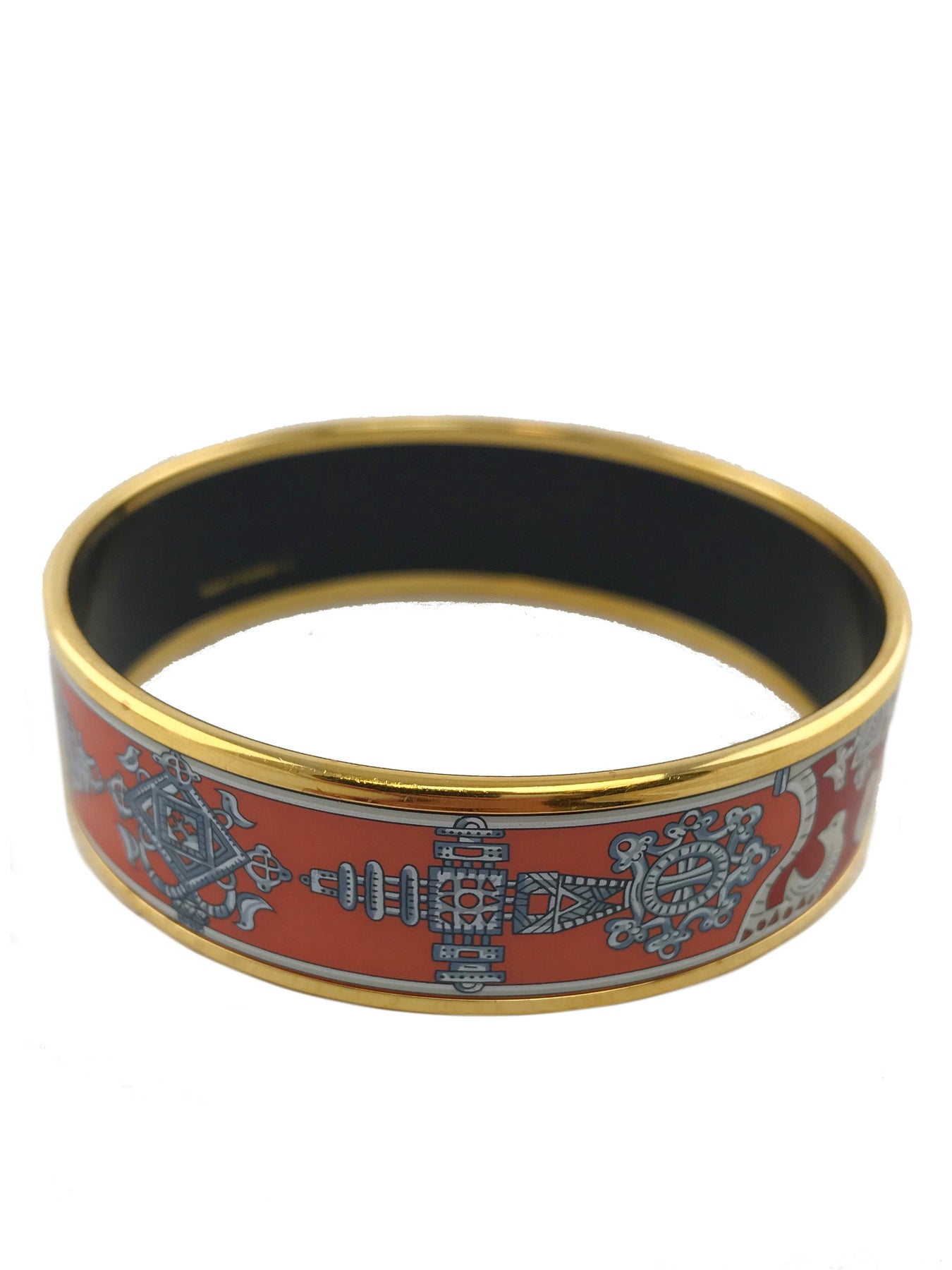 We the ity of this stunning Hermes Printed Enamel Wide Bracelet 65. This beautiful bangle features a beautiful red and orange enamel background with a gold-tone rim.