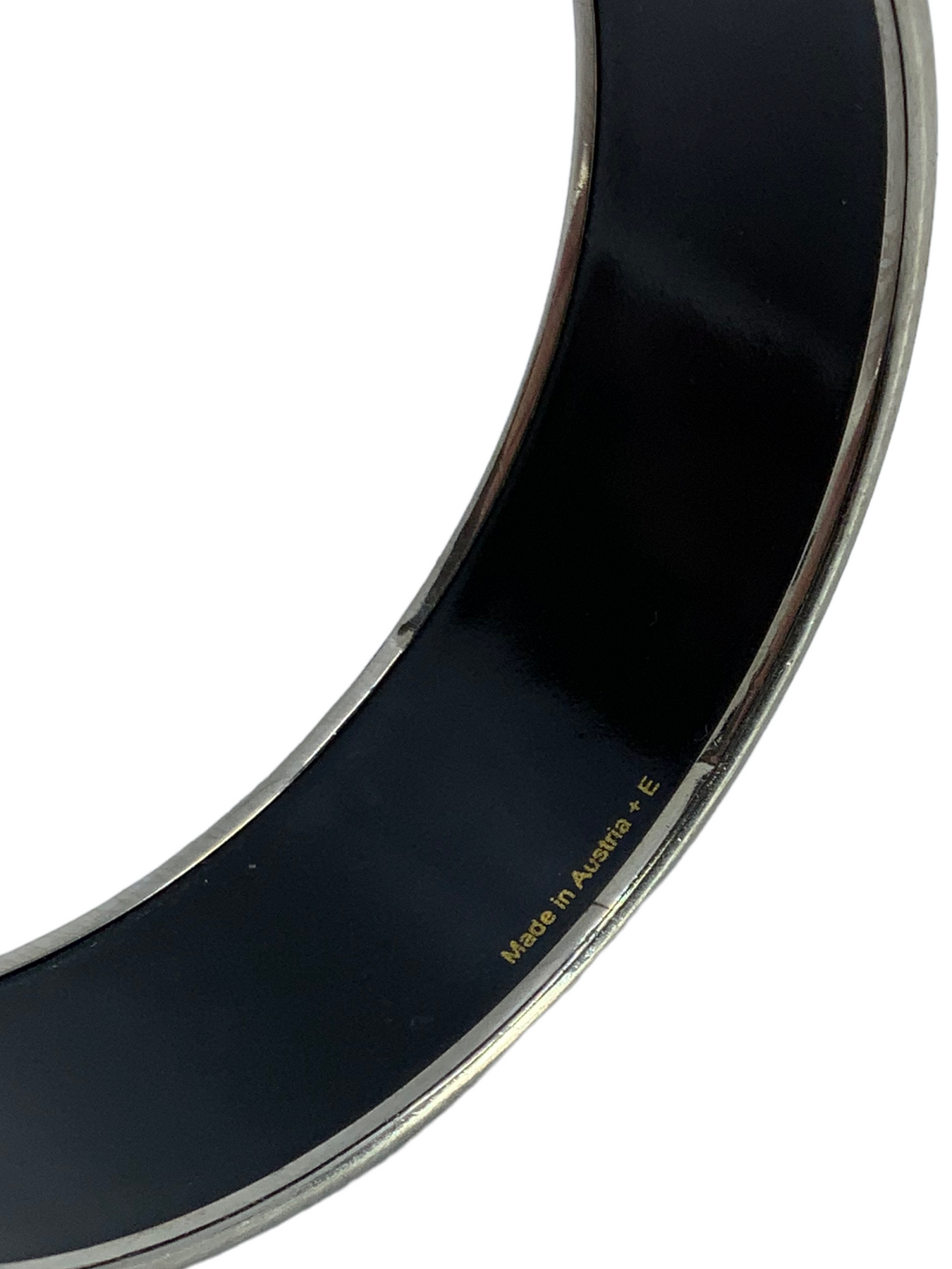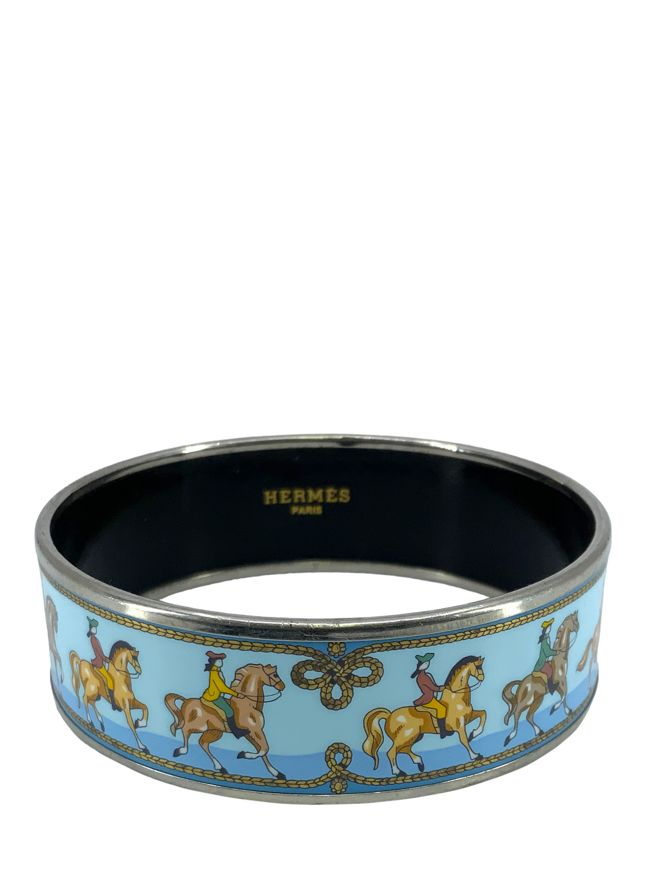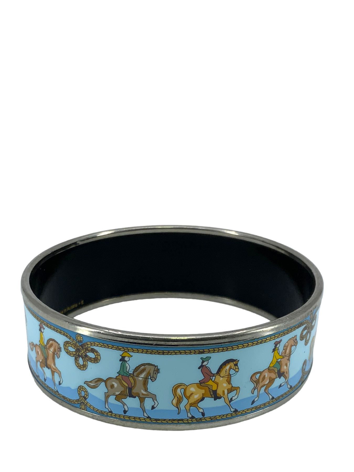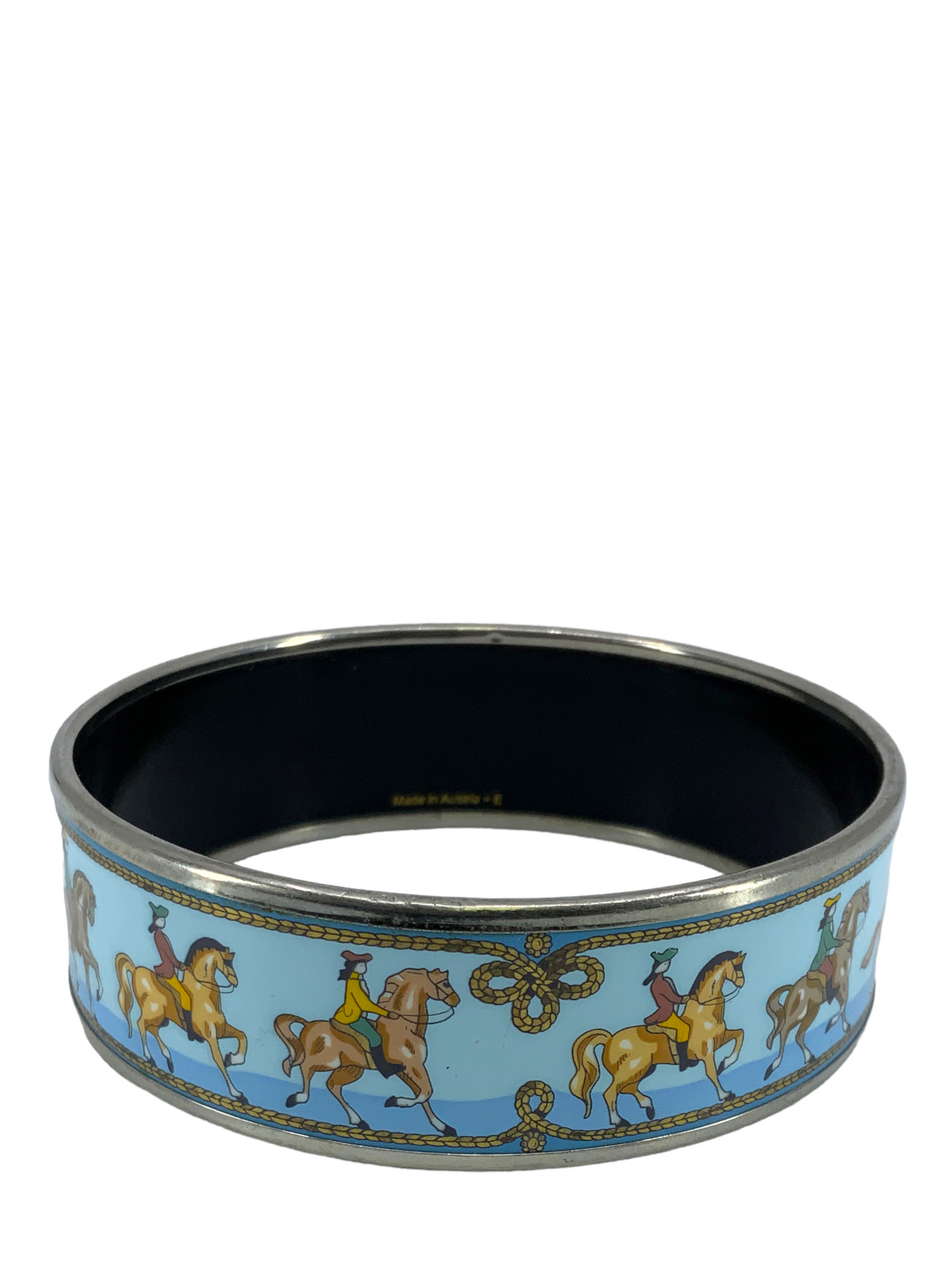 We the ity of this stunning Hermes Printed Enamel Wide Bracelet 65. This beautiful bangle features a beautiful blue enamel background with a printed horse rider motif and a palladium rim.