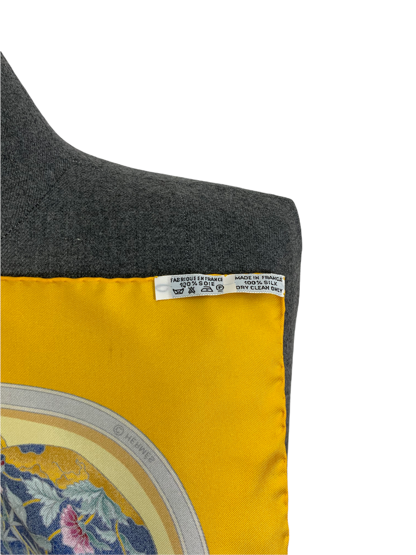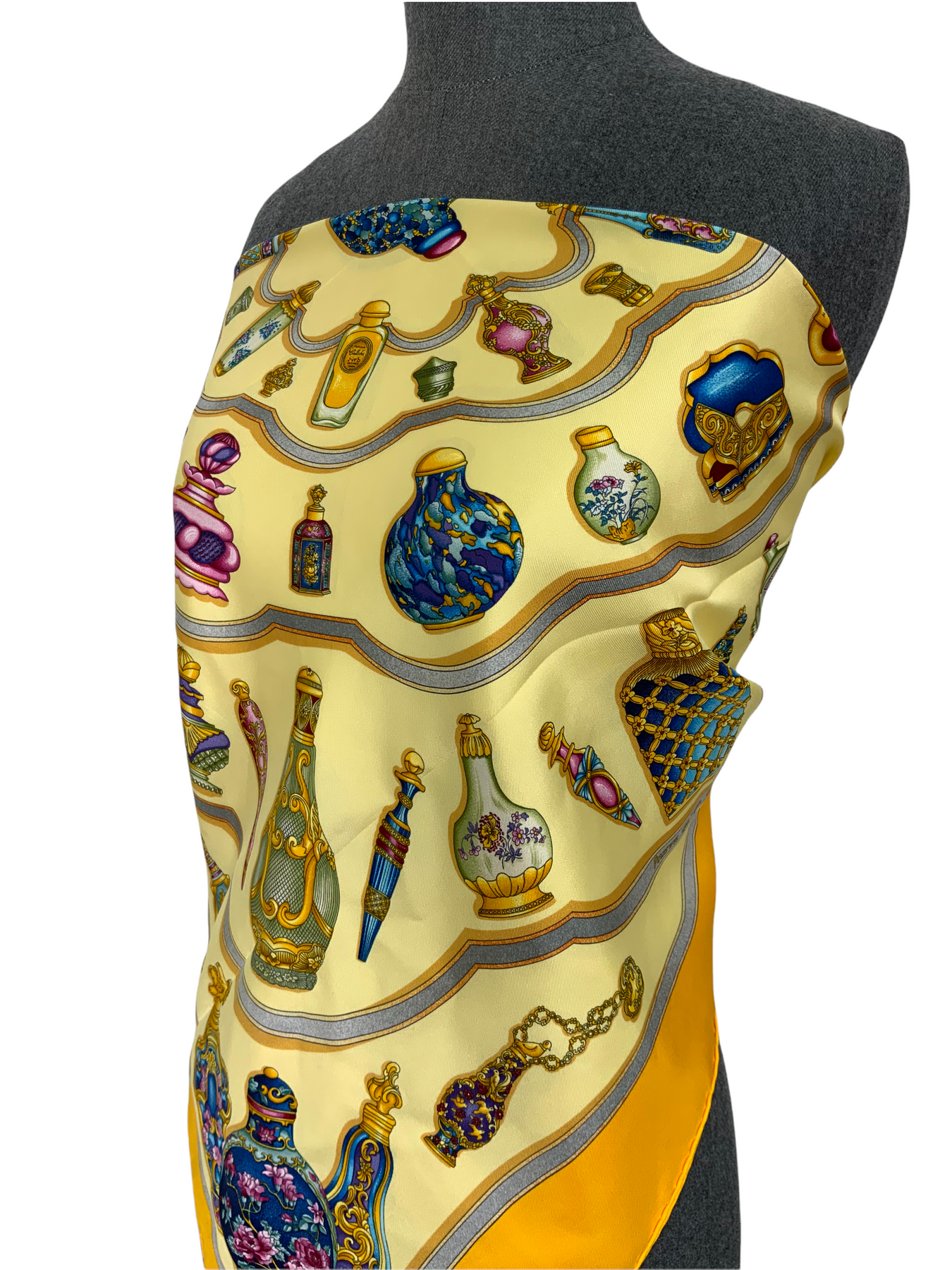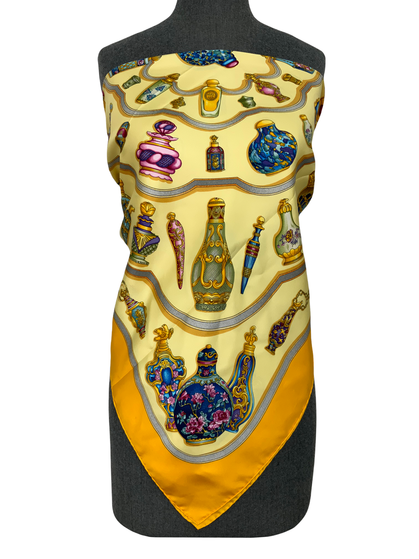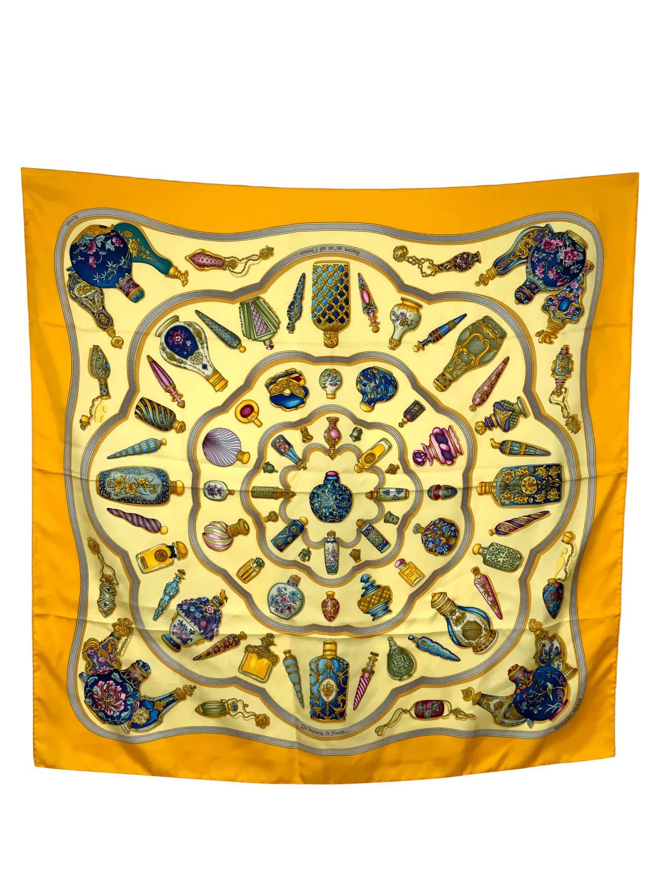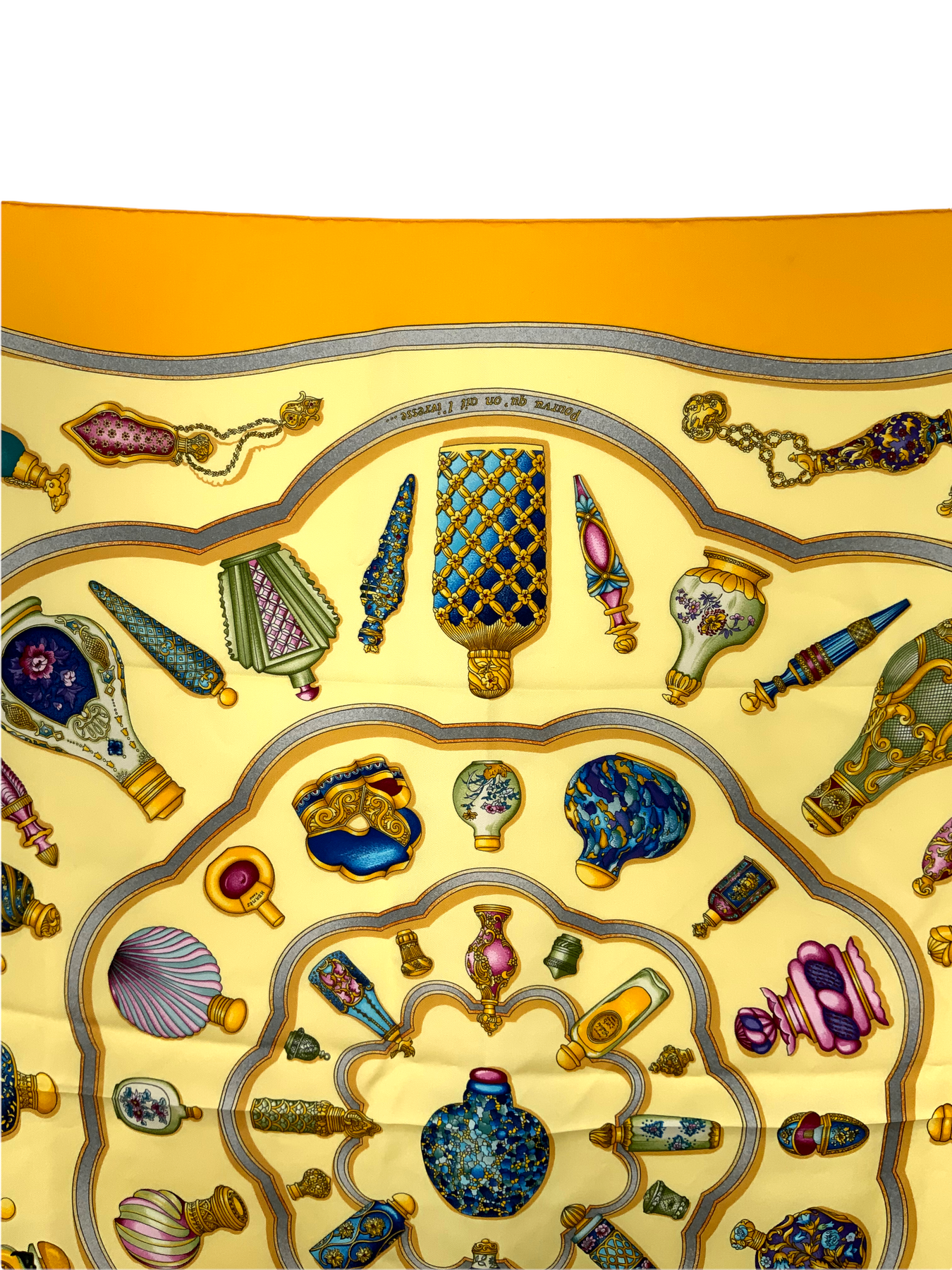 We the ity of this Hermes Qu' Importe Le Flacon Silk Scarf 90 designed by Catherine Baschet and first issued in 1988. This stunning scarf features beautiful hues of yellow and gold, depicting various perfume bottles from around the world.