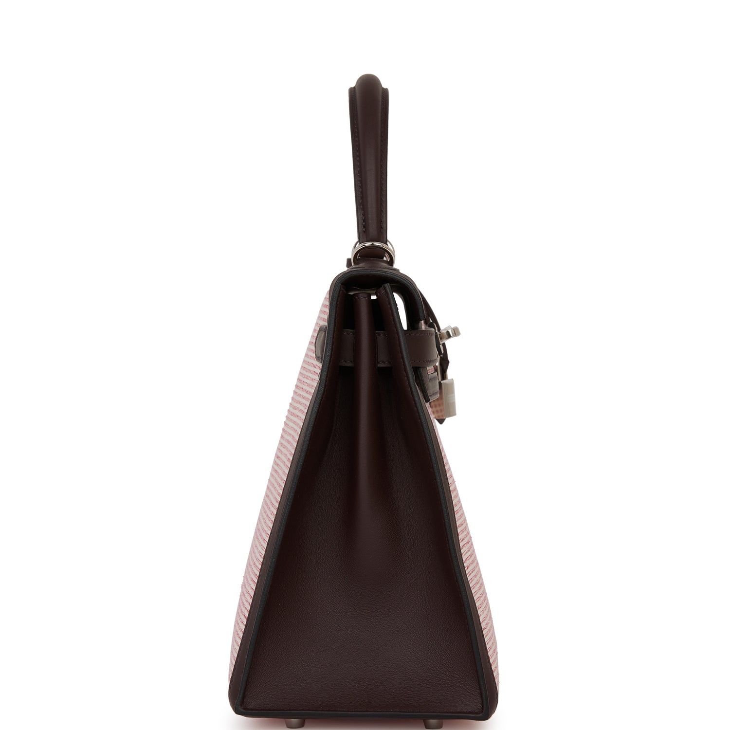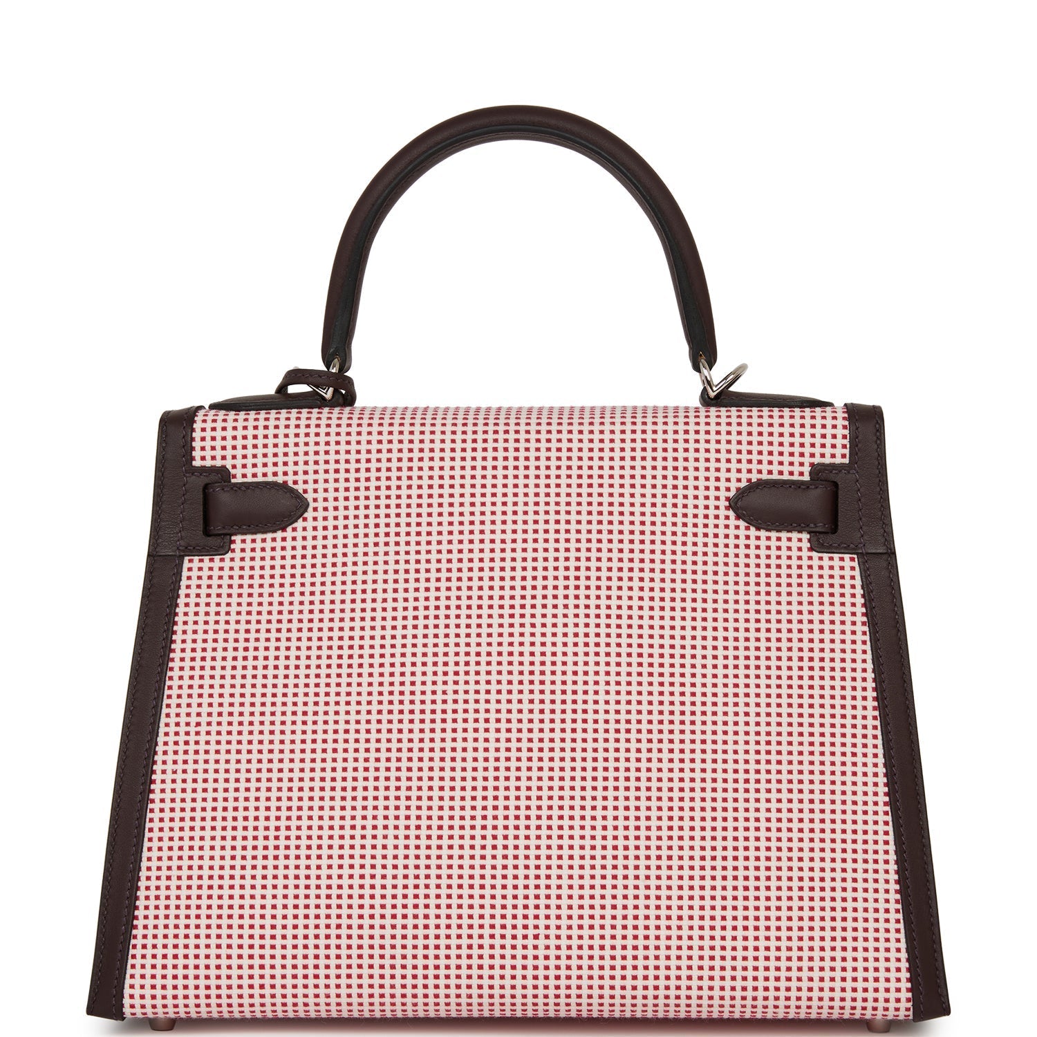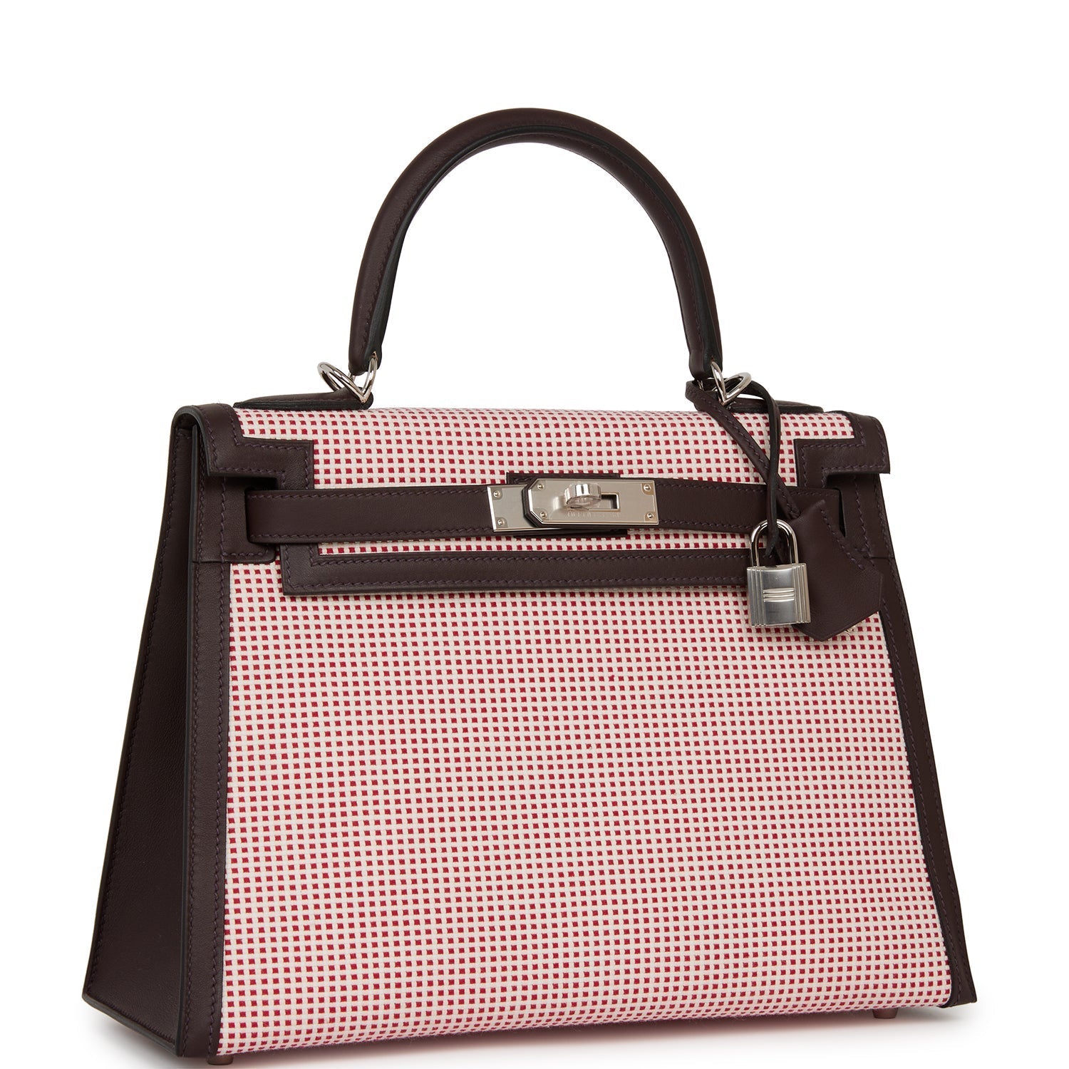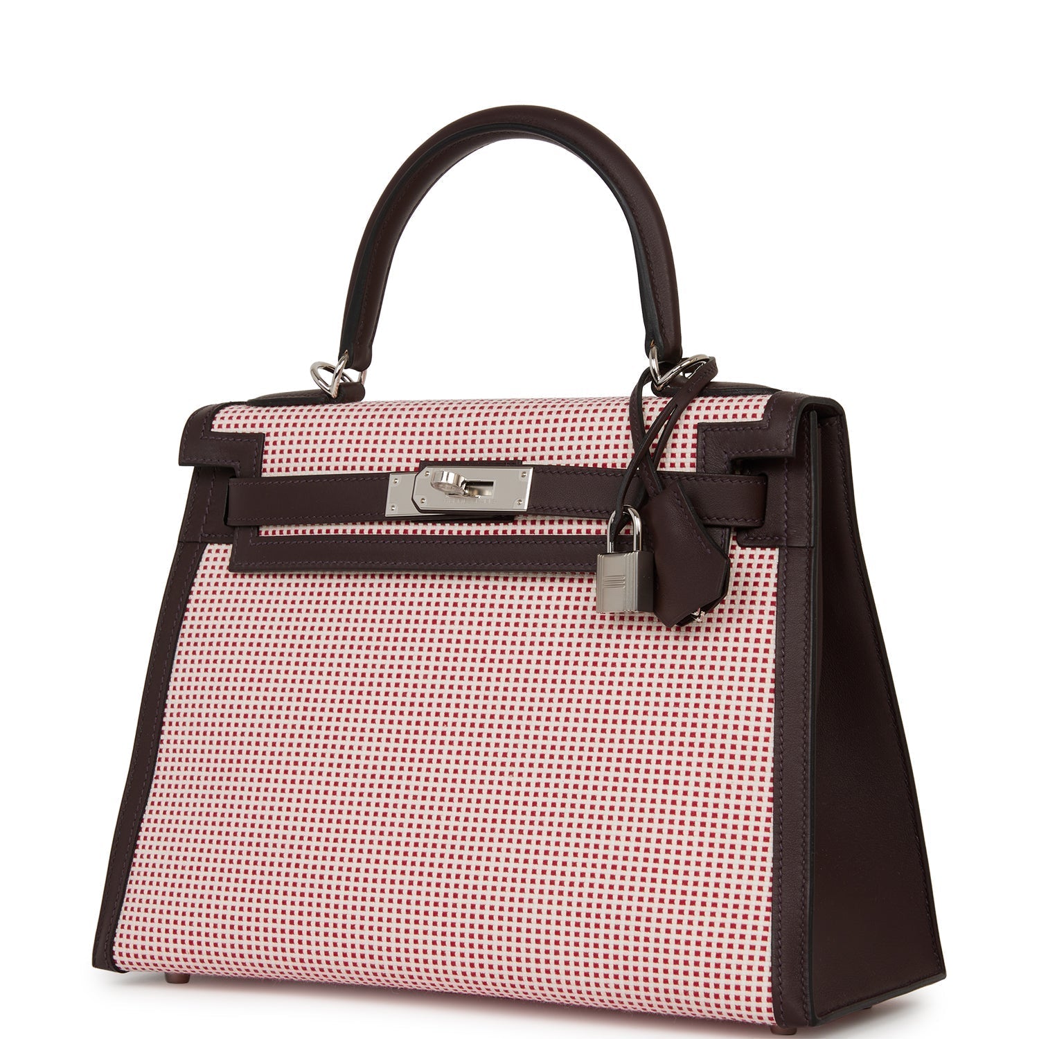 Sellier Kelly is of Rouge Sellier, Framboise and Ecru toile and swift leather with palladium hardware and features tonal stitching, front flap, two straps with center toggle closure, clochette with lock and two keys, single rolled handle and removable leather shoulder strap.