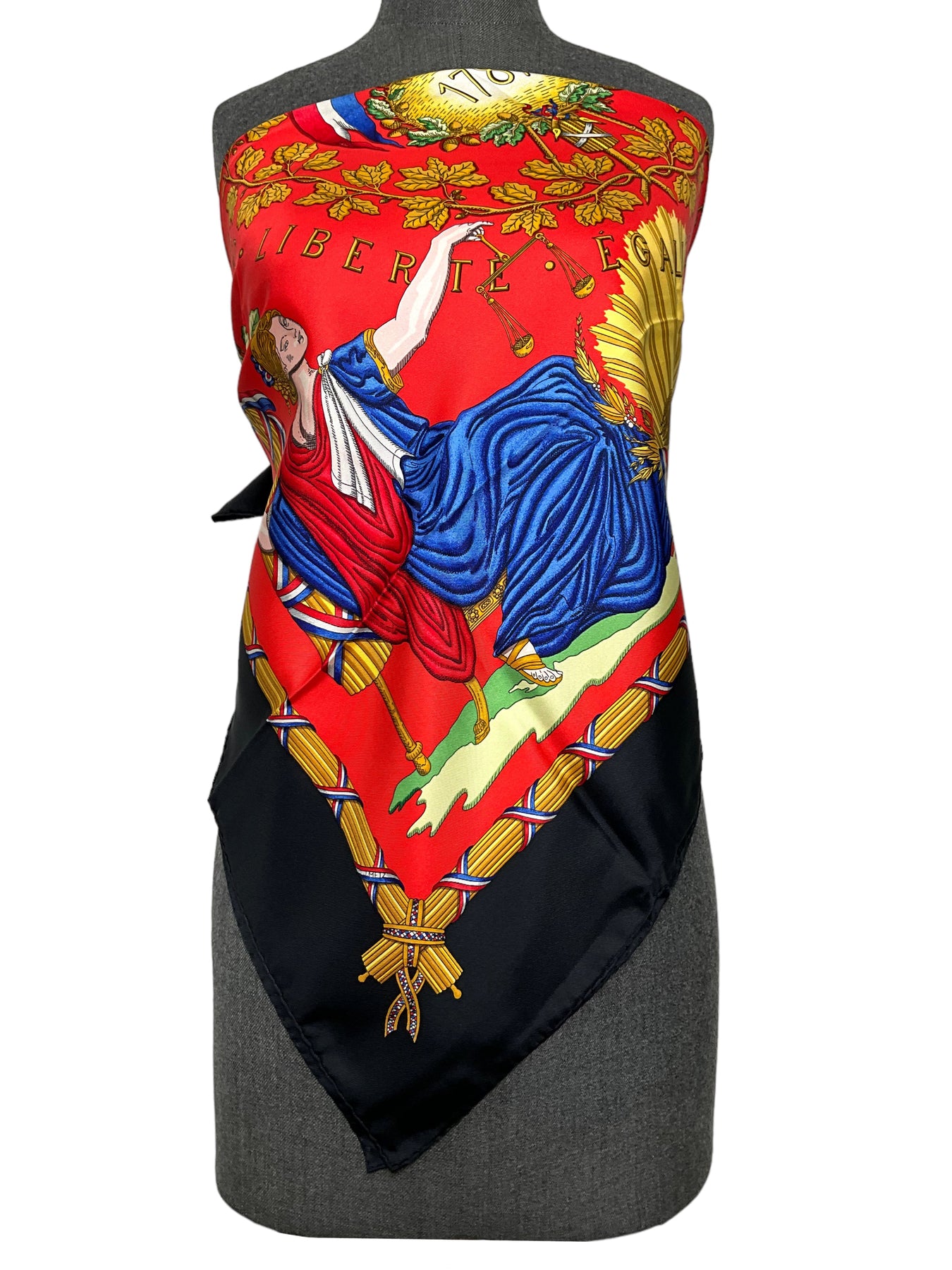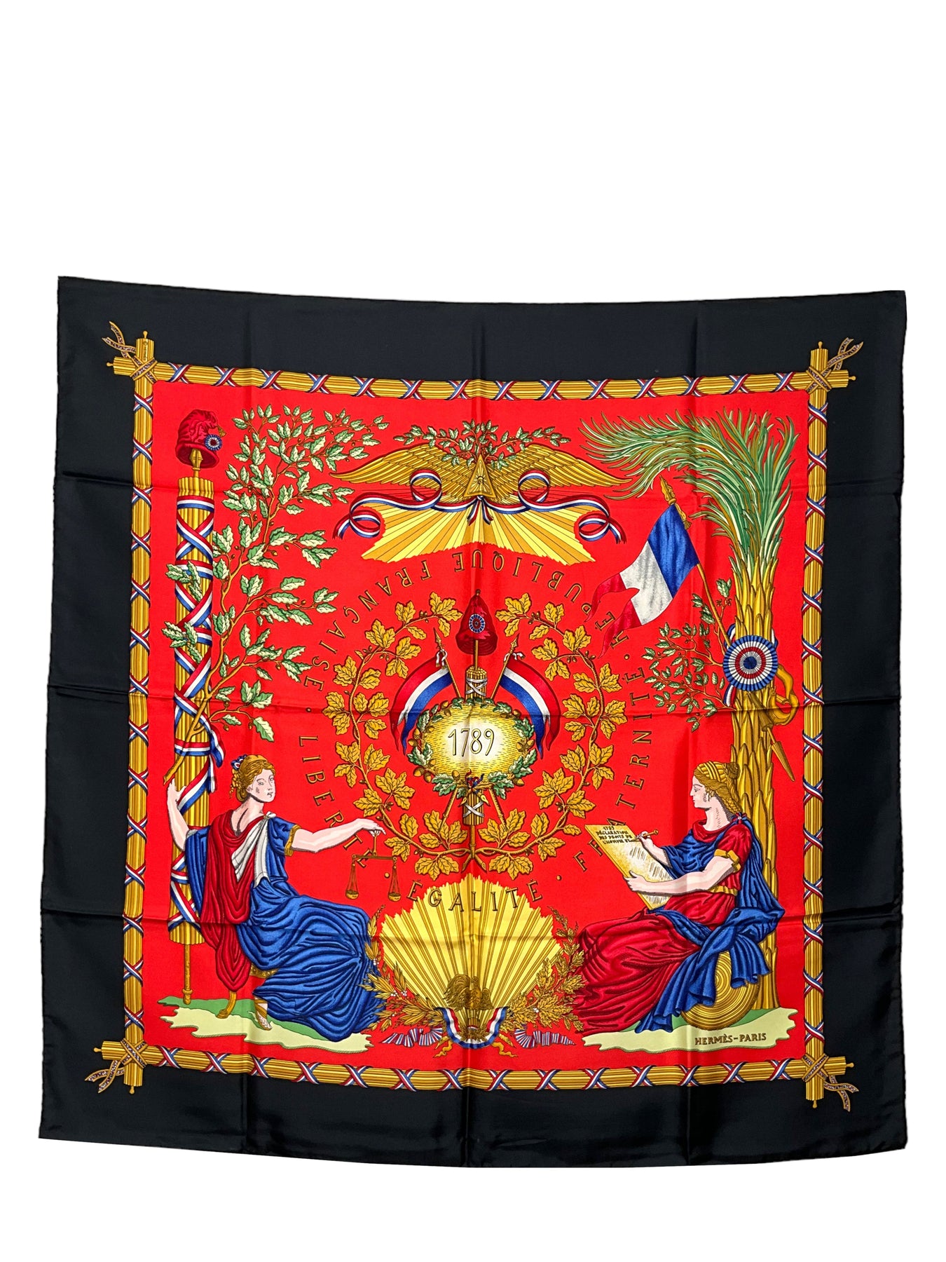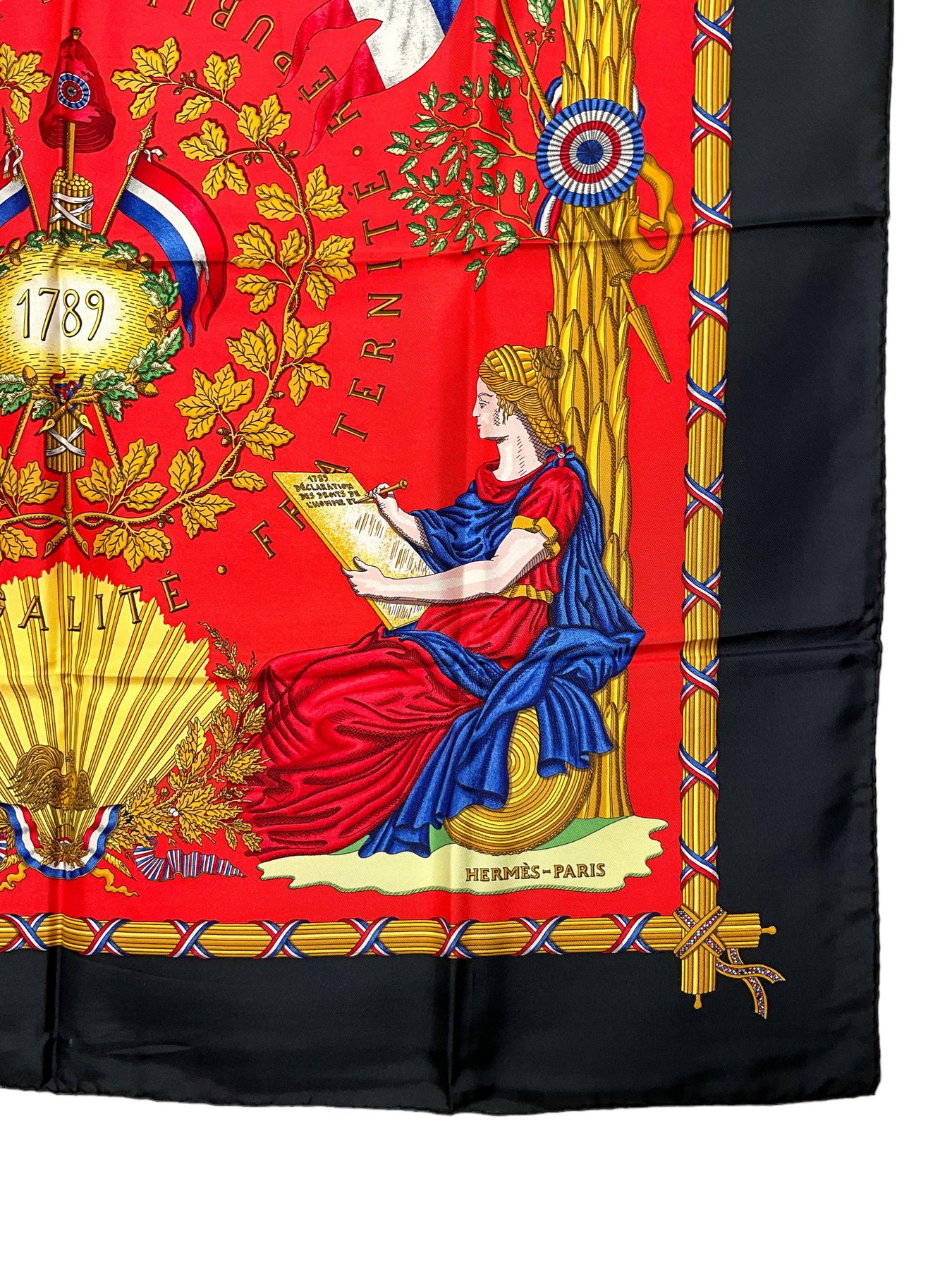 We the ity of this Hermes Republique Francaise Silk Scarf 90 designed by Joachim Metz and first issued in1989 features a red and black background.