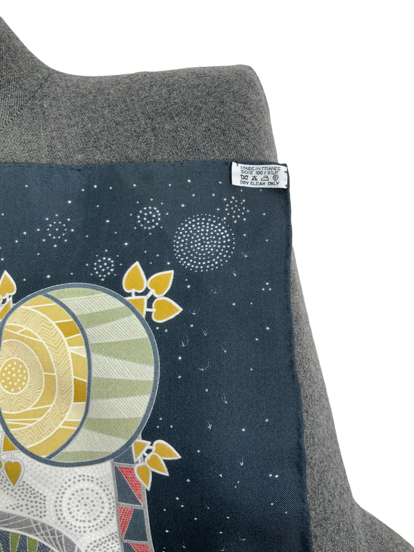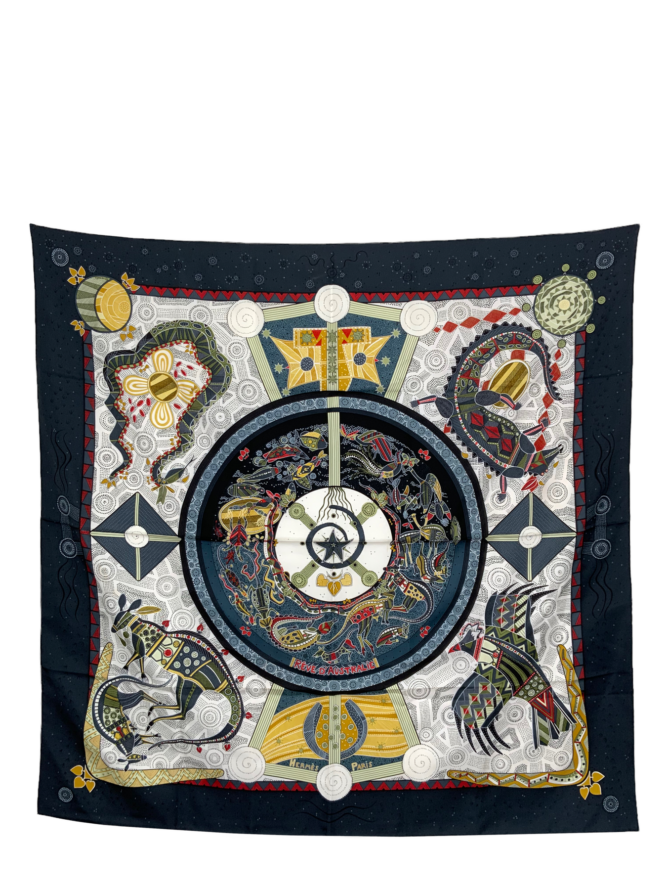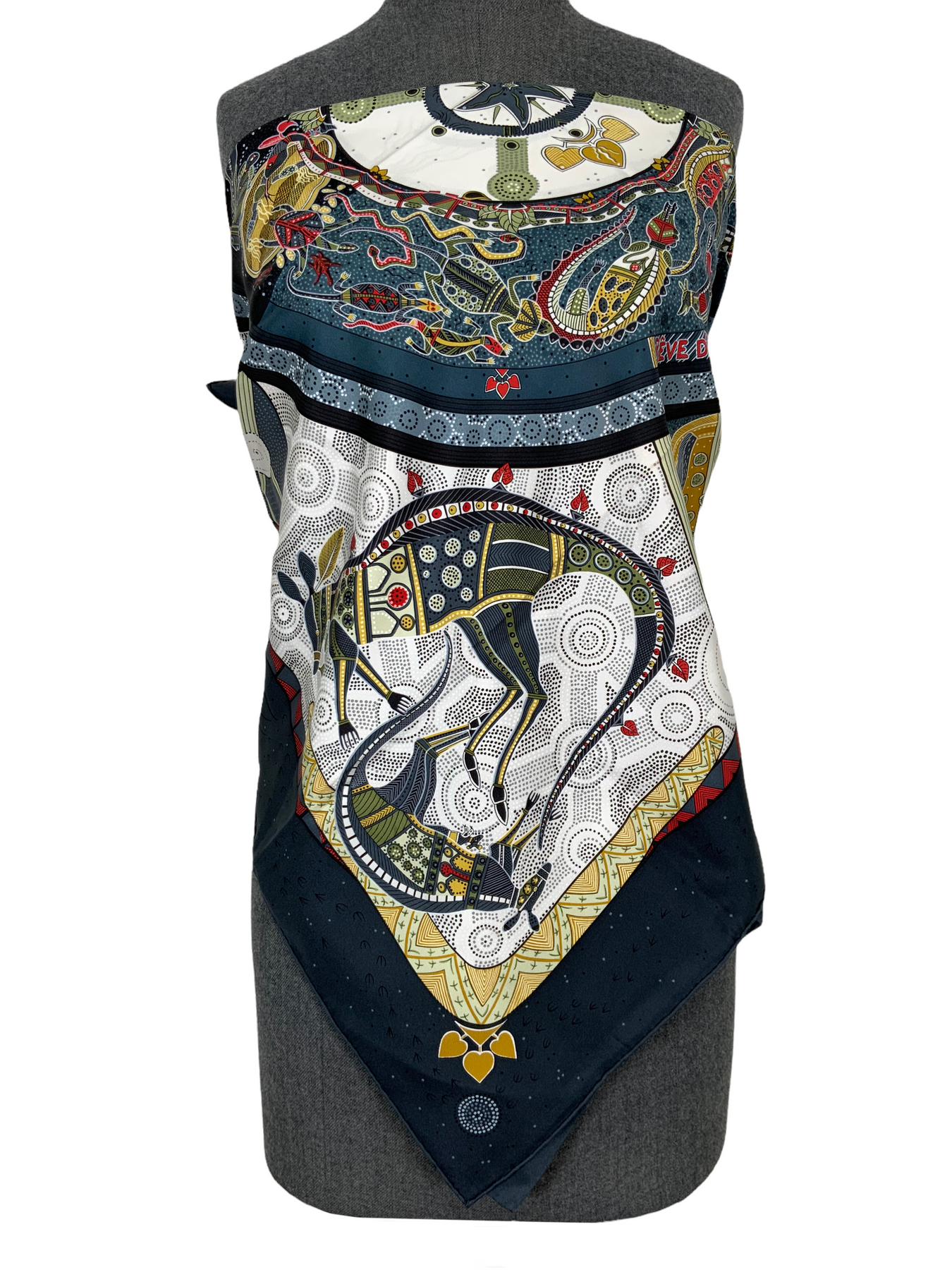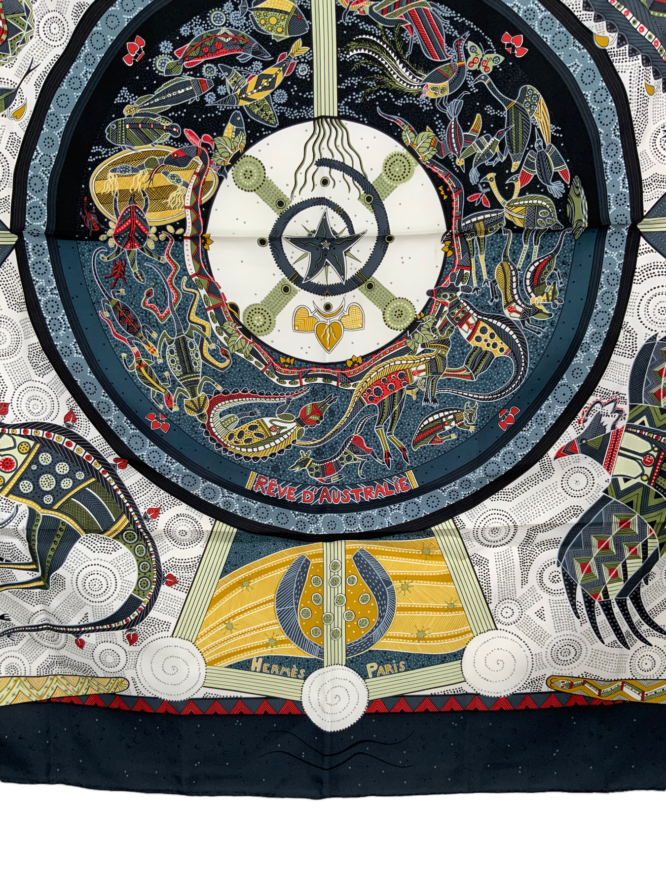 We the ity of this gorgeous HERMES Reve d'Australie Silk Scarf 90 which translates to the 'Dream of Australia'. This beautiful scarf was originally designed by Zoe Pauwels and was first issued back in 1999. It features an aboriginal art motif on a beautiful charcoal gray silk background with hand-rolled edges.