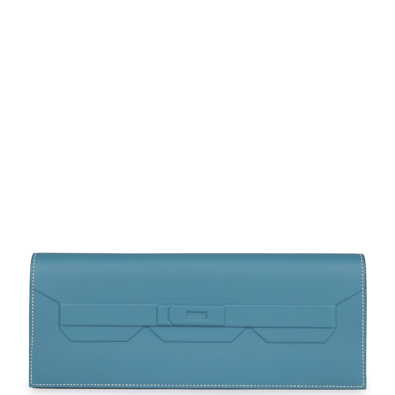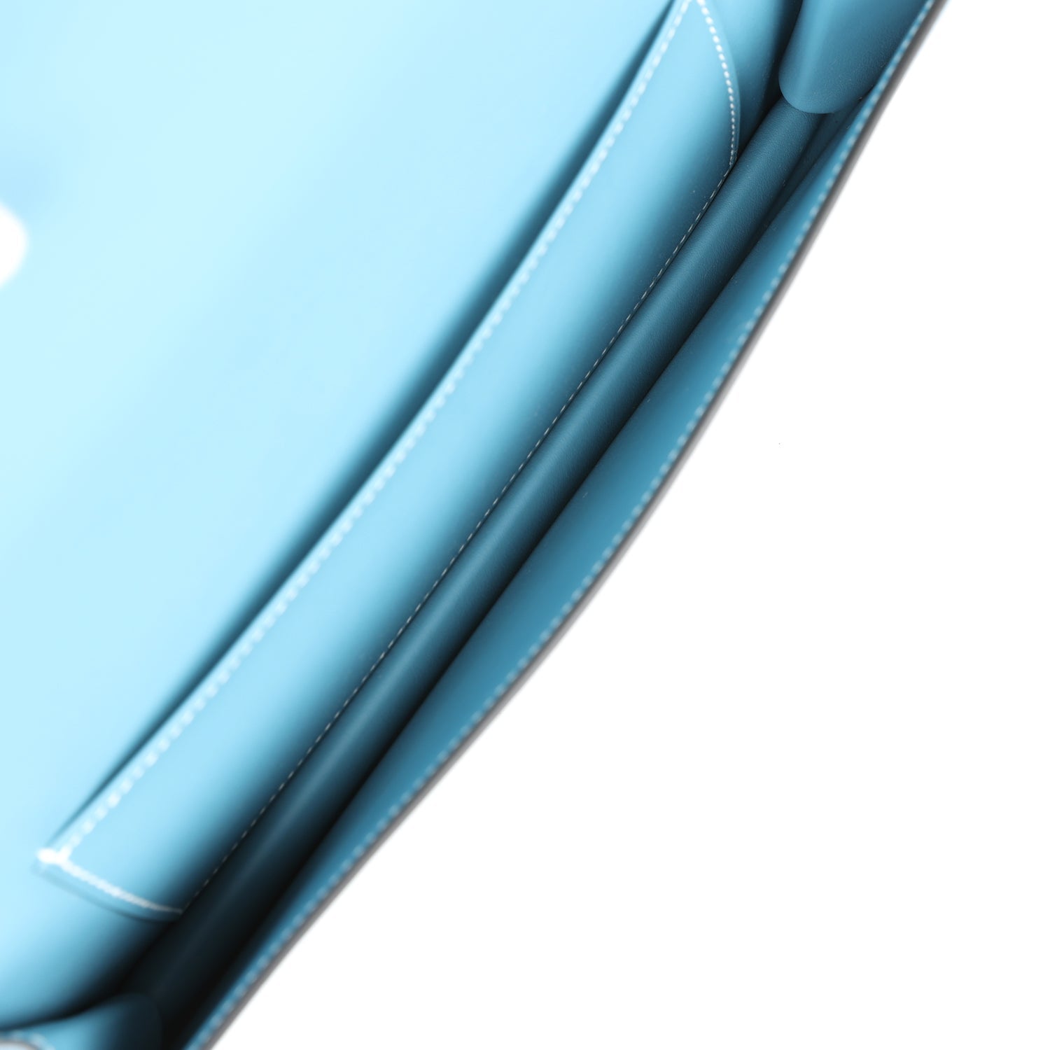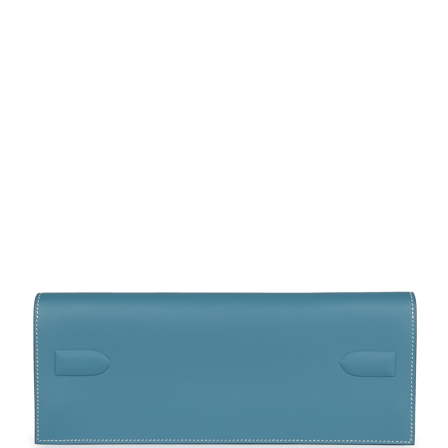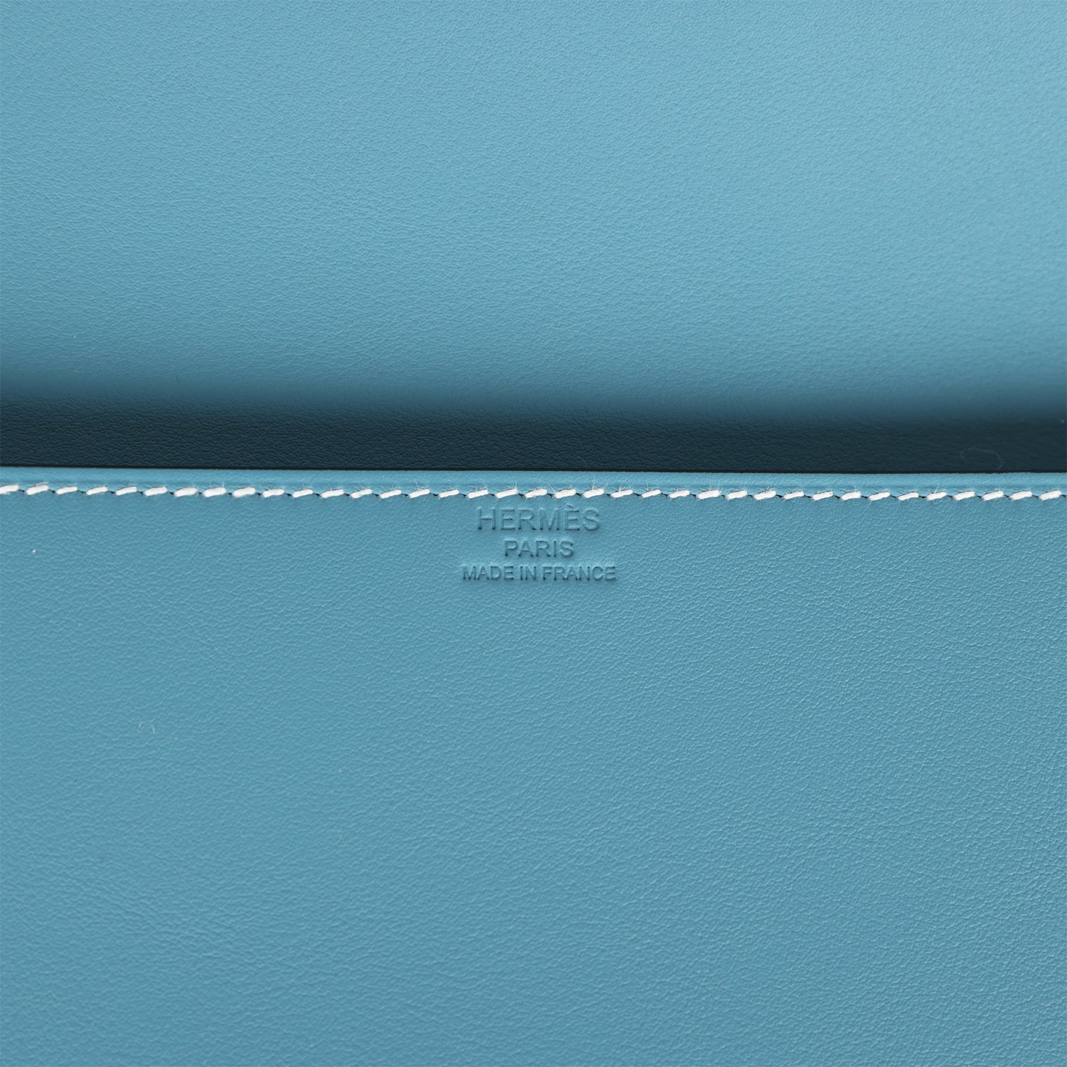 This Kelly Cut Shadow is in Blue Jean swift leather and has white contrast stitching, embossed straps with embossed front toggle closure.