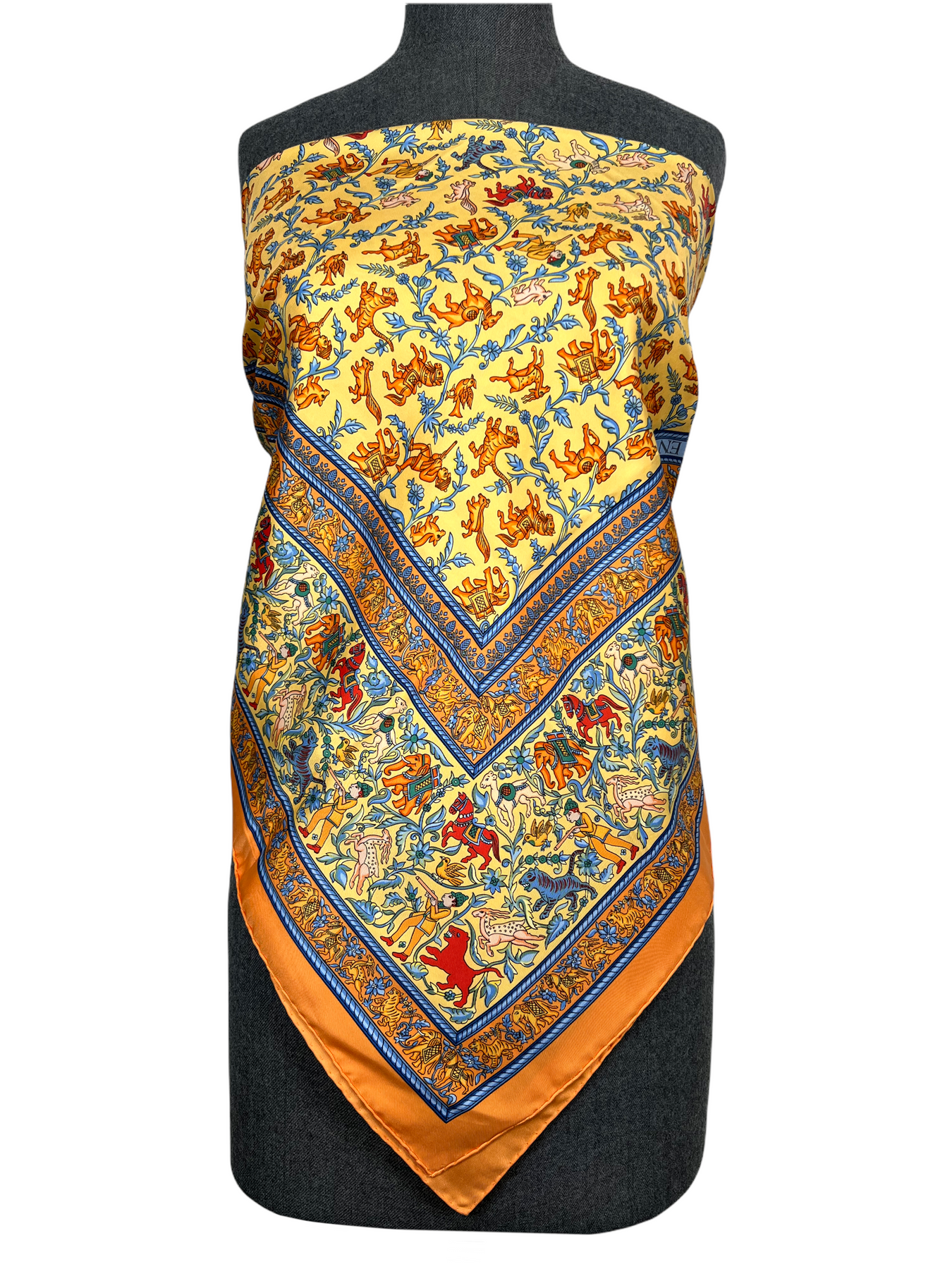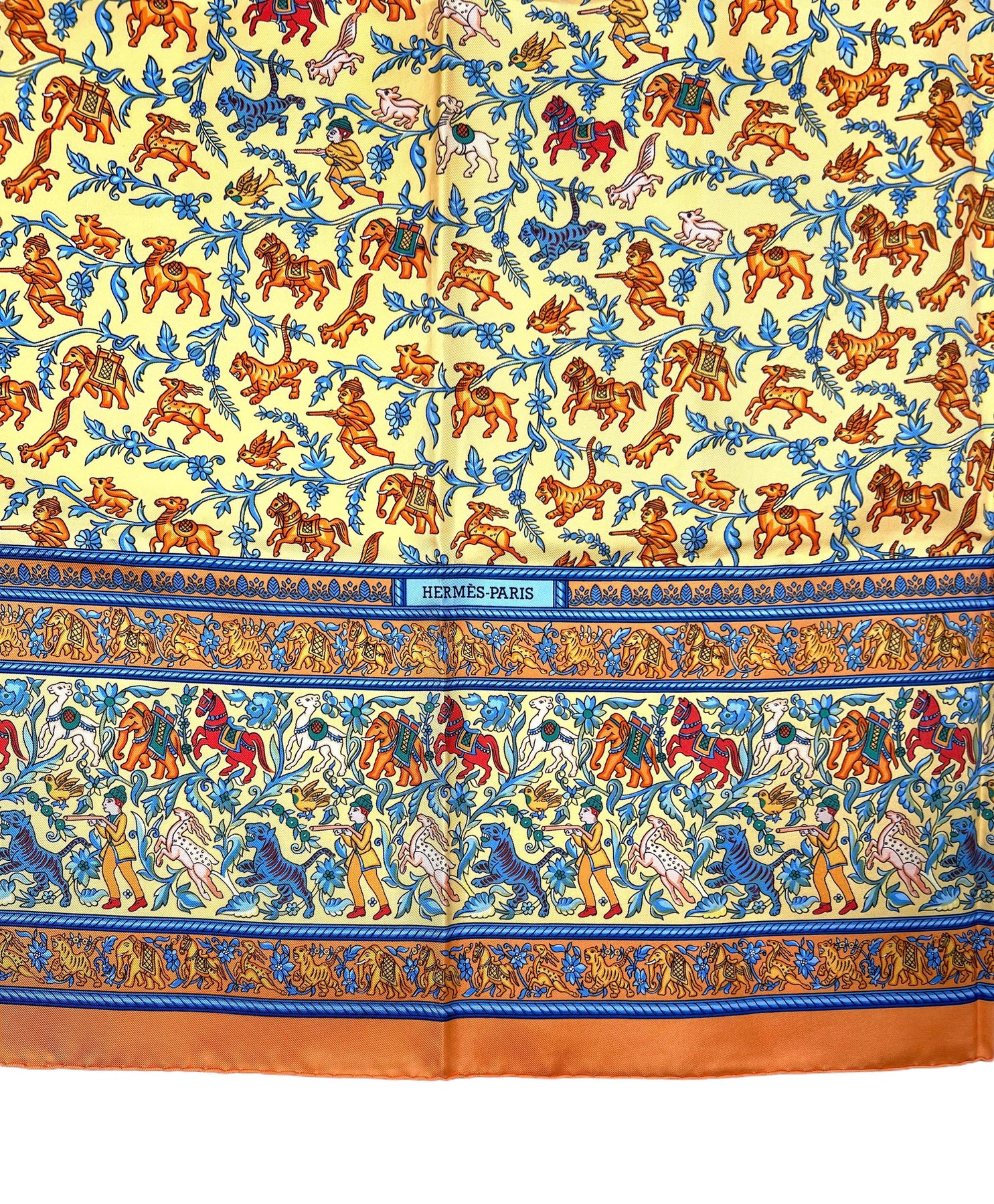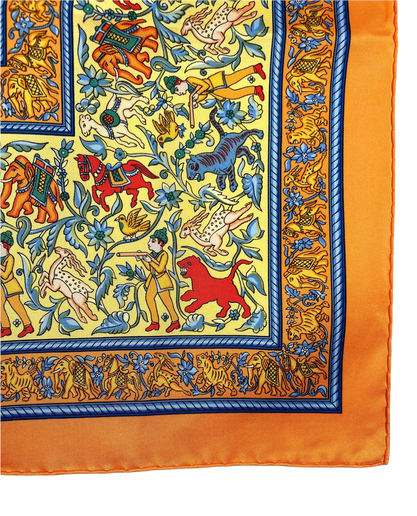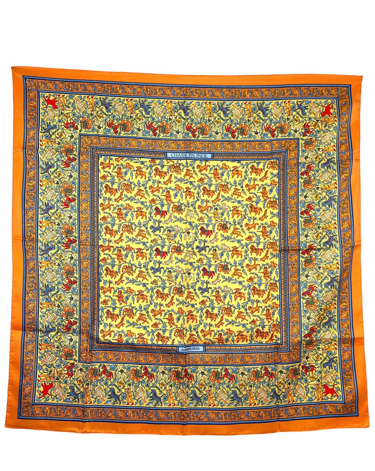 We the ity of this never before chic Hermes Silk Chasse En Inde Scarf 90 designed by Michele Duchene in 1985/1986 which translates to "Hunting in India". This scarf shows a beautiful graphic design of small little animal characters and hunters on a lovely orange background with hand-rolled edges.