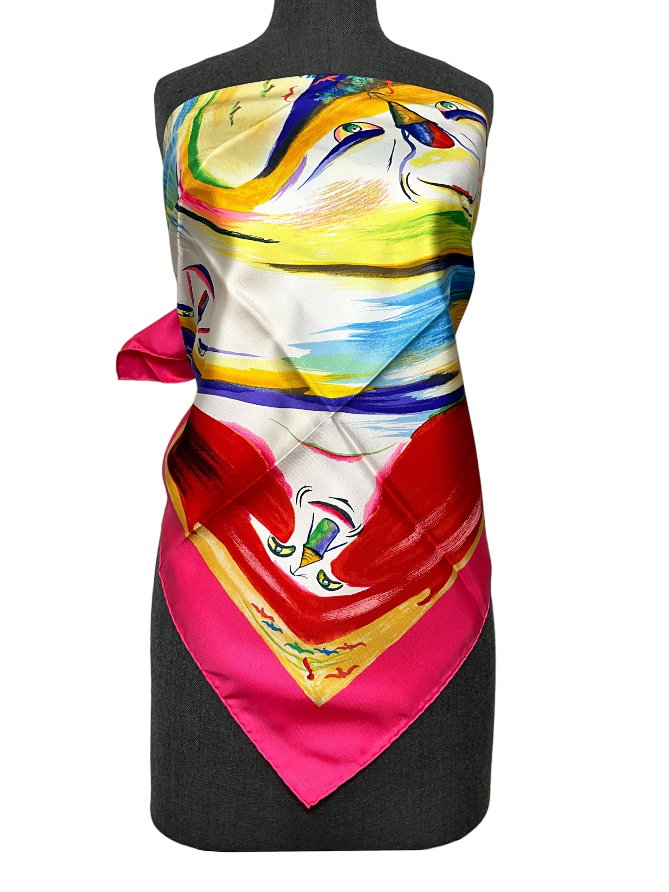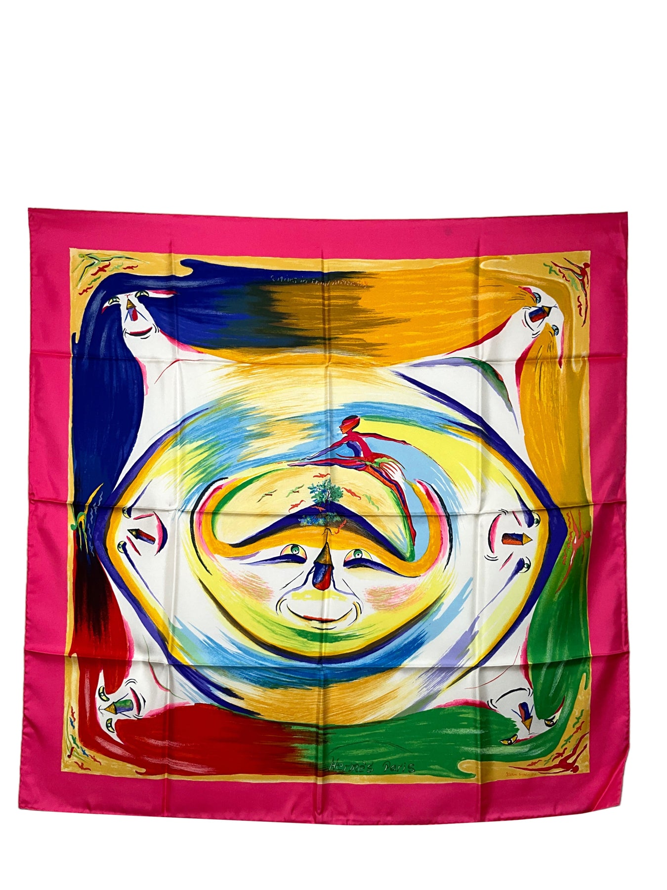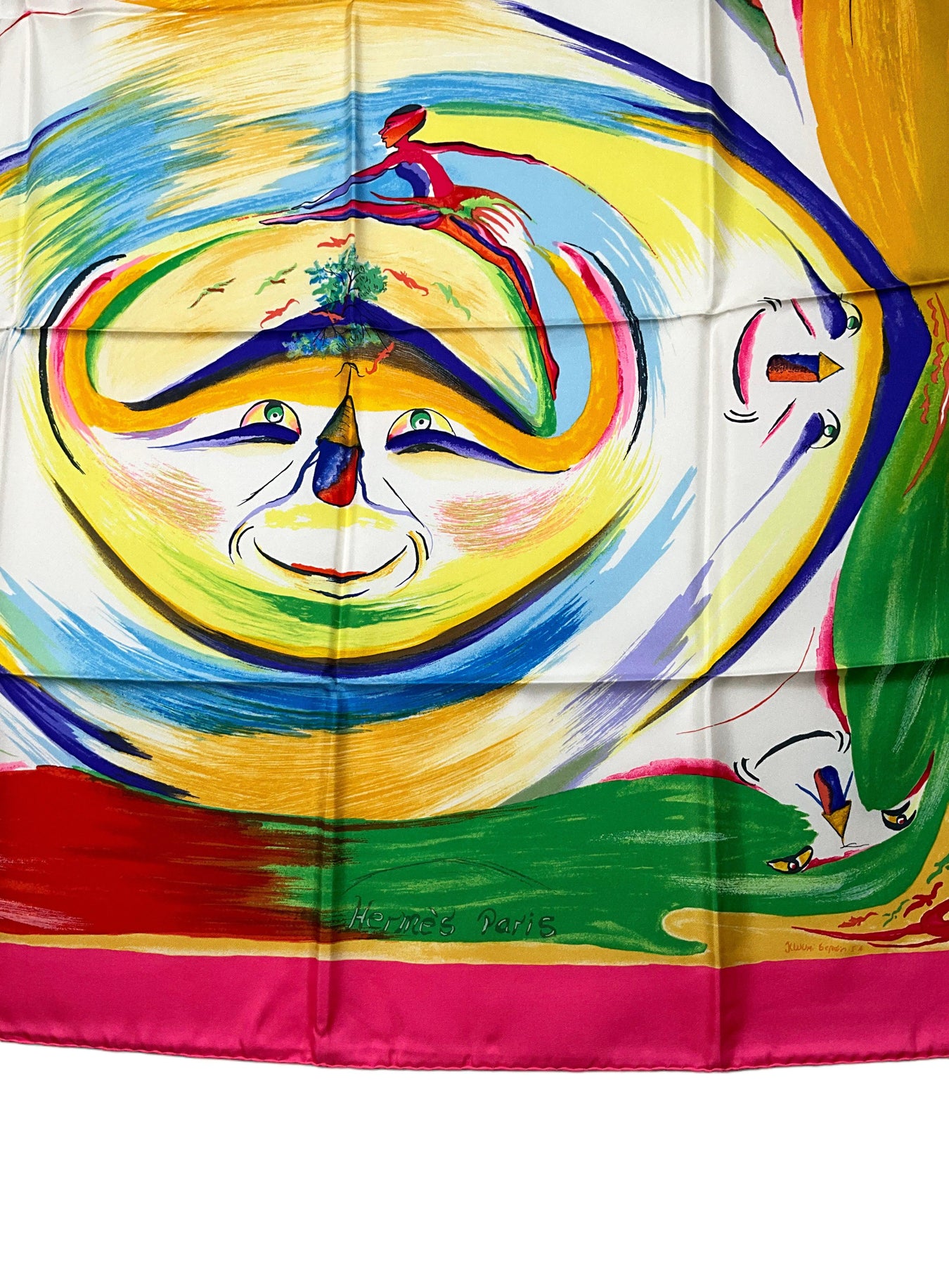 We the ity of this HERMES Smiles in Third Millenary Silk Scarf 90 designed by Sefedine Ibrahim Alamin featuring a bright pink background with a large smiling face motif.