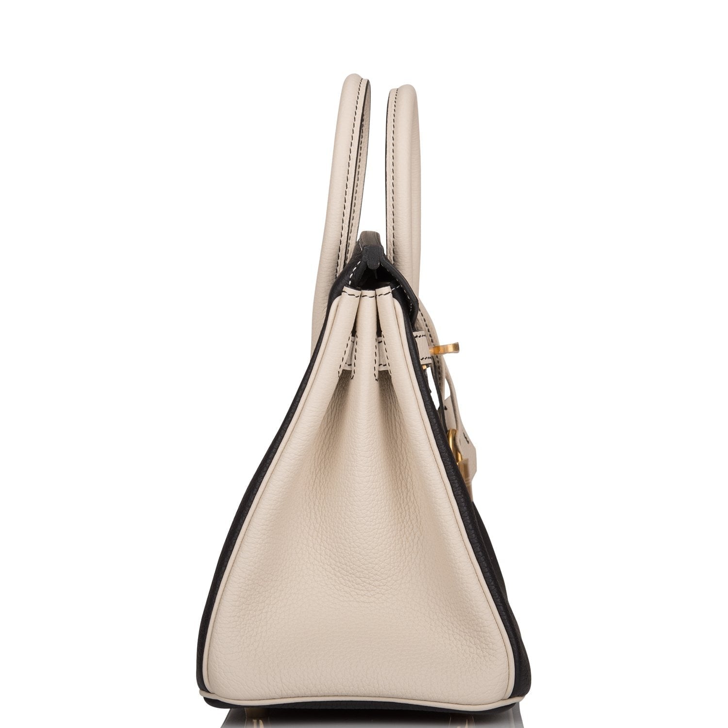 This Birkin is in Black and Craie togo leather with brushed gold hardware and has contrast stitching, front flap, two straps with center toggle closure, clochette with lock and two keys, and double rolled handles.
