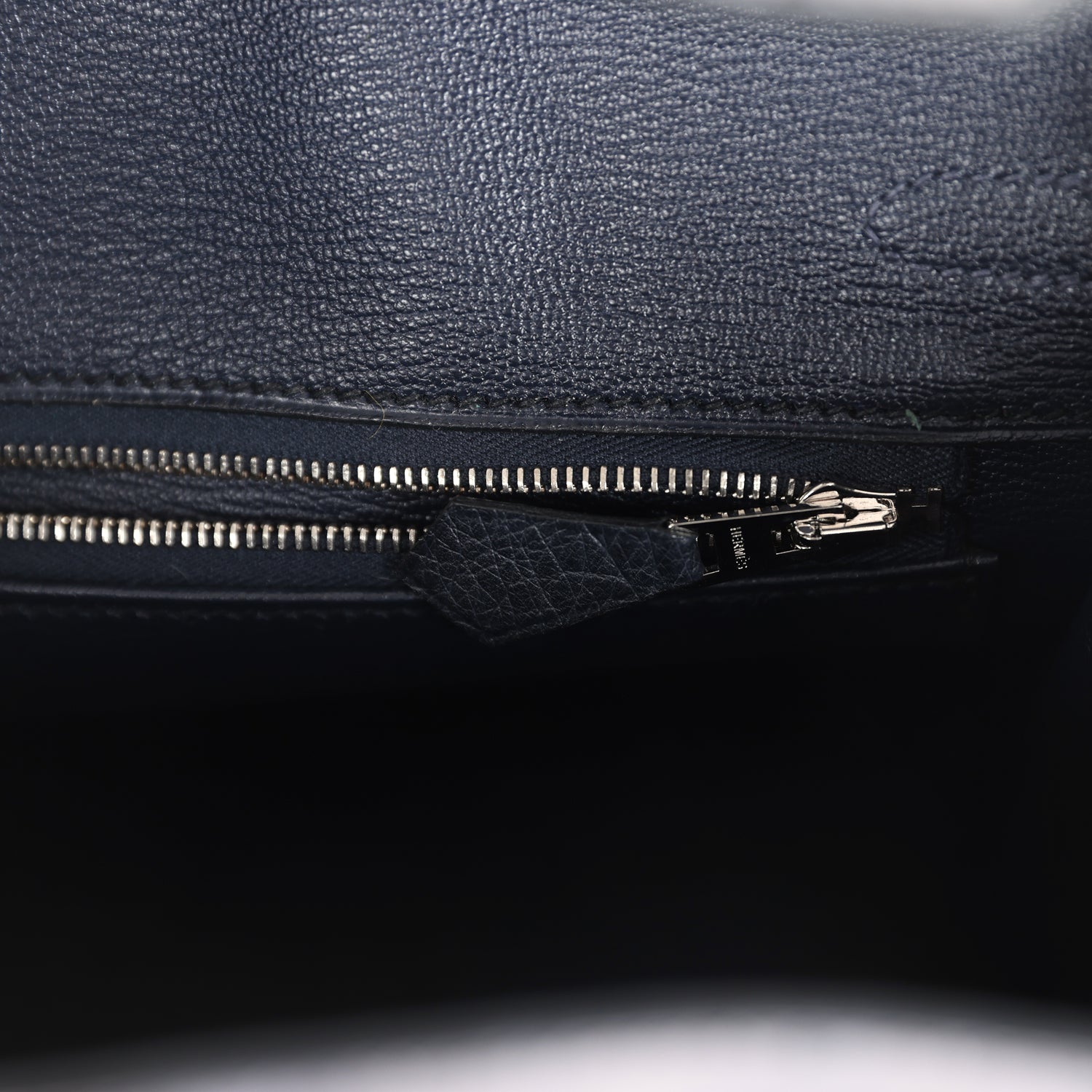 The interior is lined with Bleu Indigo chevre leather and has one zip pocket with an Hermes engraved zipper pull and an open pocket on the opposite side.