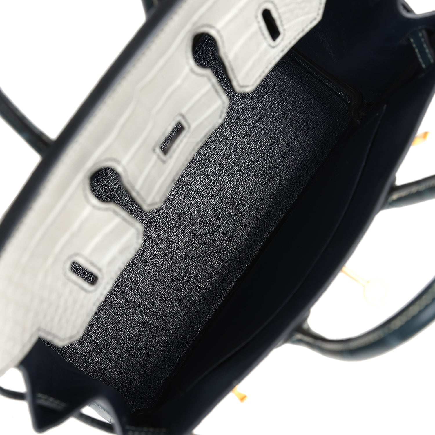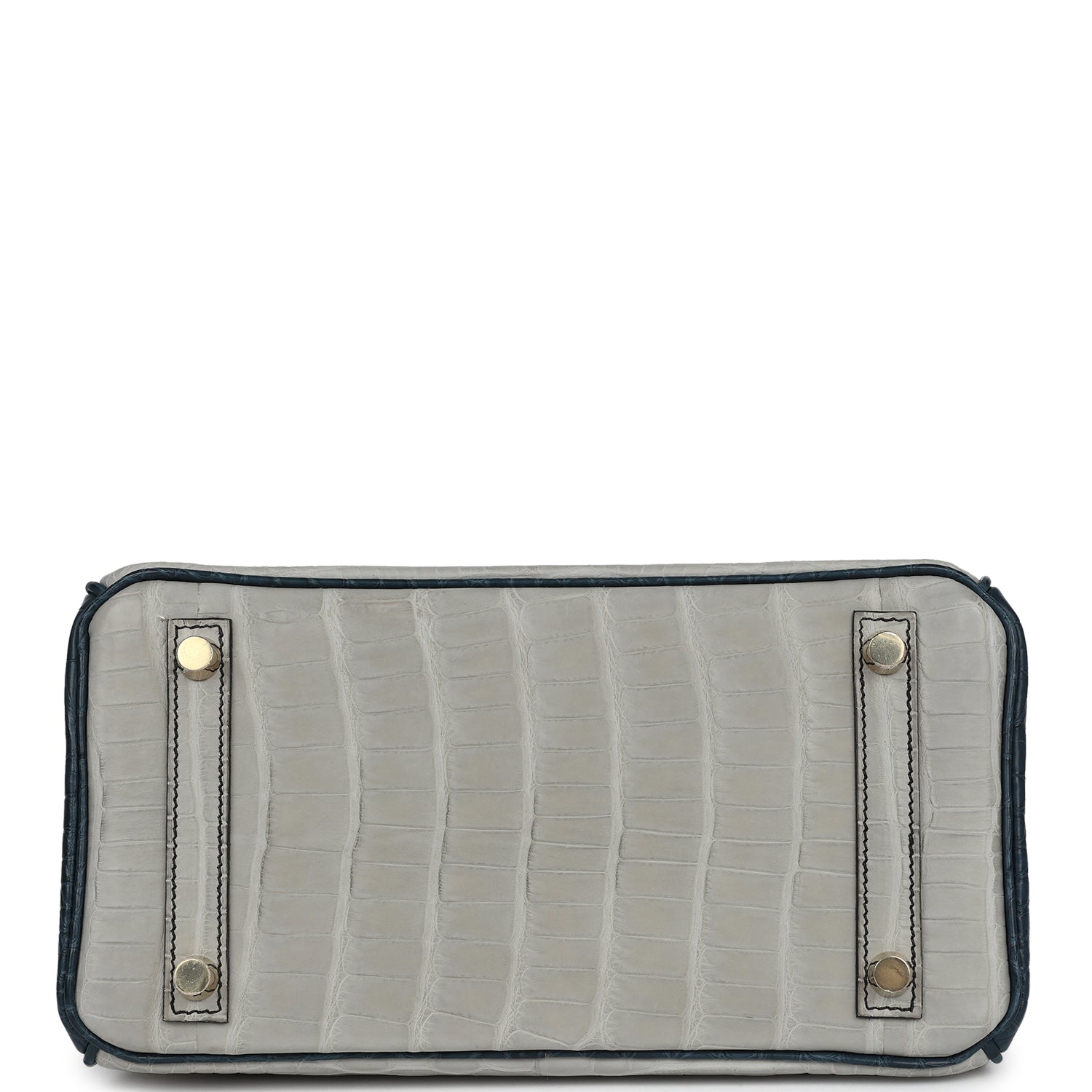 This Special Order Birkin is in Gris Perle and Vert Rousseau matte Mississippienis alligator leather with brushed gold hardware and has contrast stitching, front strap, two straps with center toggle closure, clochette with lock and two keys and double rolled handles.