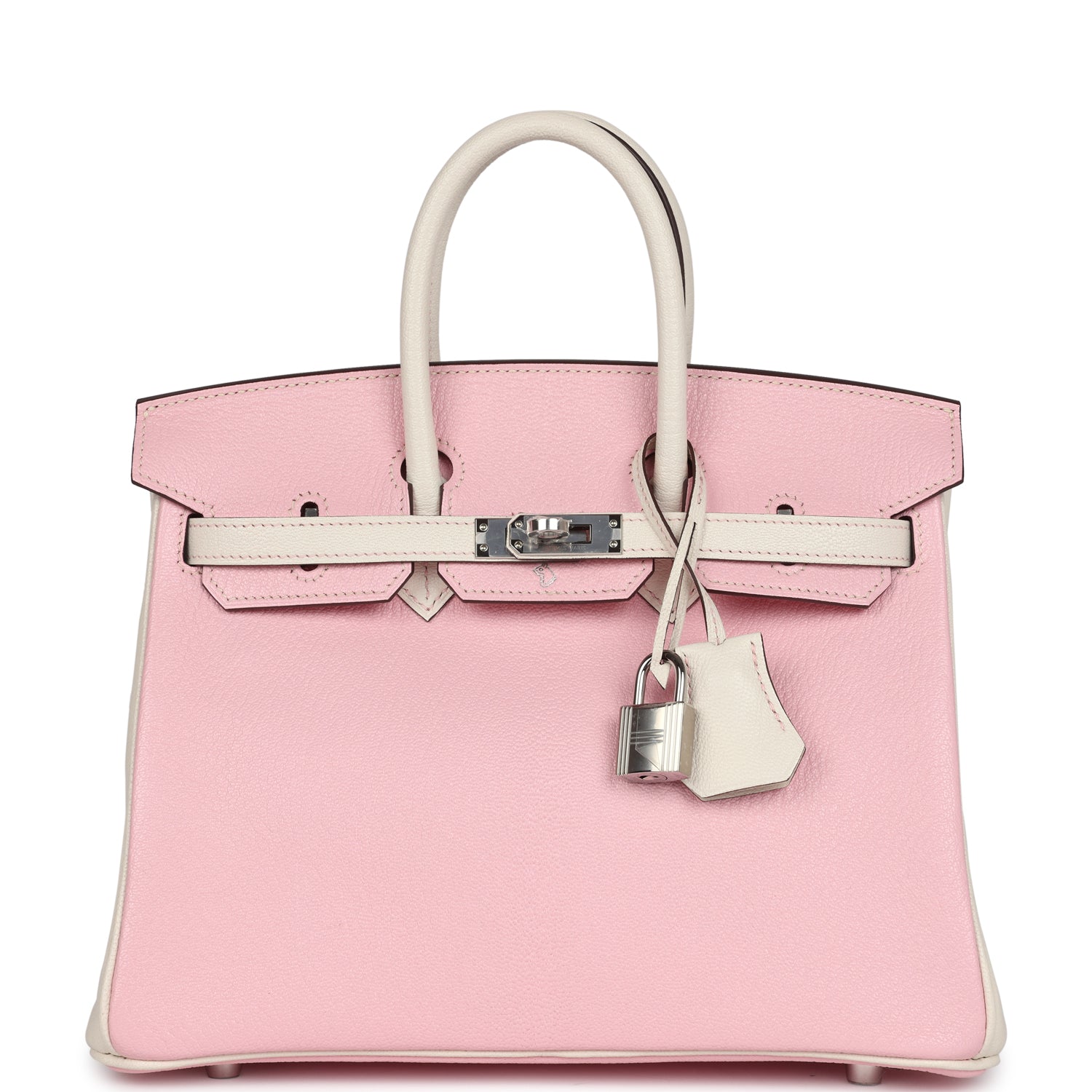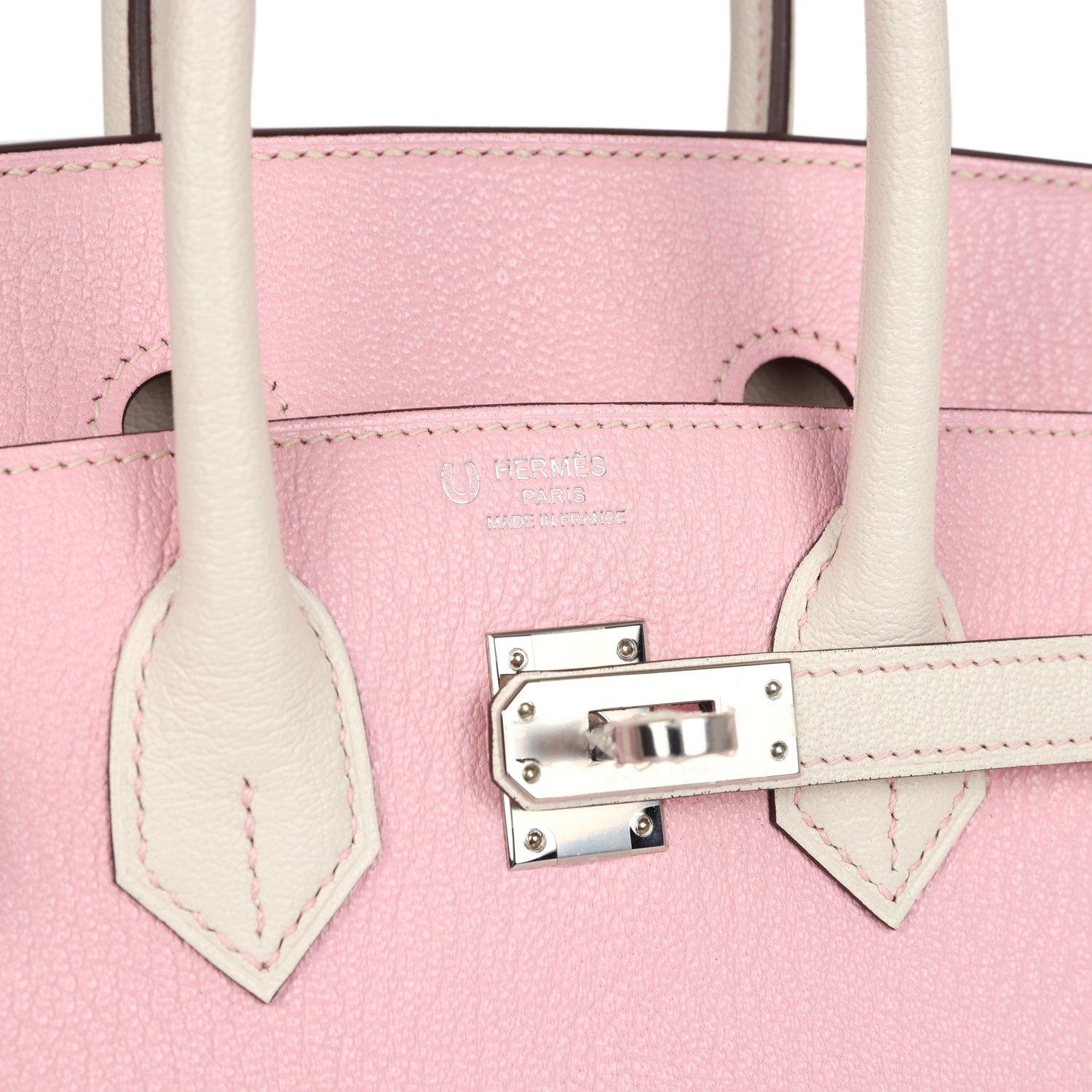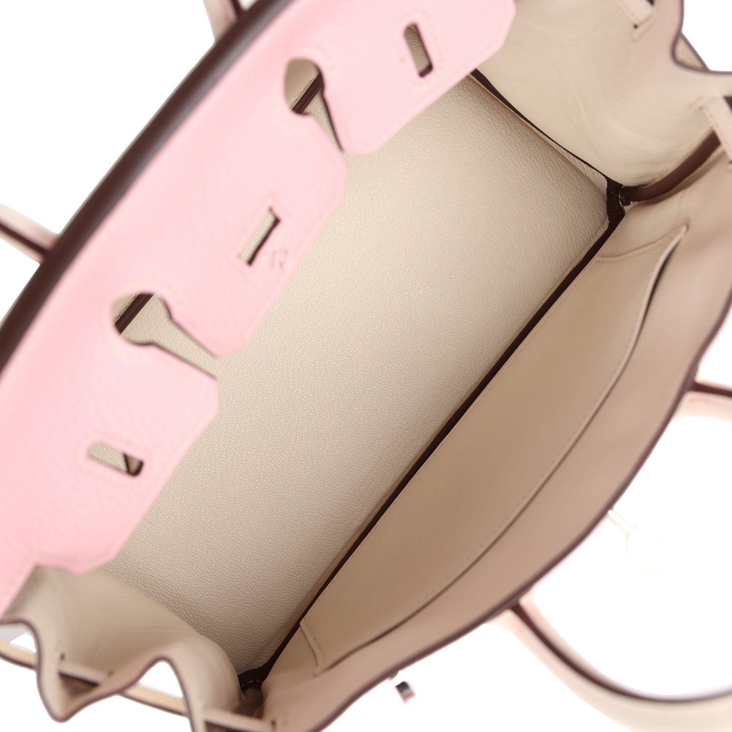 Special Order Birkin 25 is in Rose Sakura and Nata chevre mysore leather with palladium hardware and has contrast stitching, front flap, two straps with center toggle closure, clochette with lock and two keys, and double rolled handles.