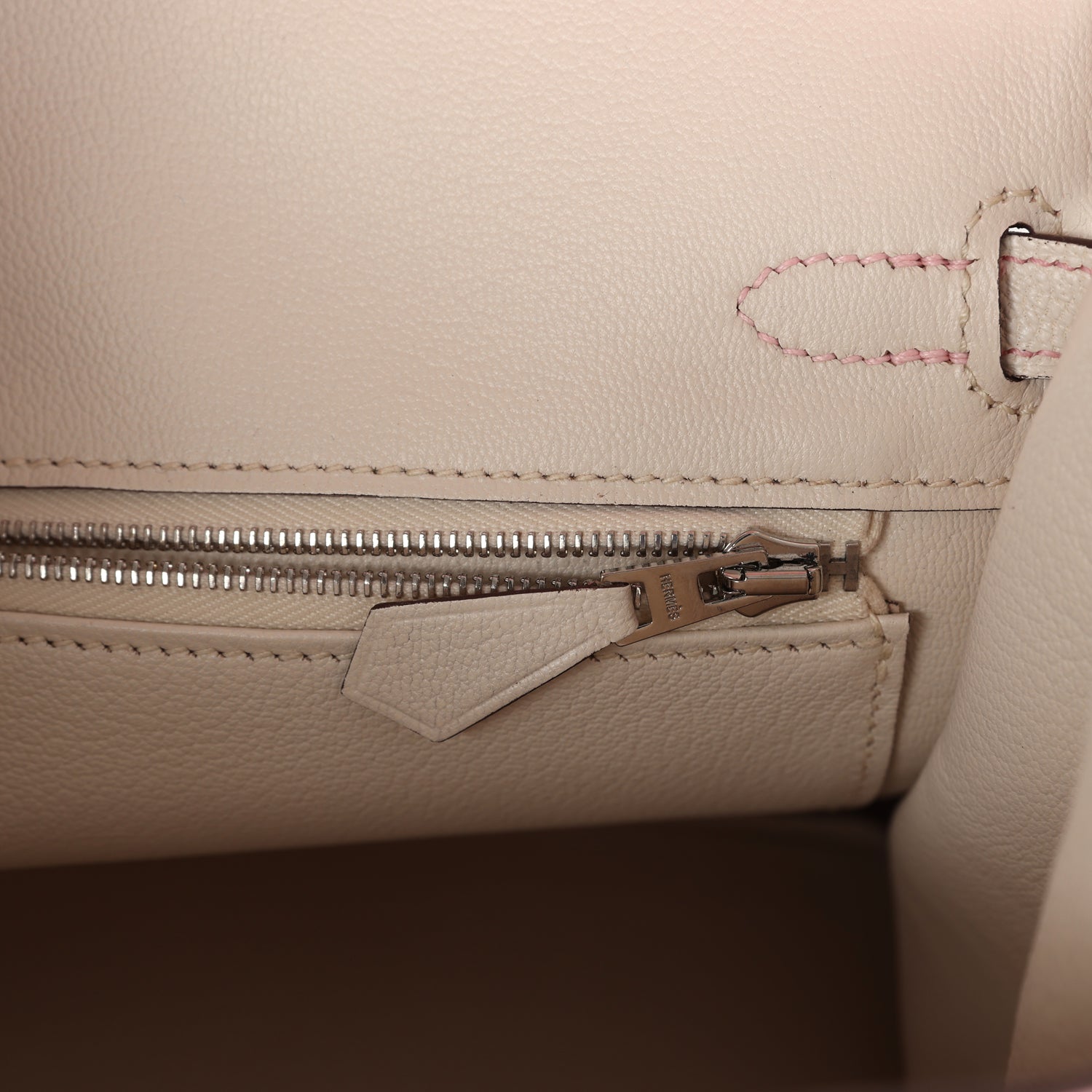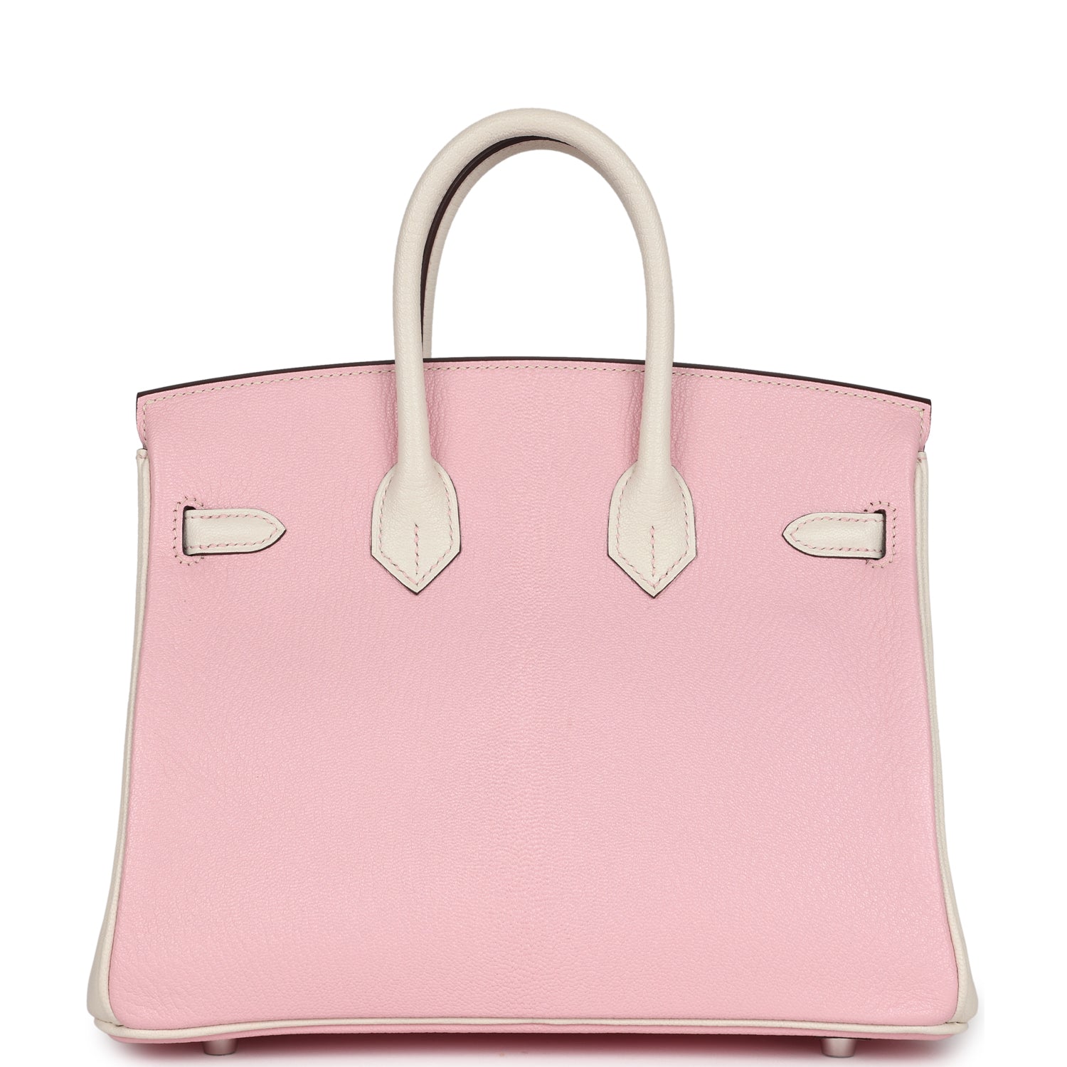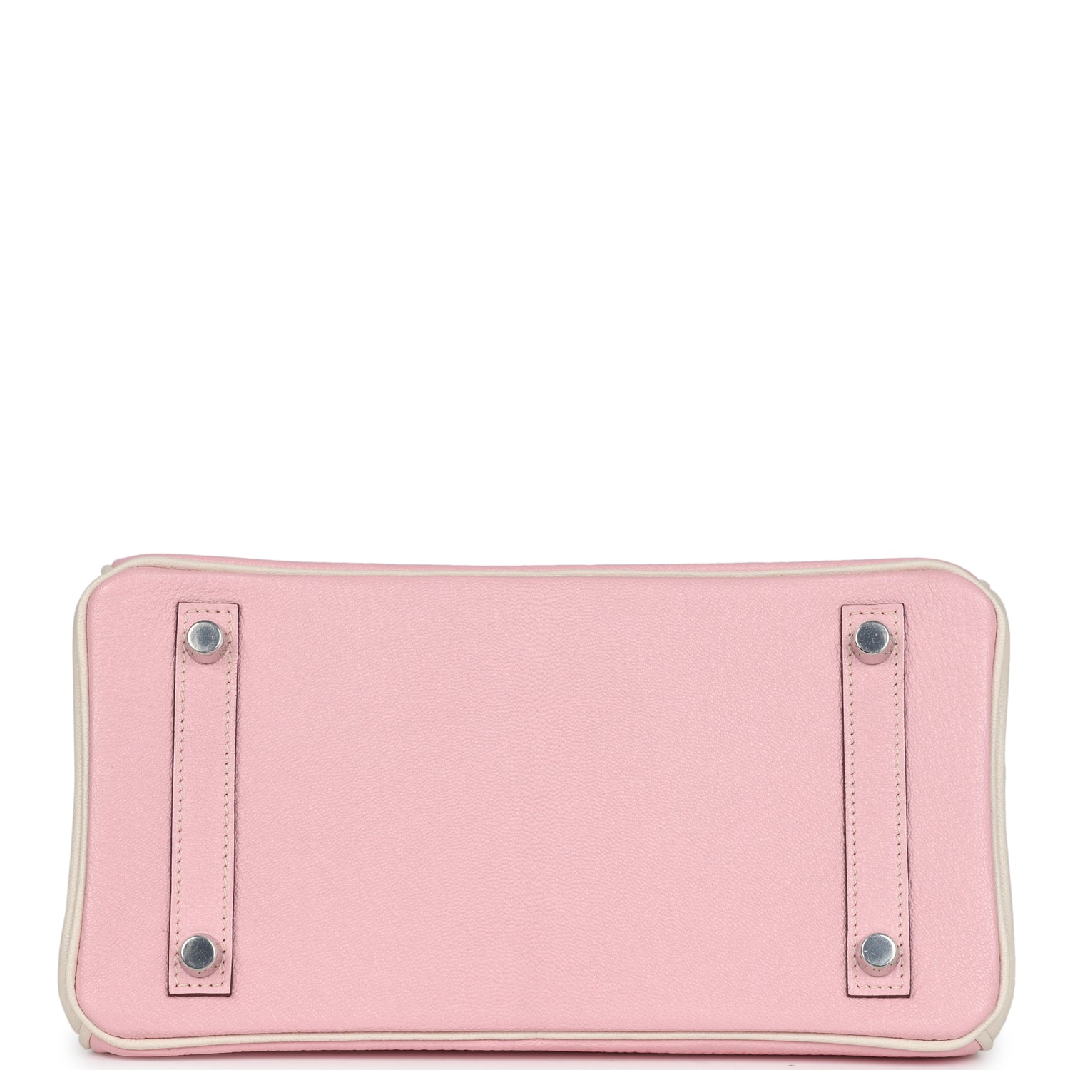 Special Order Birkin 25 is in Rose Sakura and Nata chevre mysore leather with palladium hardware and has contrast stitching, front flap, two straps with center toggle closure, clochette with lock and two keys, and double rolled handles.