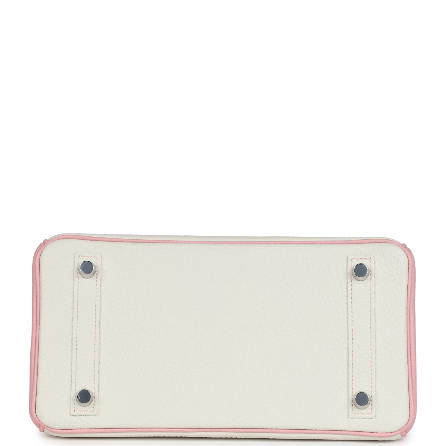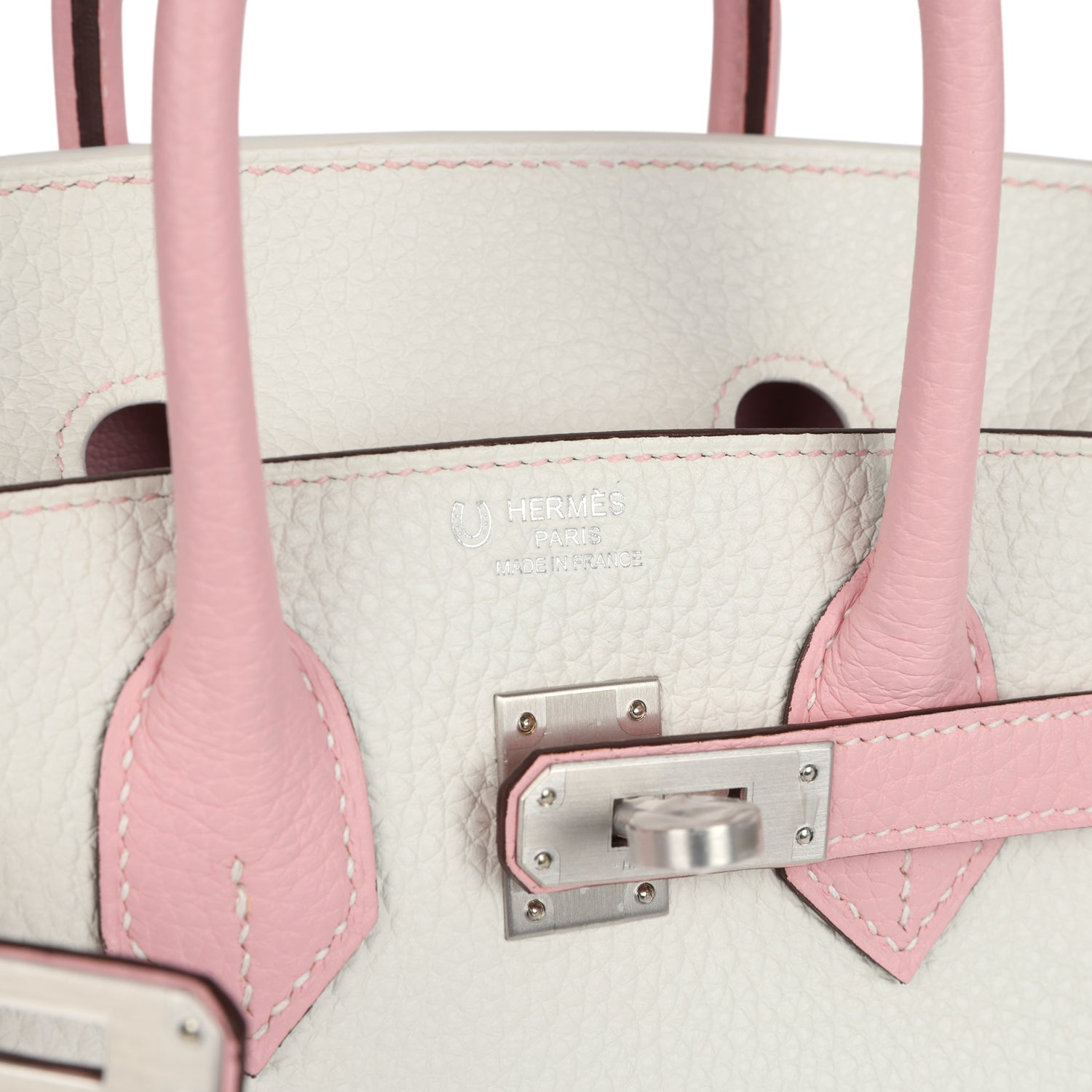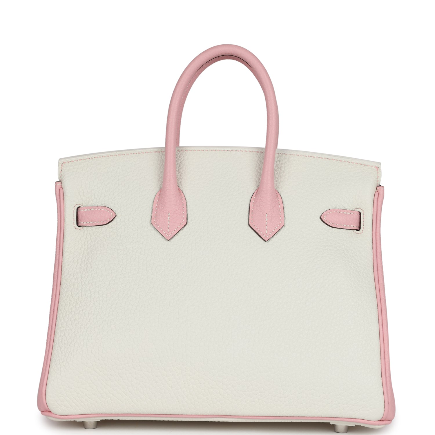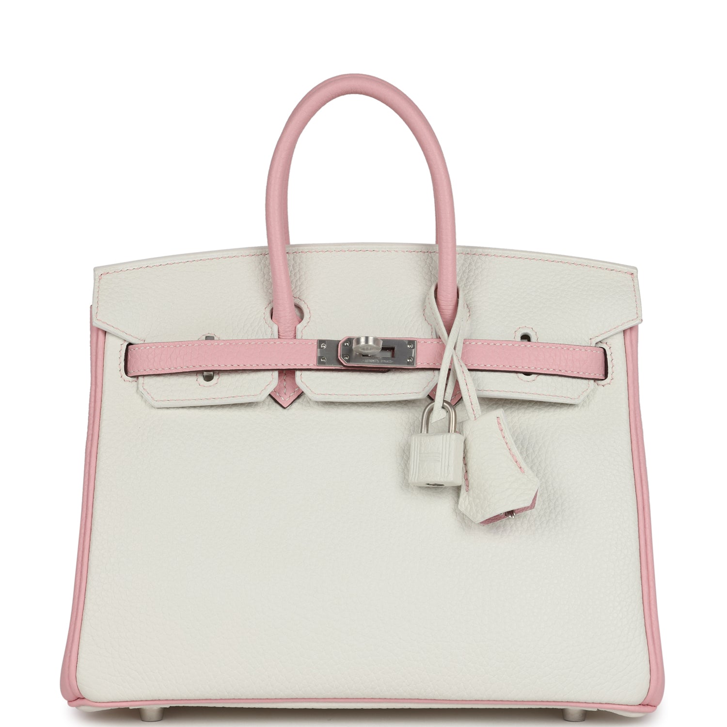 This Special Order Birkin is in White and Rose Sakura clemence leather with brushed palladium hardware, has contrast stitching, front flap, two straps with center toggle closure, clochette with lock and two keys, and double rolled handles.