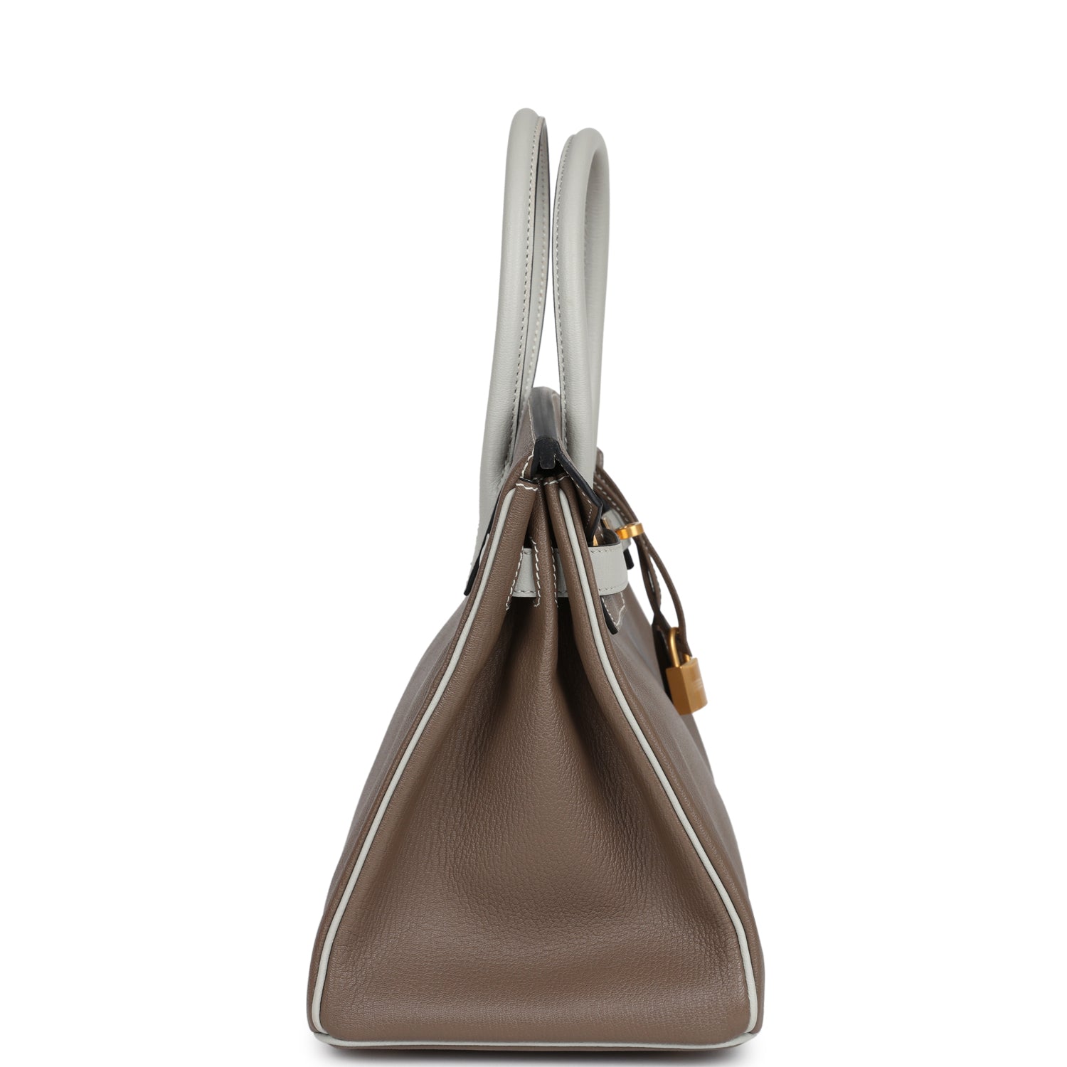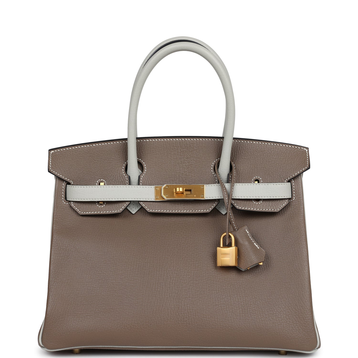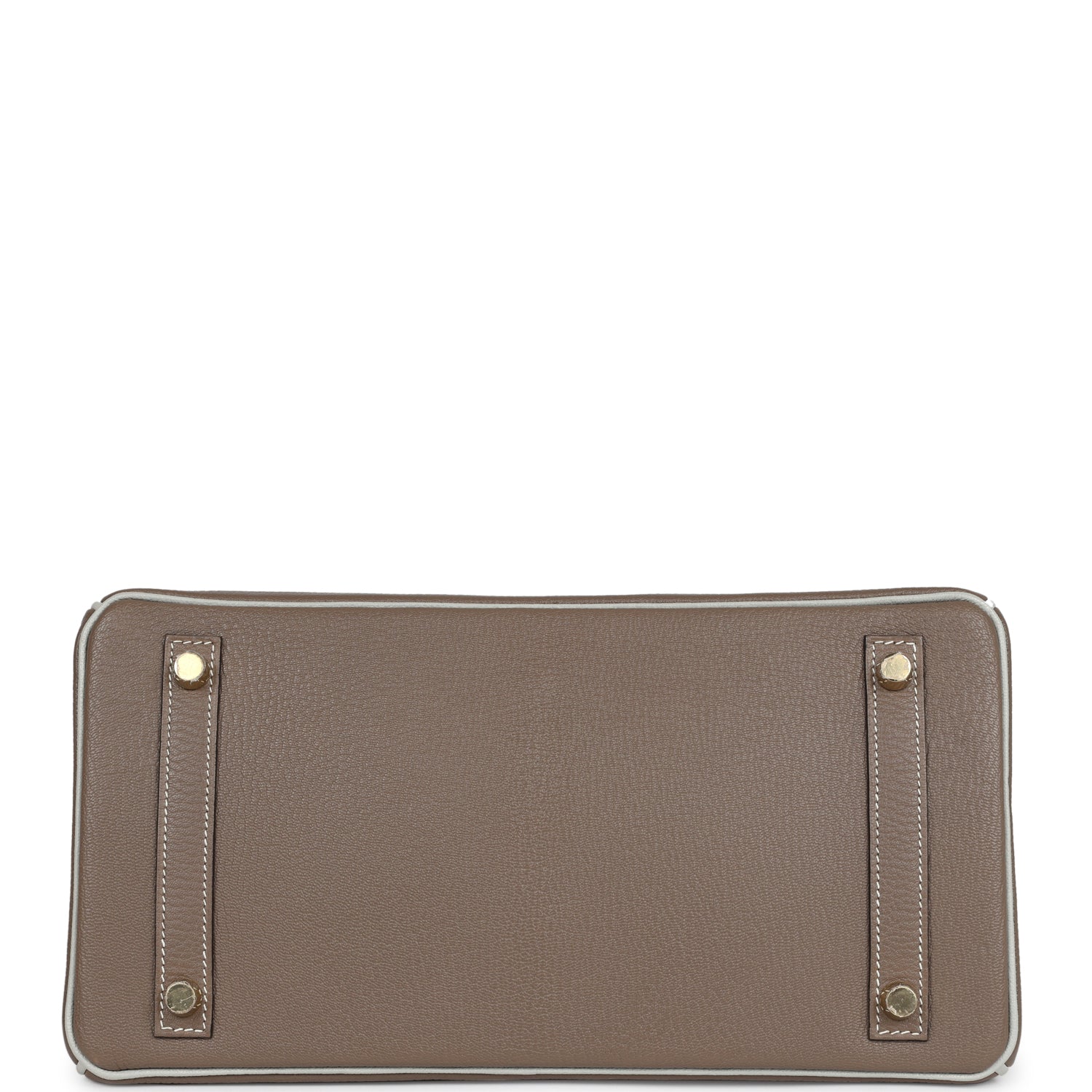 Special Order Birkin is in Etoupe and Gris Perle chevre mysore leather with brushed gold hardware and has contrast/tonal stitching, a front flap with two straps, front toggle closure, clochette with lock and two keys, and double rolled handles.