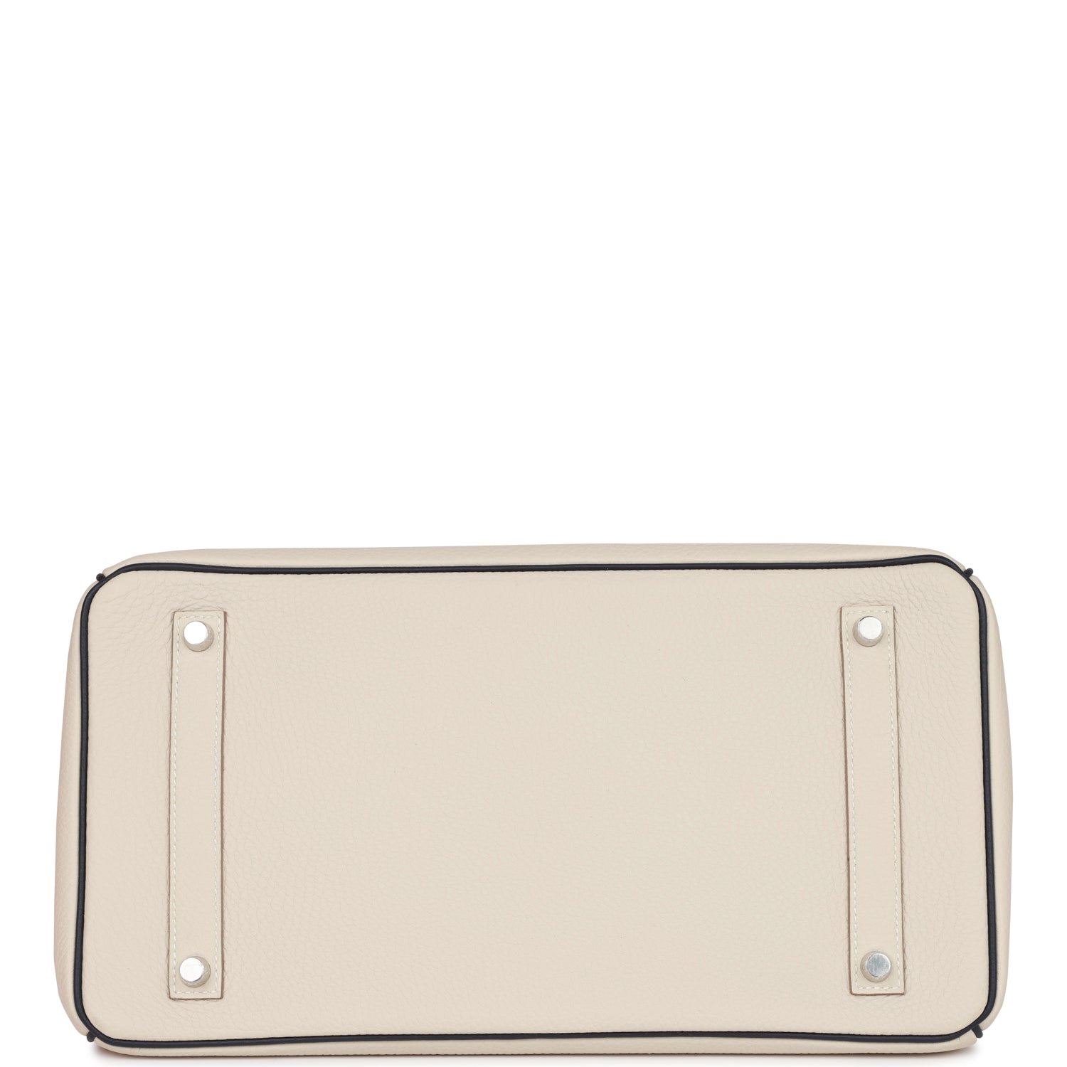 This Special Order Birkin is in Craie and Bleu Nuit togo leather with palladium hardware and has tonal stitching, front flap, two straps with center toggle closure, clochette with lock and two keys, and double rolled handles.