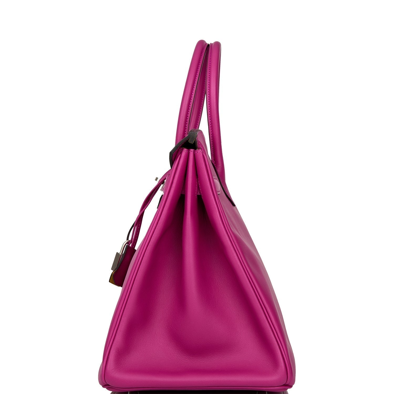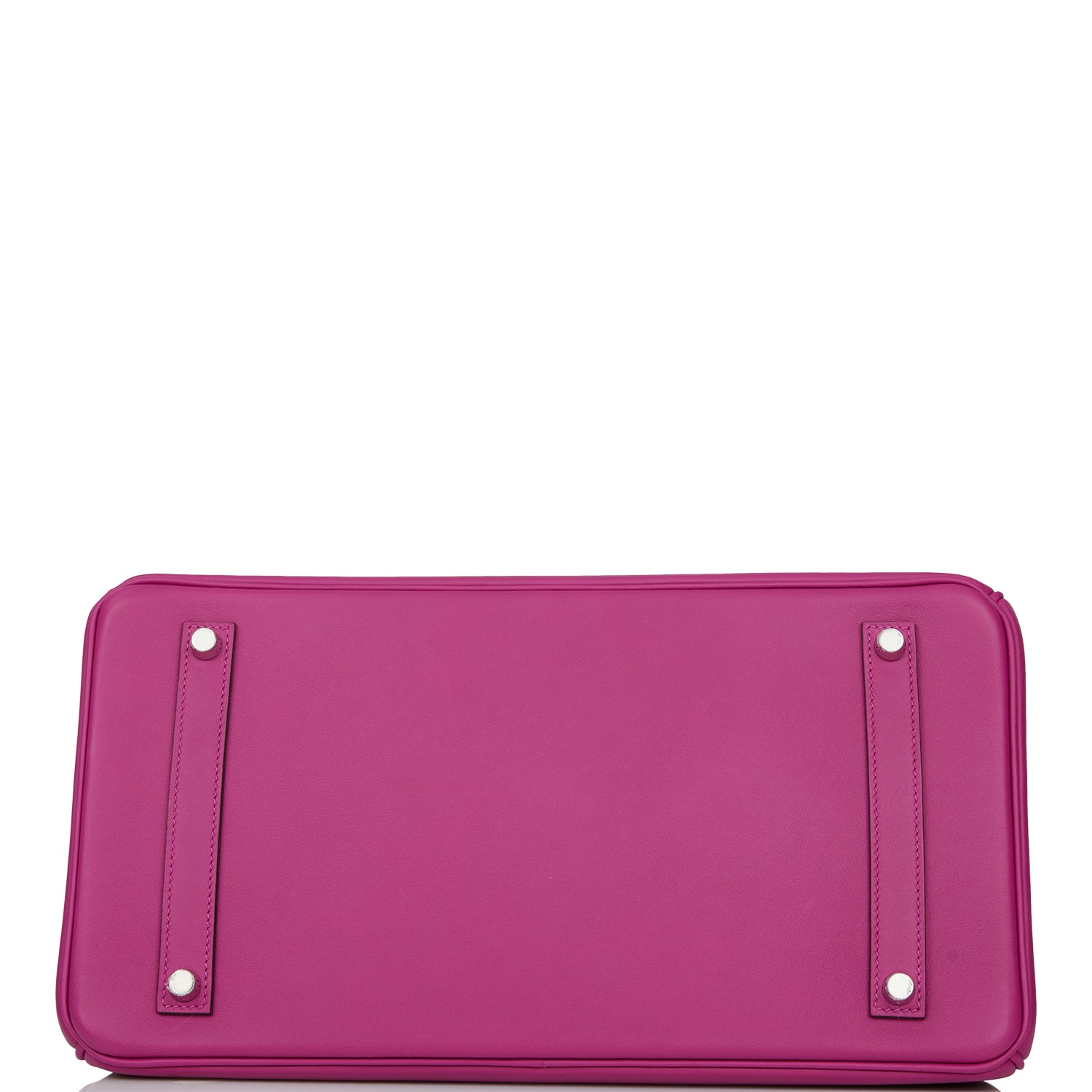 This Special Order Birkin is in Rose Pourpre swift leather with brushed palladium hardware and has tonal stitching, front flap, two straps with center toggle closure, clochette with lock and two keys, and double rolled handles.