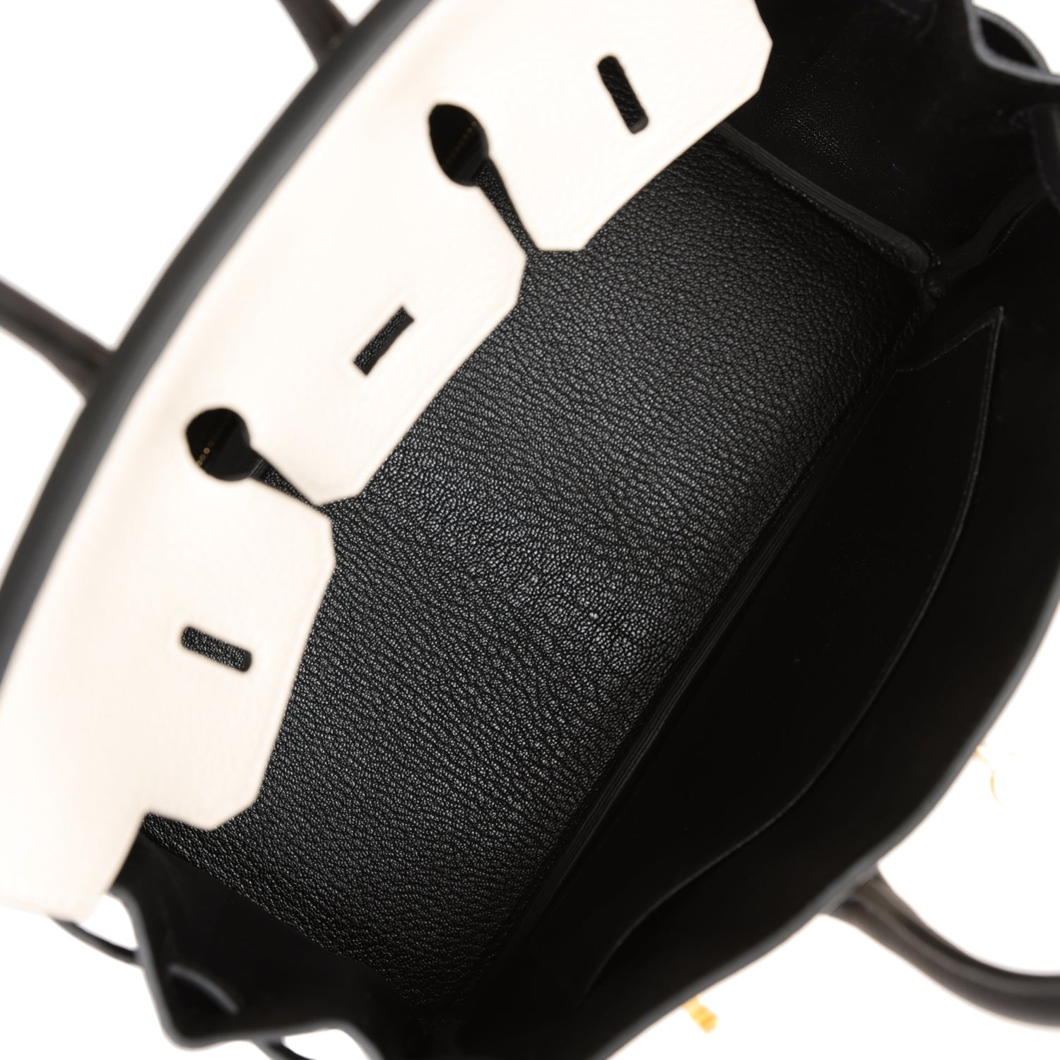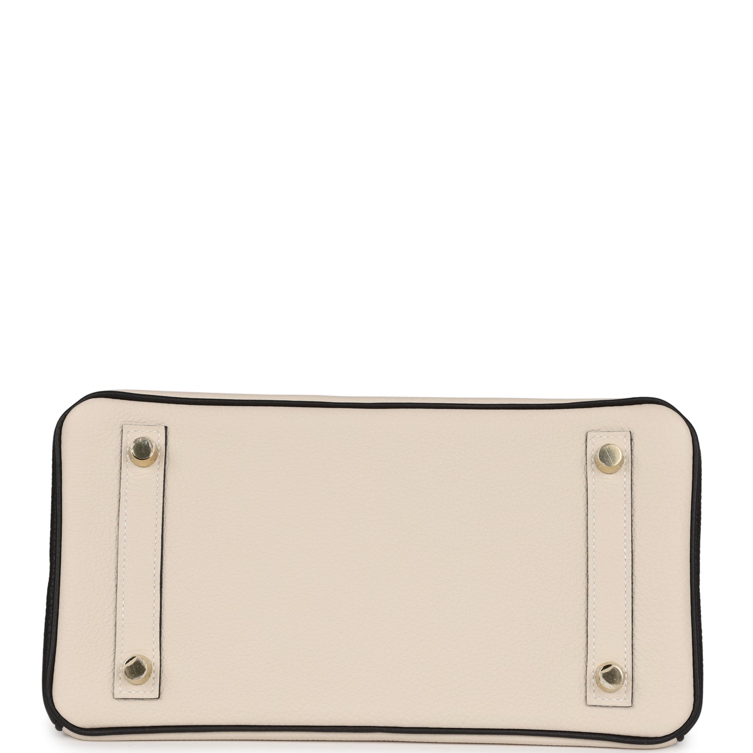 This Special Order Birkin is in Craie and Black togo leather with brushed gold hardware and has tonal stitching, front flap, two straps with center toggle closure, clochette with lock and two keys, and double rolled handles.