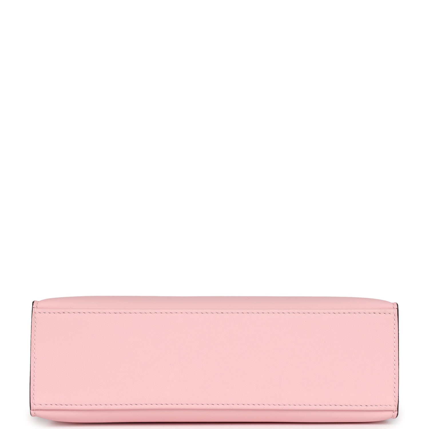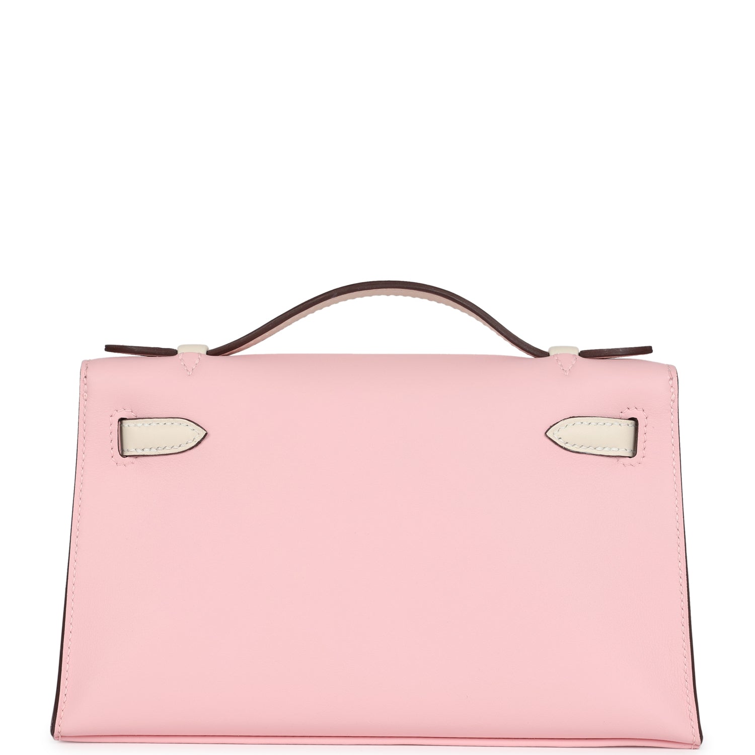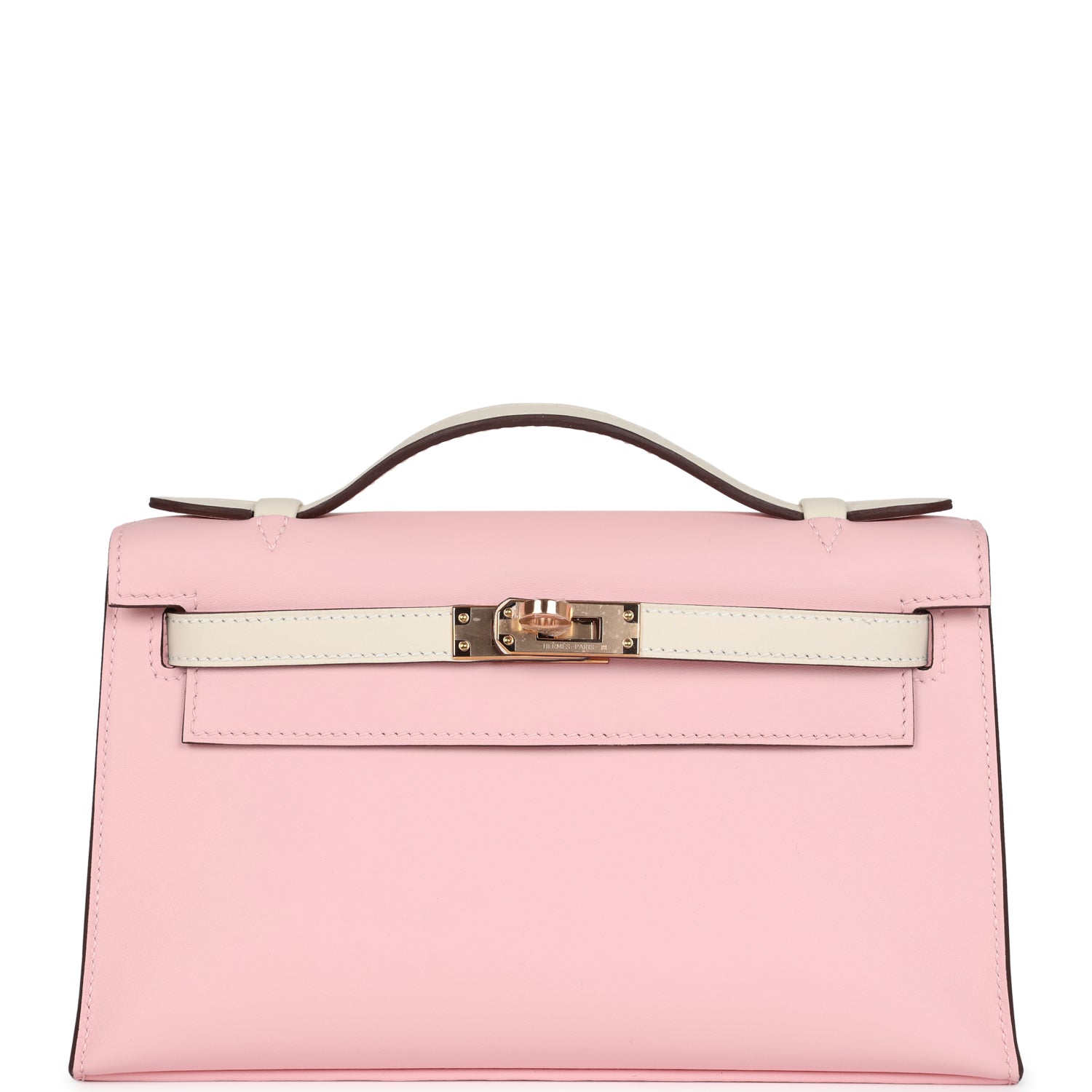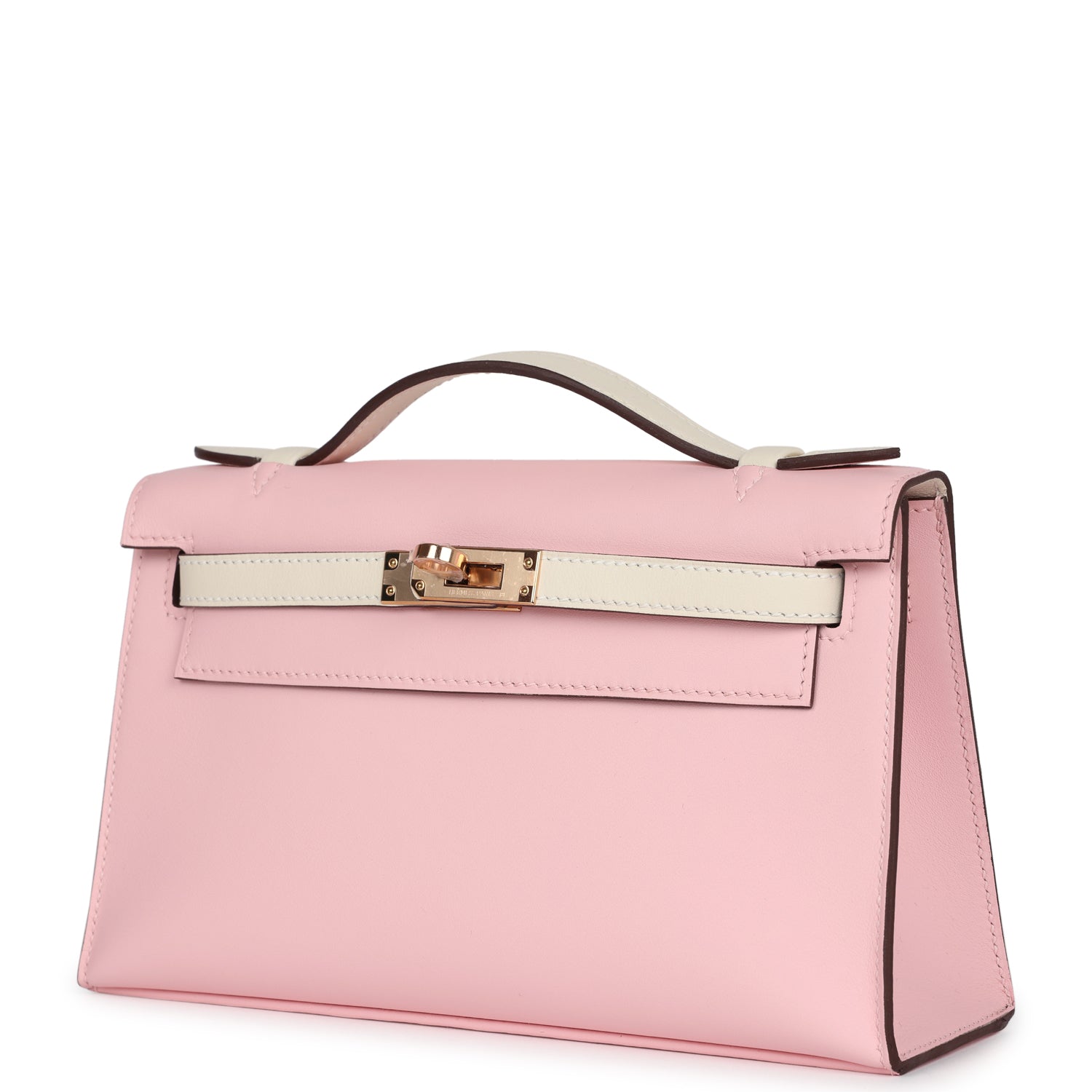 Special Order Kelly Pochette is in Rose Sakura and Nata swift leather with rose gold hardware and has tonal stitching, front flap, two straps with center toggle closure and a top flat handle.
