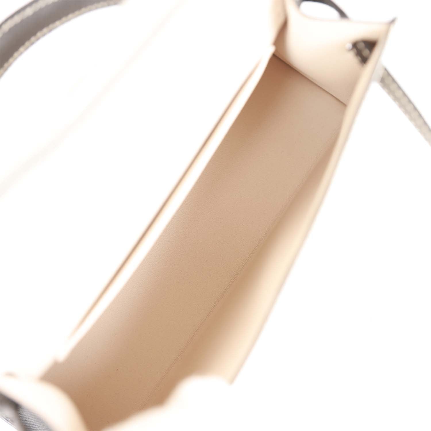This tiny Horseshoe Stamp Kelly, in the Sellier style, is in Craie and Black epsom leather with gold hardware and has contrast stitching, two front straps with front toggle closure, single rolled handle and removable shoulder strap.
