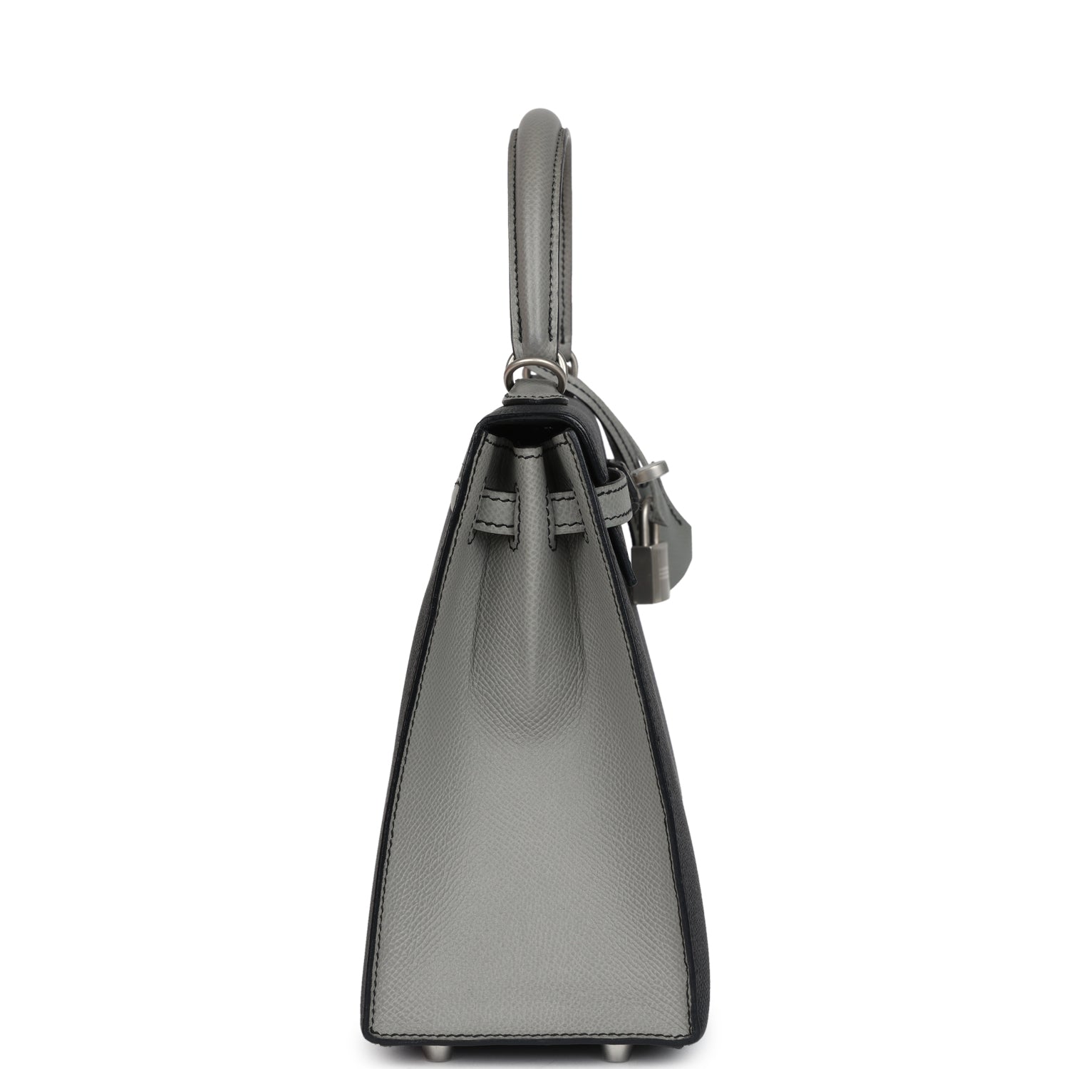 Hermes Special Order (HSS) Kelly Sellier 25 Black and Gris Mouette Epsom Brushed Gold Hardware
