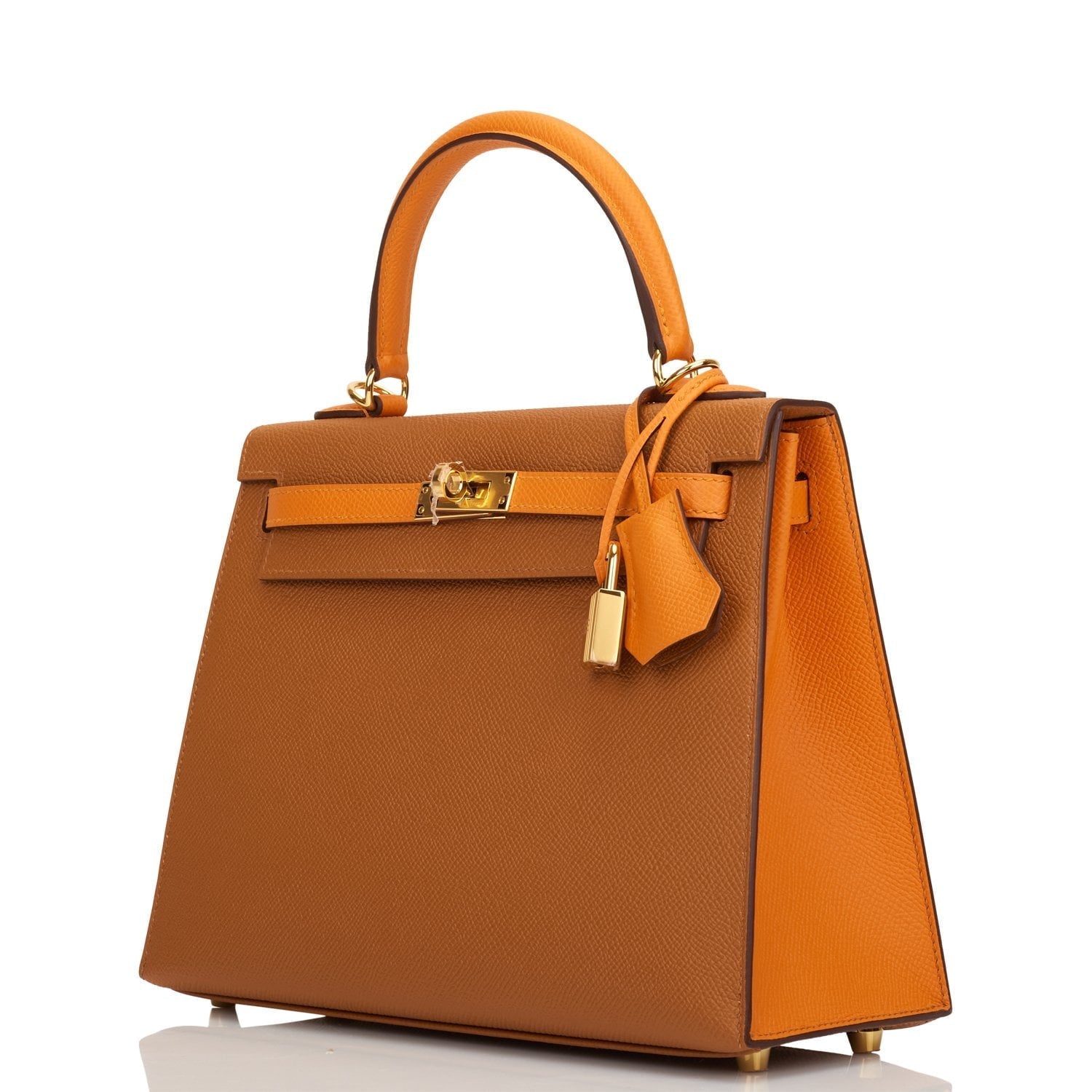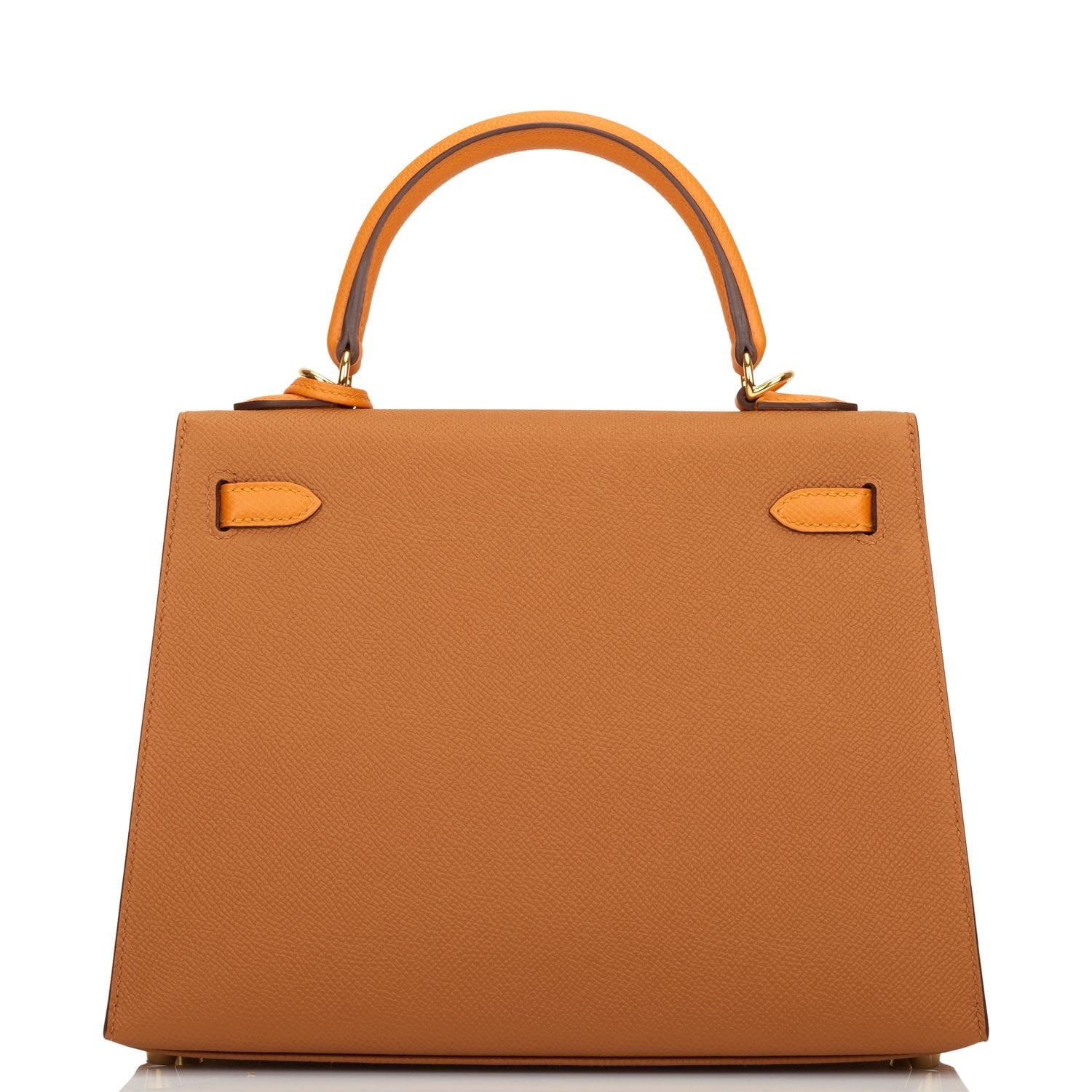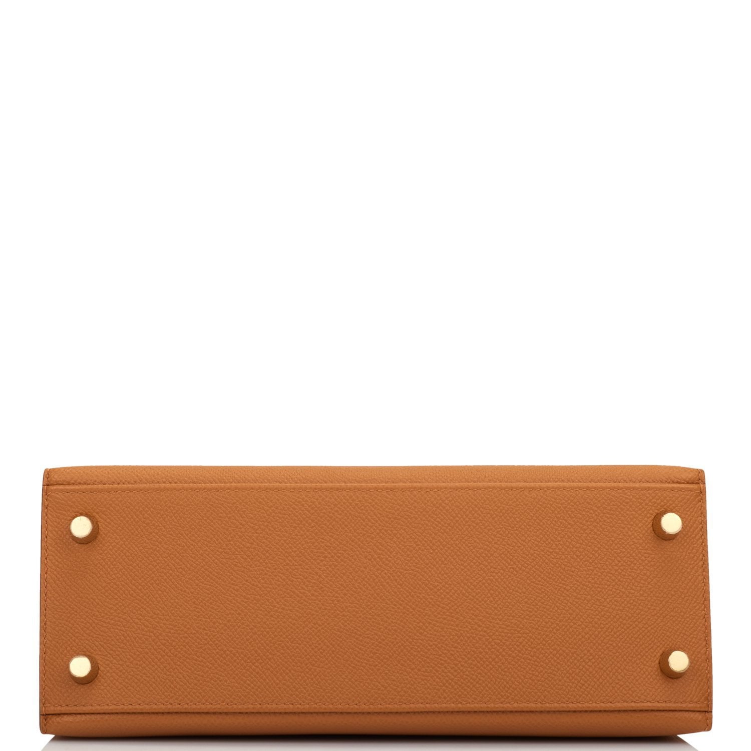 Special Order Kelly, in the Sellier style, is in Gold and Apricot epsom leather with brushed gold hardware and has tonal stitching, two straps with front toggle closure, clochette with lock and two keys, single rolled handle and removable shoulder strap.