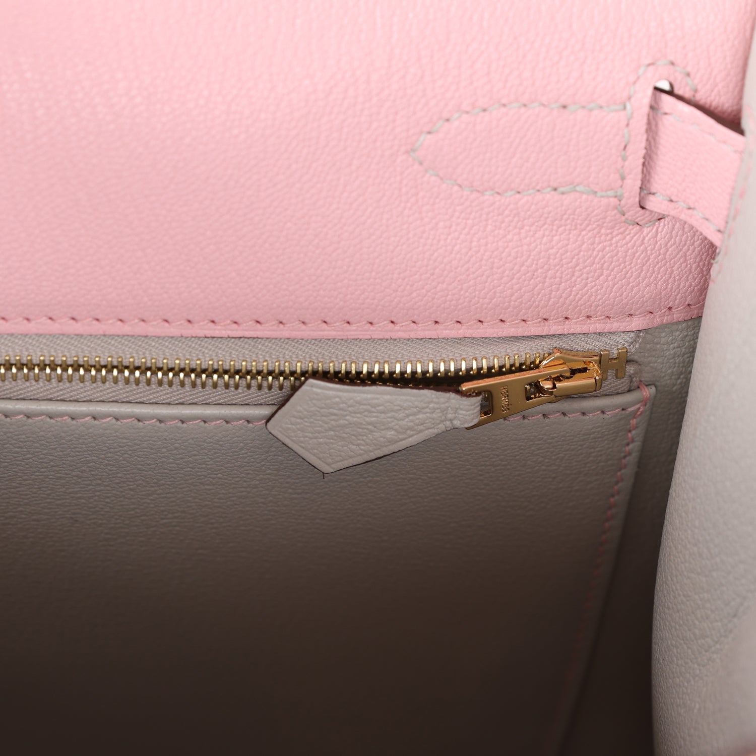 Special Order Kelly, in the Sellier style, is in Rose Sakura chevre leather with brushed gold hardware and has Gris Perle stitching, front flap, two straps with center toggle closure, clochette with lock and two keys, single rolled handle and removable shoulder strap.