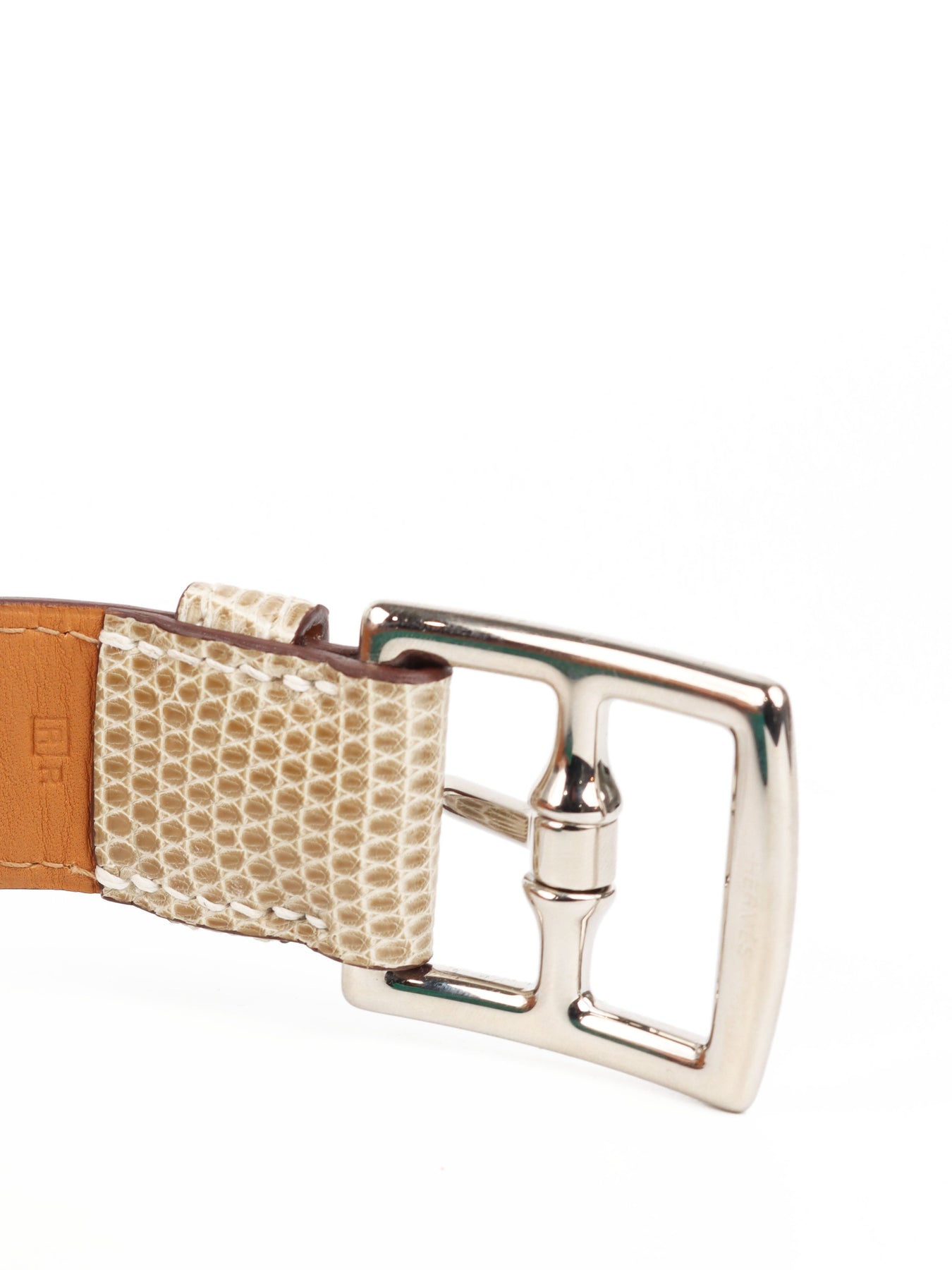 Description : This cool lizard leather belt-bracelet comes in a gorgeous light taupe, finished in palladium-tone hardware. In excellent condition; minor signs of wear.