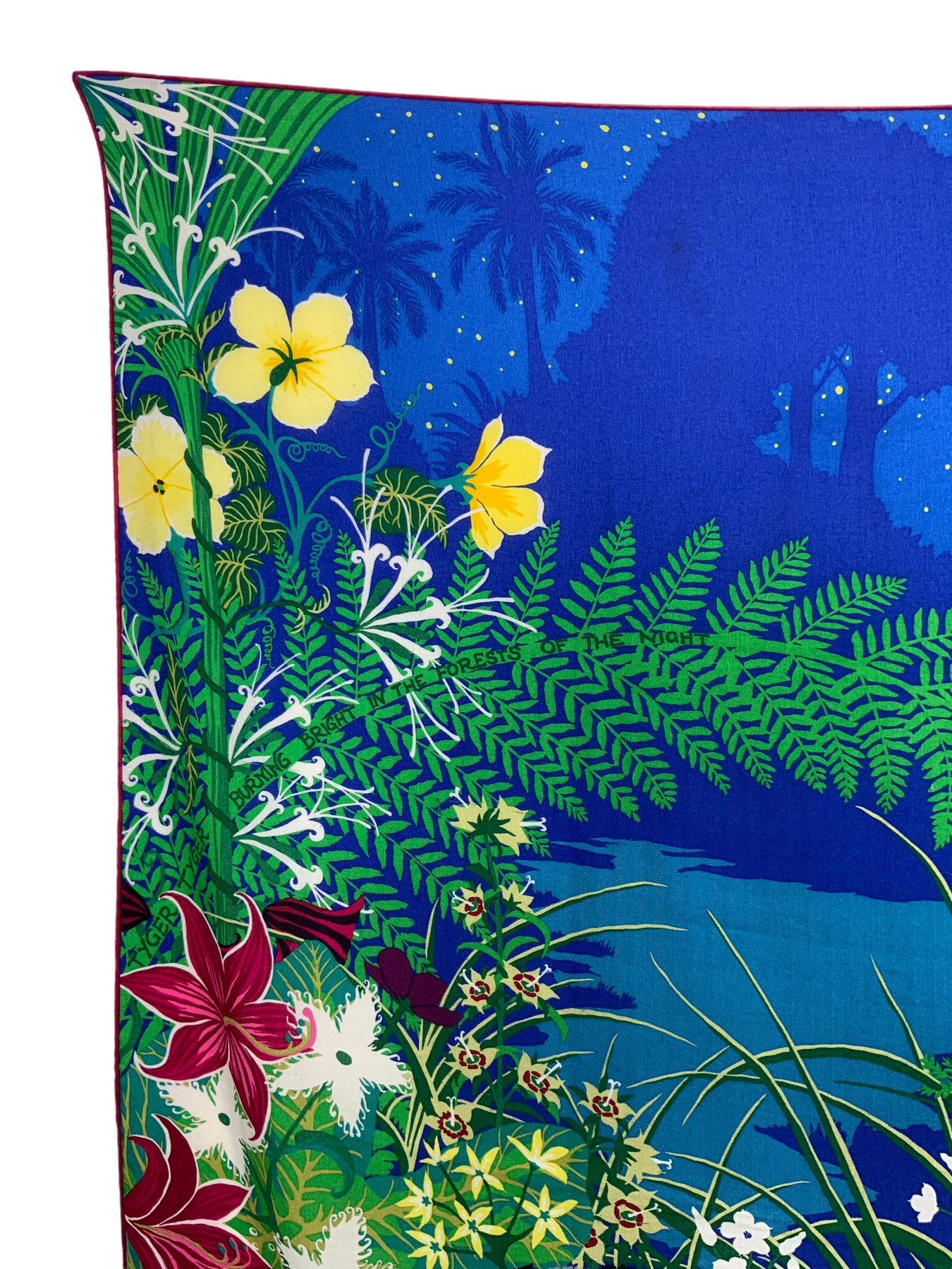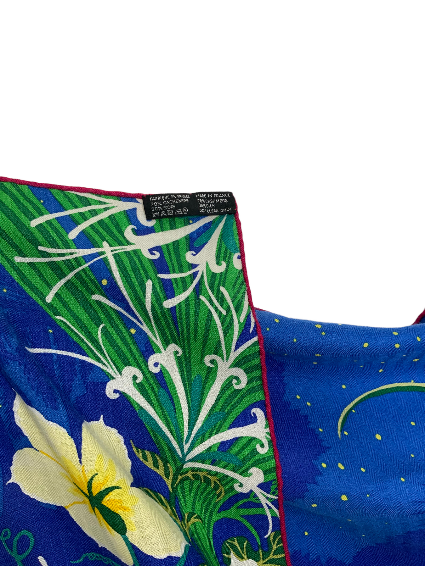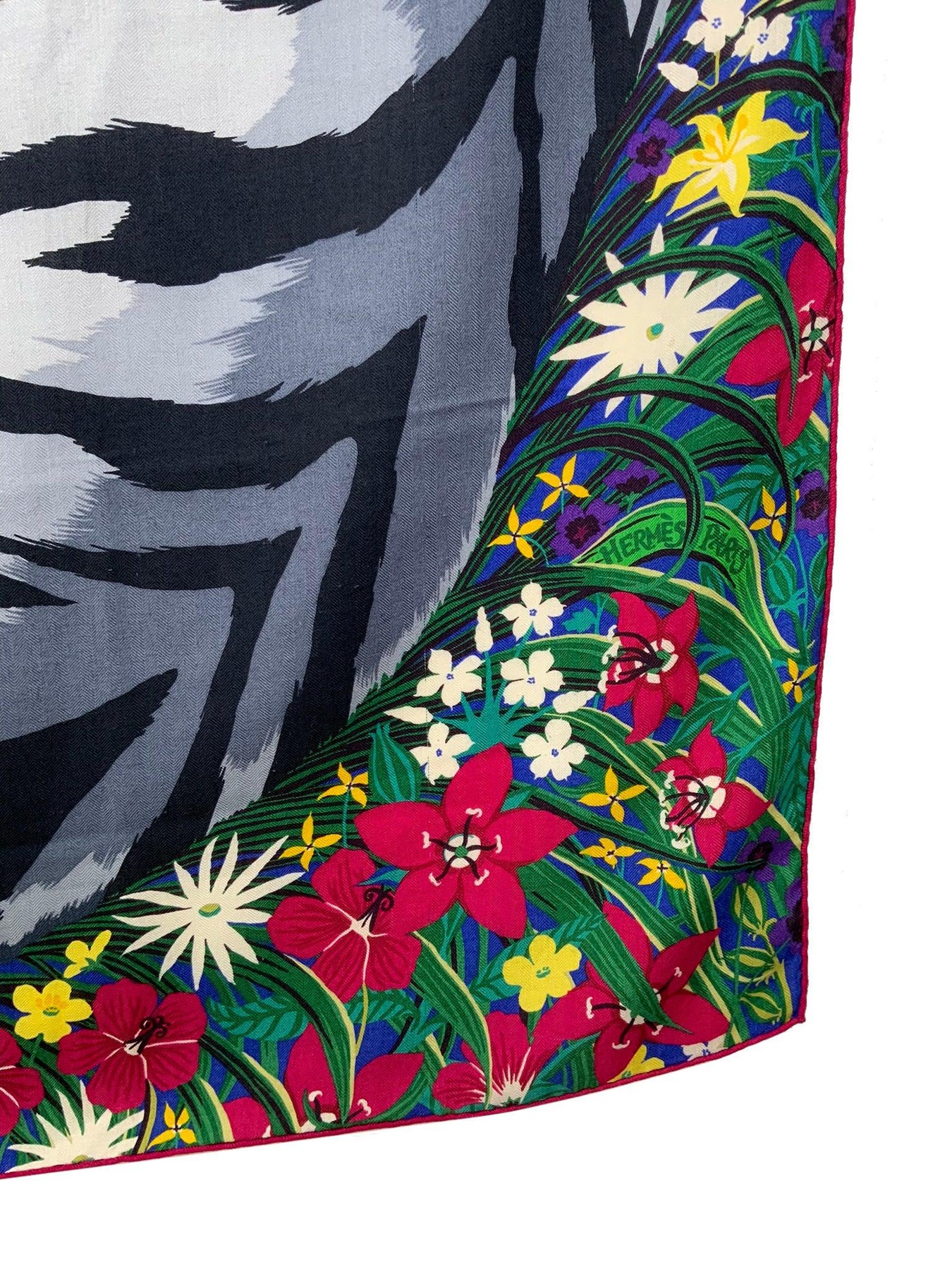 We the ity of this HERMES Tyger Tyger Cashmere Silk Shawl Scarf 140 designed by Alice Sherley which depicts a large tiger motif in a tropical setting with fuchsia hand-rolled edges.