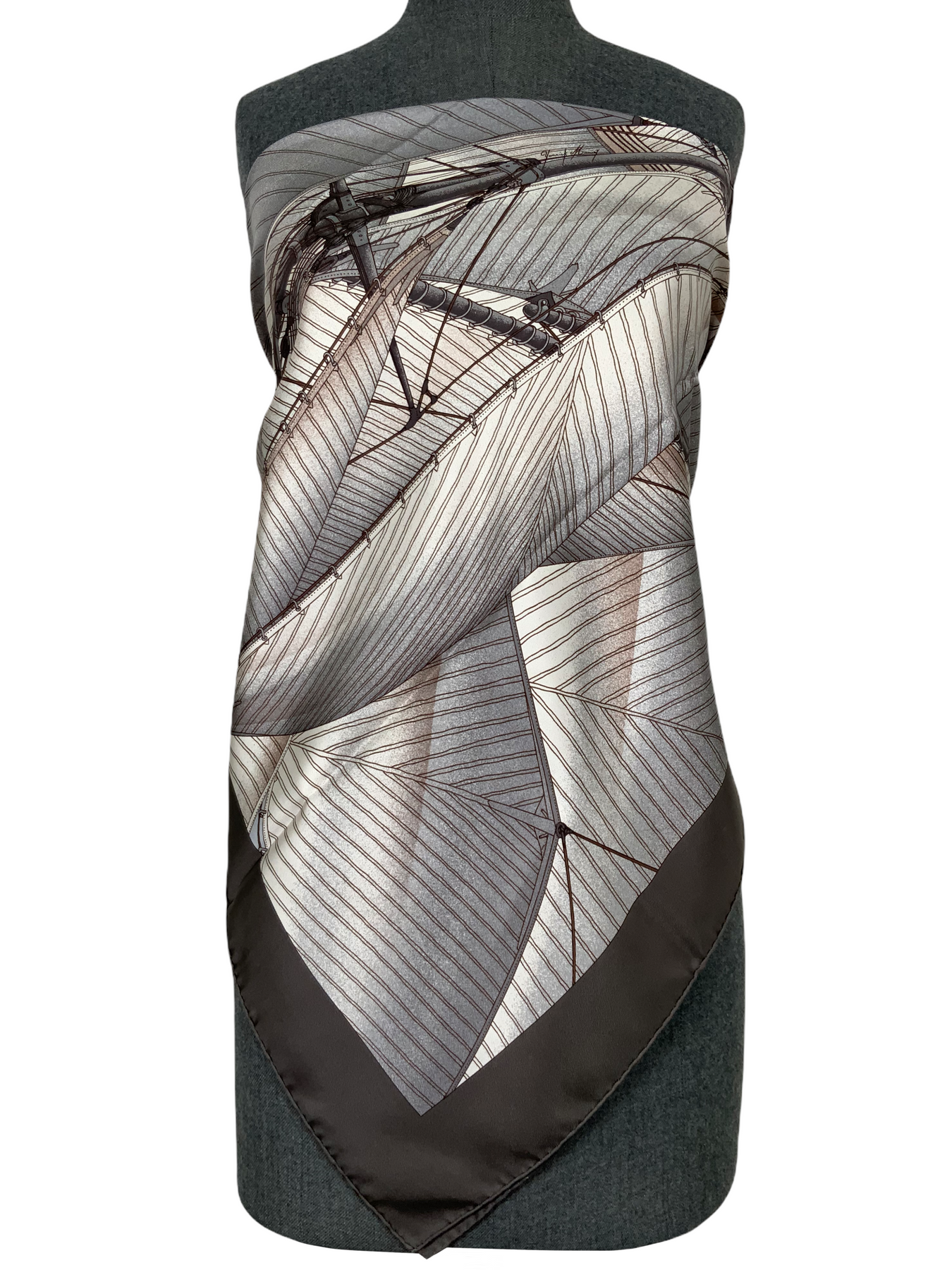 We the ity of this chic Hermes Vent Portant II Silk Scarf 90 designed by Yannick Manier and was first issued in 1988. This scarf shows a beautiful sailboat graphic design in hues of gray.